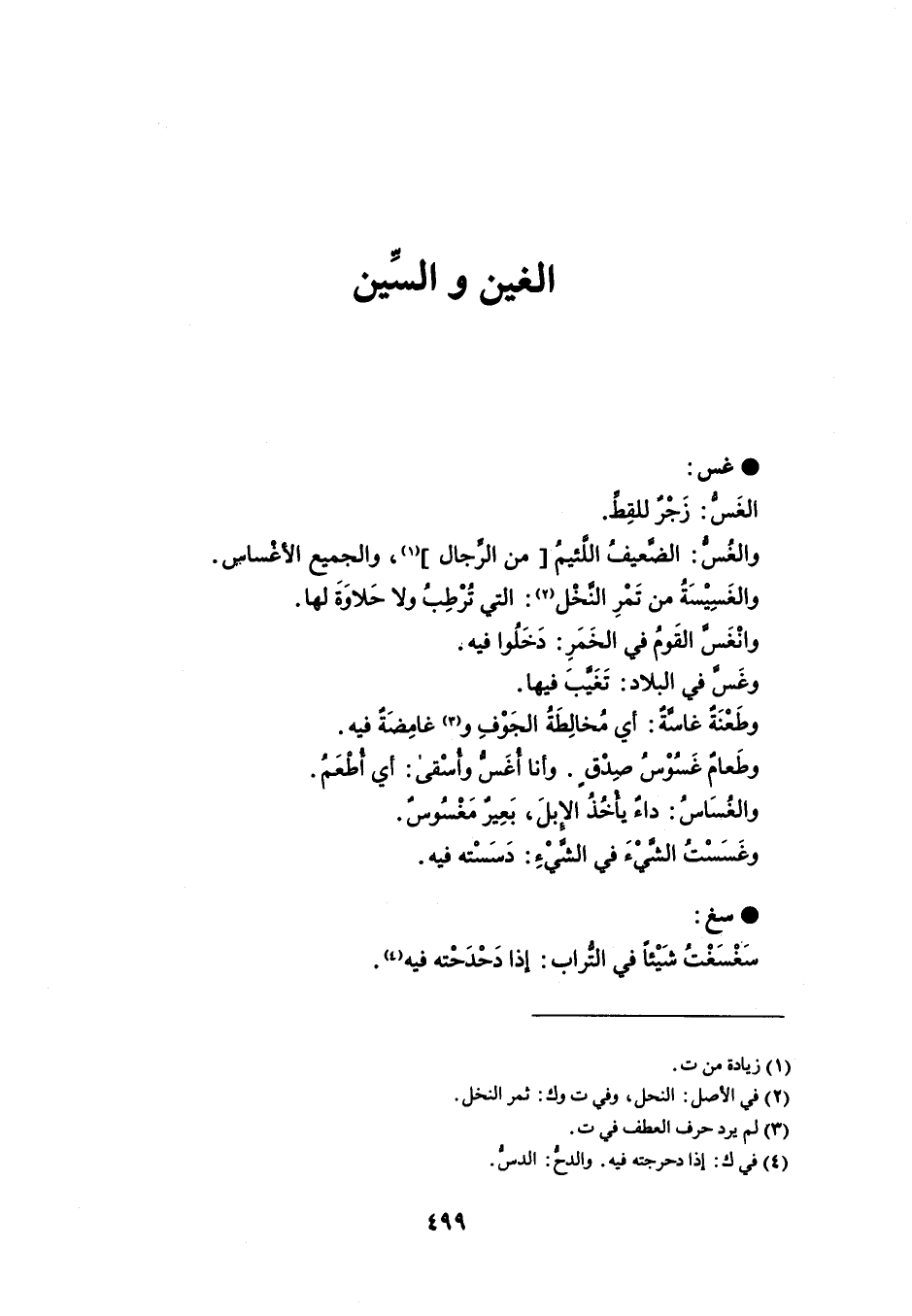 غس الغَسُّ : زَجْرٌ للقِطِّ . والغُسُّ : الضَّعيفُ اللّئيمُ من الرجال ، والجميع الأغْساس . والغَسِيْسَةُ من تَمْرِ النخْل : التي تُرطِبُ ولا حَلاوَةَ لها . وانْغَسَّ القَومُ في الخَمَرِ : دَخَلُوا فيه . وغَسَّ في البلاد : تَغَيَّبَ فيها . وطَعْنَةٌ غاسَّةٌ : أي مُخالِطَةُ الجَوْفِ وغامِضَةٌ فيه . وطَعامٌ غَسُوْسُ صِدْقٍ . وأنا أُغَسُّ وأُسْقى : أي أُطْعَمُ . والغُسَاسُ : داءٌ يأْخُذُ الإبلَ ، بَعِيرٌ مَغْسُوسَ . وغَسَسْتُ الشَّيْء في الشَّيْءِ : دَسَسْته فيه . سغ سَغْسَغْتُ شَيْئاً في التُّراب : إذا دَحْدَحْته فيه .