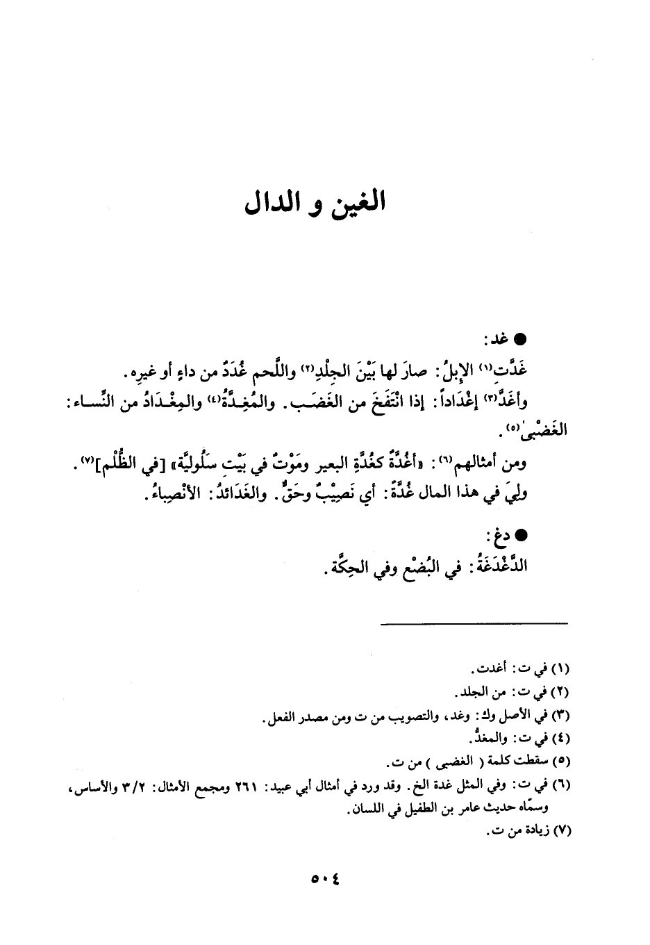 غد غَدَّتِ الإِبلُ : صارَ لها بَيْنَ الجِلْدِ واللَّحم غُدَدٌ من داءٍ أو غيرِه . وأغَدَّ إغدَاداً : إذا انْتَفَخَ من الغَضَب . والمُغِدَّة والمِغْدَادُ من النساء : الغَضْبى . ومن أمثالهم : ' أغُدَةٌ كغُدَّةِ البعير ومَوْتٌ في بَيْتِ سَلُوليَّة في الظُّلْم . وليَ في هذا المال غُدَّةٌ : أي نَصِيْبٌ وحَقٌ . والغَدَائدُ : الأنْصِباءُ . دغ الدَّغدَغَةُ : في البُضْع وفي الحِكة .