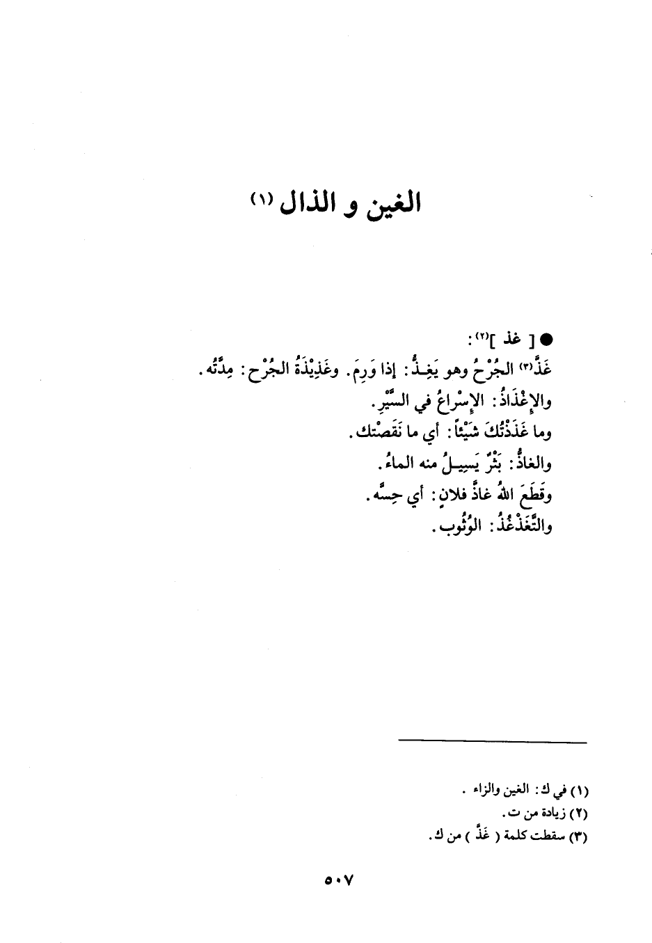 غذ غَذَّ الجُرْحُ وهو يَغِذُّ : إذا وَرِمَ . وغَذِيْذَةُ الجُرْحٍ : مِدَّتُه . والإِغْذَاذُ : الإِسْراعُ في السَّيْرِ . وما غَذَذْتُكَ شَيْئاً : أي ما نَقَصْتك . والغاذُّ : بَثْرٌ يَسِيلُ منه الماءُ . وقَطَعَ اللهُ غاذَّ فلانٍ : أي حِسَّه . والتَّغَذْغُذُ : الوُثُوب . ؟