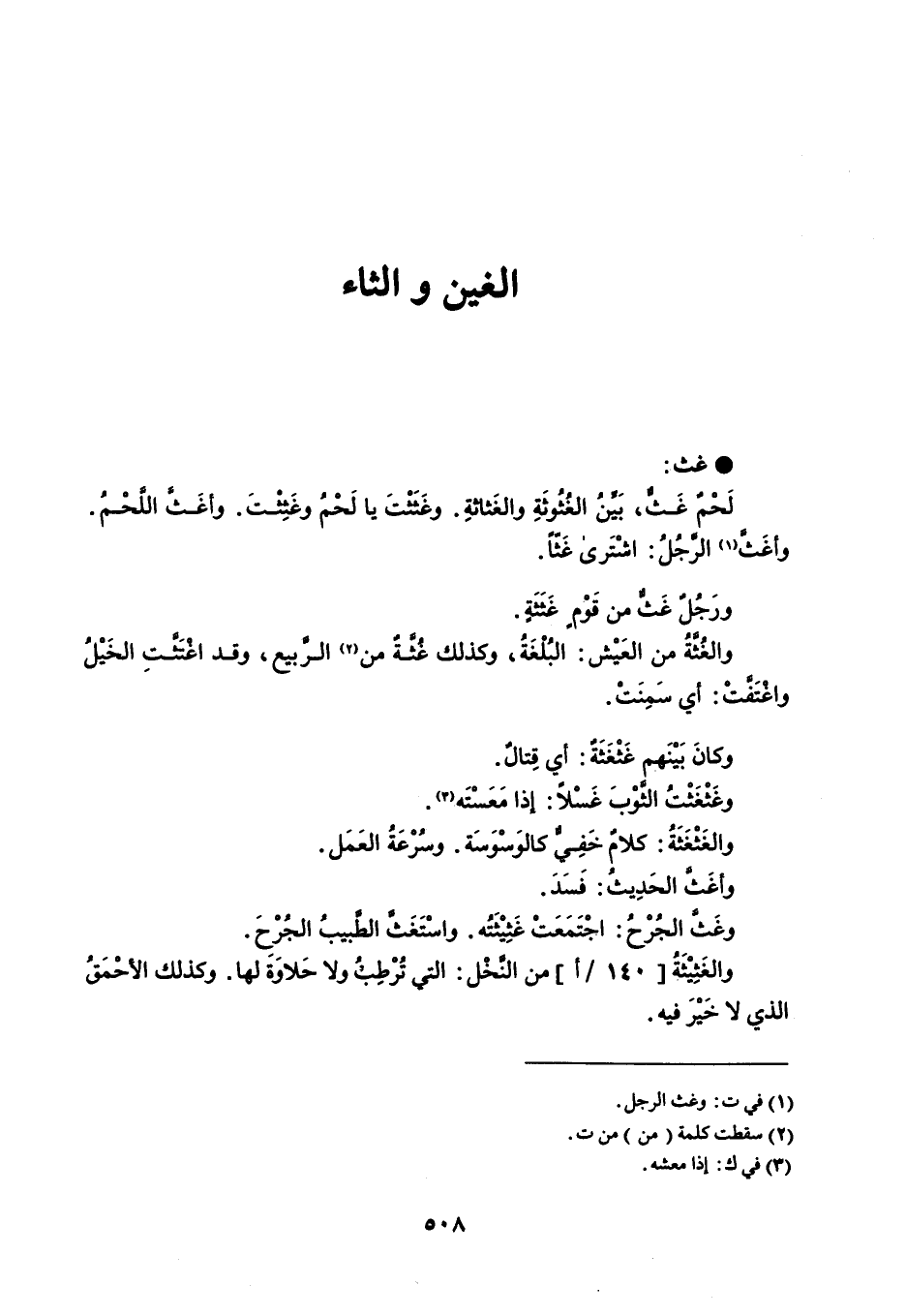 غث لَحْمٌ غَثٌّ ، بَيِّنُ الغُثُوثَةِ والغَثاثةِ . وغَثَثْتَ يا لَحْمُ وغَثِثْتَ . وأغَثَّ اللَّحْمُ . وأغَثَّ الرجُل : اشْتَرى غَثاً . ورَجُلٌ غَثٌّ قَوْمٍ غَثَثَةٍ . والغُثَّةُ من العَيْش : ً البُلْغَةُ ، وكذلك غُثَّةٌ من الربيع ، وقد اغْتَثَّتِ الخَيْلُ واغتَفتْ : أي سَمِنَتْ . وكانَ بَيْنَهم غَثْغَثَةٌ : أي قِتالٌ . وغَثْغَثْتُ الثوْبَ غَسْلاً : إذا مَعَسْتَه . والغَثْغَثَةُ : كلامٌ خَفِيٌّ كالوَسْوَسَة . وسُرْعَةُ العَمَل . وأغَثَّ الحَدِيثُ : فَسَدَ . وغَثَّ الجُرْحُ : اجْتَمَعَتْ غَثِيْثَتُه . واسْتَغَثَّ الطَّبيبُ الجُرْحِ . والغَثِيْثَةُ من النَّخل : التط تُرطِبُ ولا حَلاوَة لها . وكذلك الأحْمَقُ الذي لا خَيْرَ فيه .