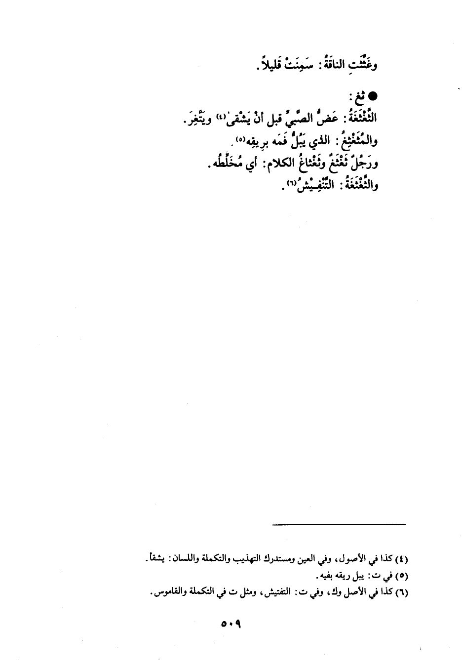 وغَثَّثَتِ الناقَةُ : سَمِنَتْ قَليلاً . ثغ الثَّغْثَغَةُ : عَضُّ الصَّبيِّ قبل أن يَشْقى ويَتَّغِرَ . والمُثَغْثِغُ : الذي يَبُلْ فمَه برِيقِه . ورَجُل ثَغْثَغٌ وثَغْثاغُ الكلام : أي مُخَلِّطُه . والثغْثَغَةُ : التنْفِيشُ .