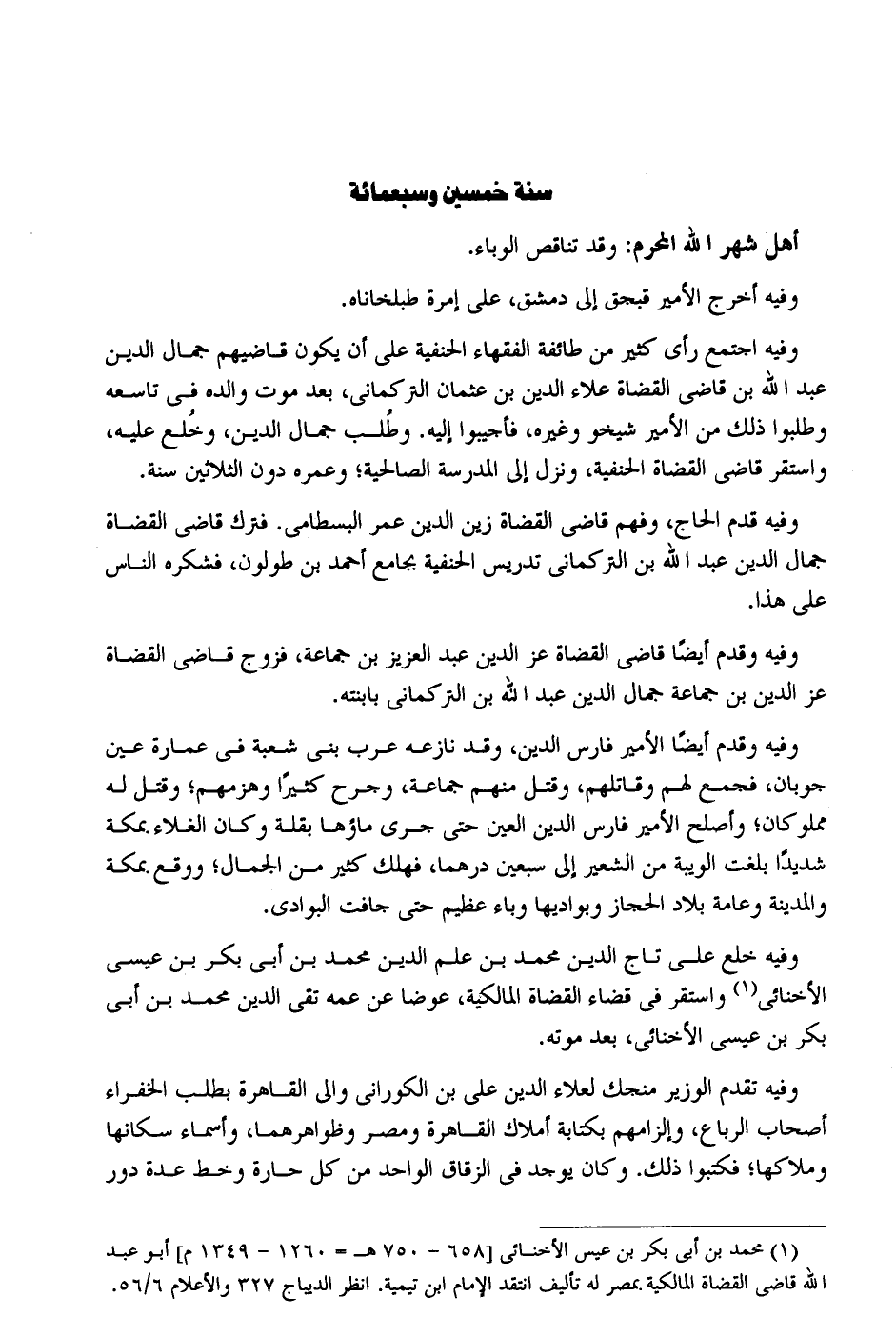 أهل شهر الله الْمحرم: وَقد تناقص الوباء. وَفِيه أخرج الْأَمِير قبجق إِلَى دمشق على إمرة طبلخاناه. وَفِيه اجْتمع رَأْي كثير من طَائِفَة الْفُقَهَاء الْحَنَفِيَّة على أَن يكون قاضيهم جمال الدّين عبد الله بن قَاضِي الْقُضَاة عَلَاء الدّين بن عُثْمَان التركماني بعد موت وَالِده فِي تاسعه وطلبوا ذَلِك من الْأَمِير شيخو وَغَيره فأجيبوا إِلَيْهِ. وَطلب جمال الدّين وخلع عَلَيْهِ وَاسْتقر قَاضِي الْقُضَاة الْحَنَفِيَّة وَنزل إِلَى الْمدرسَة الصالحية وعمره دون الثَّلَاثِينَ سنة. وَفِيه قدم الْحَاج وَفهم قَاضِي الْقُضَاة زين الدّين عمر البسطامي. فَترك قَاضِي الْقُضَاة جمال الدّين عبد الله بن التركماني تدريس الْحَنَفِيَّة بِجَامِع أَحْمد بن طولون فشكره النَّاس على هَذَا. وَفِيه وَقدم أَيْضا قَاضِي الْقُضَاة عز الدّين عبد الْعَزِيز بن جمَاعَة فزوج قاضى الْقُضَاة عز الدّين بن جمَاعَة جمال الدّين عبد الله بن التركماني بابنته. وَفِيه وَقدم أَيْضا الْأَمِير فَارس الدّين وَقد نازعه عرب بني شُعْبَة فِي عمَارَة عين جوبان فَجمع لَهُم وَقَاتلهمْ وَقتل مِنْهُم جمَاعَة وجرح كثيرا وَهَزَمَهُمْ وَقتل لَهُ مملوكان وَأصْلح الْأَمِير فَارس الدّين الْعين حَتَّى جرى مَاؤُهَا بقلة وَكَانَ الغلاء. بِمَكَّة شَدِيدا بلغت الويبة من الشّعير إِلَى سبعين درهما فَهَلَك كثير من الْجمال وَوَقع. بِمَكَّة وَالْمَدينَة وَعَامة بِلَاد الْحجاز وبواديها وباء عَظِيم حَتَّى جافت الْبَوَادِي. وَفِيه خلع على تَاج الدّين مُحَمَّد بن علم الدّين مُحَمَّد بن أبي بكر بن عِيسَى الأخنائي وَاسْتقر فِي قَضَاء الْقُضَاة الْمَالِكِيَّة عوضا عَن عَمه تَقِيّ الدّين مُحَمَّد بن أبي بكر بن عِيسَى الأخنائي بعد مَوته. وَفِيه تقدم الْوَزير منجك لعلاء الدّين عَليّ بن الكوراني وَالِي الْقَاهِرَة بِطَلَب الخفراء أَصْحَاب الرباع وإلزامهم بِكِتَابَة أَمْلَاك الْقَاهِرَة ومصر وظواهرهما وَأَسْمَاء سكانها وملاكها فَكَتَبُوا ذَلِك. وَكَانَ يُوجد فِي الزقاق الْوَاحِد من كل حارة وَخط عدَّة دور