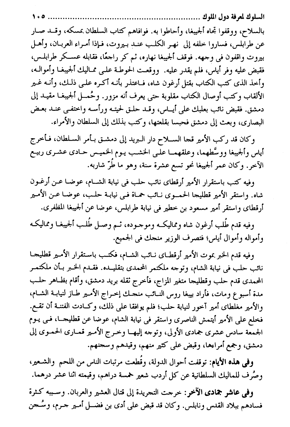 بِالسِّلَاحِ ووقفوا تجاه ألجيبغا وَأَحَاطُوا بِهِ. فوافاهم كتاب السُّلْطَان بمسكه وَقد صَار عَن طرابلس فَسَارُوا خَلفه إِلَى نهر الْكَلْب عِنْد بيروت فَإِذا أُمَرَاء العربان وَأهل بيروت واقفون فِي وَجهه. فَوقف ألجيبغا نَهَاره ثمَّ كرّ رَاجعا فقابله عَسْكَر طرابلس فَقبض عَلَيْهِ وفر أياس فَلم يقدر عَلَيْهِ. وَوَقعت الحوطة على مماليك ألجيبغا وأمواله وَأخذ الَّذِي كتب الْكتاب بقتل أرغون شاه فَاعْتَذر بِأَنَّهُ أكره على ذَلِك وَأَنه غير الألقاب وَكتب أوصال الْكتاب مَقْلُوبَة حَتَّى يعرف أَنه مزور. وَحمل ألجيبغا مُقَيّد إِلَى دمشق. فَقبض نَائِب بعلبك على أياس وَقد حلق لحيته وَرَأسه واختفي عِنْد بعض البصارى وَبعث إِلَى دمشق فحبسا بقلعتها وَكتب بذلك إِلَى السُّلْطَان والأمراء. وَكَانَ قد ركب الْأَمِير قجا السِّلَاح دَار الْبَرِيد إِلَى دمشق بِأَمْر السُّلْطَان فَأخْرج أياس وألجيبغا ووسطهما وعلقهما على الْخشب يَوْم الْخَمِيس حادي عشري ربيع الآخر. وَكَانَ عمر ألجيبغا نَحْو تسع عشرَة سنة وَهُوَ مَا طر شَاربه. وَفِيه كتب باستقرار الْأَمِير أرقطاى نَائِب حلب فِي نِيَابَة الشَّام عوضا عَن أرغون شاه. وَاسْتقر الْأَمِير قطليجا الْحَمَوِيّ نَائِب حماة فِي نِيَابَة حلب عوضا عَن الْأَمِير أرقطاى وَاسْتقر أَمِير مَسْعُود بن خطير فِي نِيَابَة طرابلس عوضا عَن ألجيبغا المظفري. وَفِيه قدم طلب أرغون شاه ومماليكه وموجوده ثمَّ وصل طلب ألجيبغا ومماليكه وأمواله وأموال أياس فتصرف الْوَزير منجك فِي الْجَمِيع. وَفِيه قدم الْخَبَر. بِمَوْت الْأَمِير أرقطاي نَائِب الشَّام فَكتب باستقرار الْأَمِير قطليجا نَائِب حلب فِي نِيَابَة الشَّام وَتوجه ملكتمر المحمدي بتقليده. فَقدم الْخَبَر بِأَن ملكتمر المحمدي قدم حلب وقطليجا متغير المزاج فَأخْرج ثقله بريد دمشق وَأقَام بِظَاهِر حلب مُدَّة أُسْبُوع وَمَات فَأَرَادَ بيبغا روس النَّائِب منجك إِخْرَاج الْأَمِير طاز لنيابة الشَّام والأمير مغلطاي أَمِير آخور لنيابة حلب فَلم يوافقا على ذَلِك وكادت الْفِتْنَة أَن تقع. فَخلع على الْأَمِير أيتمش الناصري وَاسْتقر فِي نِيَابَة الشَّام عوضا عَن قطليجا فِي يَوْم الْجُمُعَة سادس عشرى جُمَادَى الأولى وَتوجه إِلَيْهَا وَخرج الْأَمِير قماري الْحَمَوِيّ إِلَى دمشق وَجمع أمراءها وَقبض على كثير مِنْهُم وقيدهم وسجنهم. وَفِي هَذِه الْأَيَّام: توقفت أَحْوَال الدولة وَقطعت مرتبات النَّاس من اللَّحْم وَالشعِير وَصرف للماليك السُّلْطَانِيَّة عَن كل أردب شعير خَمْسَة دَرَاهِم وَقِيمَته اثْنَا عشر درهما.