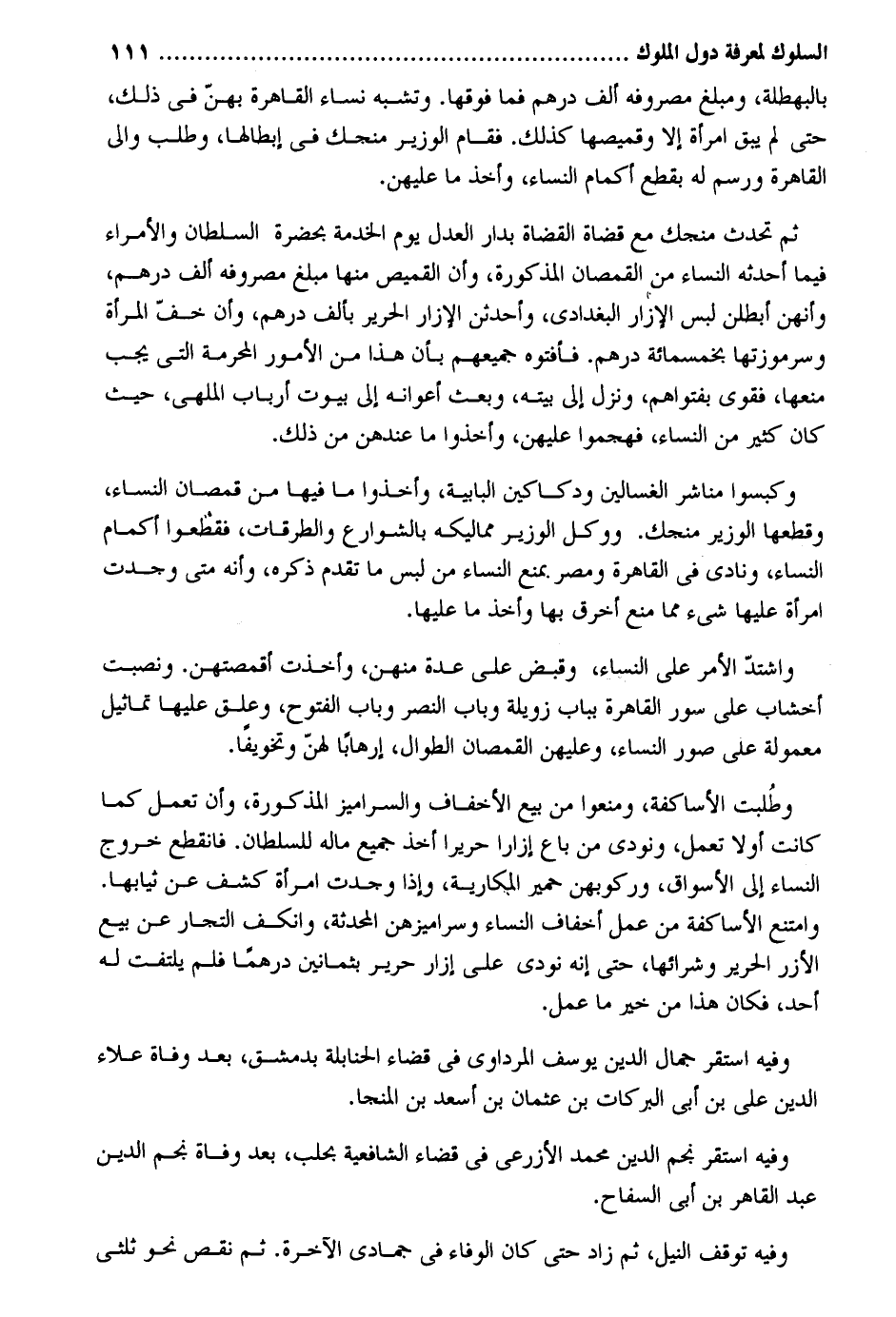 بالبهطلة ومبلغ مصروفه ألف دِرْهَم فَمَا فَوْقهَا. وتشبه نسَاء الْقَاهِرَة بِهن فِي ذَلِك حَتَّى لم يبْق امْرَأَة إِلَّا وقميصها كَذَلِك. فَقَامَ الْوَزير منجك فِي إِبْطَالهَا وَطلب وَالِي الْقَاهِرَة ورسم لَهُ بِقطع أكمام النِّسَاء وَأخذ مَا عَلَيْهِنَّ. ثمَّ تحدث منجك مَعَ قُضَاة الْقُضَاة بدار الْعدْل يَوْم الْخدمَة بِحَضْرَة السُّلْطَان والأمراء فِيمَا أحدثه النِّسَاء من القمصان الْمَذْكُورَة وَأَن الْقَمِيص مِنْهَا مبلغ مصروفه ألف دِرْهَم وأنهن أبطلن لبس الْإِزَار الْبَغْدَادِيّ وأحدثن الْإِزَار الْحَرِير بِأَلف دِرْهَم وَأَن خف الْمَرْأَة وسرموزتها بِخَمْسِمِائَة دِرْهَم. فأفتوه جَمِيعهم بِأَن هَذَا من الْأُمُور الْمُحرمَة الَّتِى يجب منعهَا فقوى بفتواهم وَنزل إِلَى بَيته وَبعث أعوانه إِلَى بيُوت أَرْبَاب الملهى حَيْثُ كَانَ كثير من النِّسَاء فَهَجَمُوا عَلَيْهِنَّ وَأخذُوا مَا عِنْدهن من ذَلِك. وكبسوا مناشر الغسالين ودكاكين البابية وَأخذُوا مَا فِيهَا من قمصان النِّسَاء وقطعها الْوَزير منجك. ووكل الْوَزير مماليكه بالشوارع والطرقات فَقطعُوا أكمام النِّسَاء ونادى فِي الْقَاهِرَة ومصر. بِمَنْع النِّسَاء من لبس مَا تقدم ذكره وَأَنه مَتى وجدت امْرَأَة عَلَيْهَا شىء مِمَّا منع أخرق بهَا وَأخذ مَا عَلَيْهَا. وَاشْتَدَّ الْأَمر على النِّسَاء وَقبض على عدَّة مِنْهُنَّ وَأخذت أقمصتهن. ونصبت أخشاب على سور الْقَاهِرَة بِبَاب زويلة وَبَاب النَّصْر وَبَاب الْفتُوح وعلق عَلَيْهَا تماثيل معمولة على صور النِّسَاء وعليهن القمصان الطوَال ارهابا لَهُنَّ وتخويفا. وَطلبت الأساكفة وَمنعُوا من بيع الأخفاف والسراميز الْمَذْكُورَة وَأَن تعْمل كَمَا كَانَت أَولا تعْمل وَنُودِيَ من بَاعَ إزاراً حَرِيرًا أَخذ جَمِيع مَاله للسُّلْطَان. فَانْقَطع خُرُوج النِّسَاء إِلَى الْأَسْوَاق وركوبهن حمير المكارية وَإِذا وجدت امْرَأَة كشف عَن ثِيَابهَا وَامْتنع الأساكفة من عمل أَخْفَاف النِّسَاء وسراميزهن المحدثة وانكف التُّجَّار عَن بيع الأزر الْحَرِير وشرائها حَتَّى إِنَّه نُودي على وَفِيه اسْتَقر جمال الدّين يُوسُف المرداوي فِي قَضَاء الْحَنَابِلَة بِدِمَشْق بعد وَفَاة عَلَاء الدّين على بن أبي البركات بن عُثْمَان بن أسعد بن المنجا. وَفِيه اسْتَقر نجم الدّين مُحَمَّد الأزرعي فِي قَضَاء الشَّافِعِيَّة بحلب بعد وَفَاة نجم الدّين عبد القاهر بن أبي السفاح. وَفِيه توقف النّيل ثمَّ زَاد حَتَّى كَانَ الْوَفَاء فِي جُمَادَى الْآخِرَة. ثمَّ نقص نَحْو ثُلثي