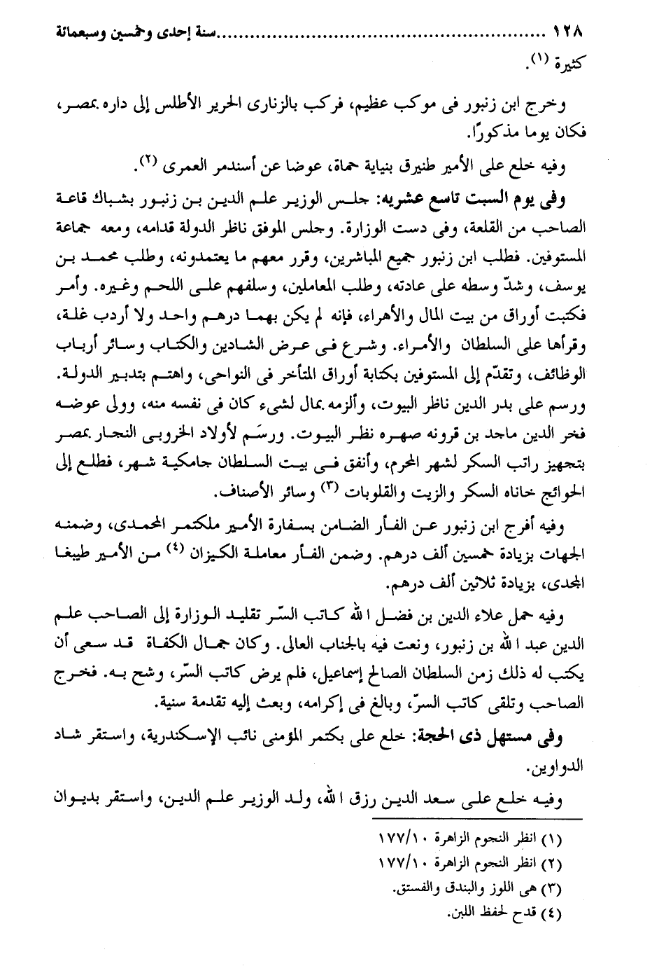 كَثِيرَة وَخرج ابْن زنبور فِي موكب عَظِيم فَركب بالزنارى الْحَرِير الأطلس إِلَى دَاره. بِمصْر فَكَانَ يَوْمًا مَذْكُورا. وَفِيه خلع على الْأَمِير طنيرق بنياية حماة عرضا عَن أسندمر الْعمريّ. وَفِي يَوْم السبت تَاسِع عشريه: جلس الْوَزير علم الدّين بن زنبور بشباك قاعة الصاحب من القلعة وَفِي دست الوزارة. وَجلسَ الْمُوفق نَاظر الدولة قدامه وَمَعَهُ جمَاعَة المستوفين. فَطلب ابْن زنبور جَمِيع المباشرين وَقرر مَعَهم مَا يعتمدونه وَطلب مُحَمَّد بن يُوسُف وَشد وَسطه على عَادَته وَطلب المعاملين وسلفهم على اللَّحْم وَغَيره. وَأمر فَكتبت أوراق من بَيت المَال والأهراء فَإِنَّهُ لم يكن بهما دِرْهَم وَاحِد وَلَا أردب غلَّة وَقرأَهَا على السُّلْطَان والأمراء. وَشرع فِي عرض الشادين وَالْكتاب وَسَائِر أَرْبَاب الْوَظَائِف وَتقدم إِلَى المستوفين بِكِتَابَة أوراق الْمُتَأَخر فِي النواحي واهتم بتدبير الدولة. ورسم على بدر الدّين نَاظر الْبيُوت وألزمه. بِمَال لشَيْء كَانَ فِي نَفسه مِنْهُ وَولى عوضه فَخر الدّين ماجد بن قرونه صهره نظر الْبيُوت. ورسم لأَوْلَاد الخروبي النجار. بِمصْر بتجهيز راتب السكر لشهر الْمحرم وَأنْفق فِي بَيت السُّلْطَان جامكية شهر فطلع إِلَى الْحَوَائِج خاناه السكر وَالزَّيْت والقلوبات وَسَائِر الْأَصْنَاف. وَفِيه أفرج ابْن زنبور عَن الفأر الضَّامِن بسفارة الْأَمِير ملكتمر المحمدي وَضَمنَهُ الْجِهَات بِزِيَادَة خمسين ألف دِرْهَم وَضمن الفأر مُعَاملَة الكيزان من الْأَمِير طيبغا المجدي بِزِيَادَة ثَلَاثِينَ ألف دِرْهَم. وَفِيه حمل عَلَاء الدّين بن فضل الله كَاتب السِّرّ تَقْلِيد الوزارة إِلَى الصاحب علم الدّين عبد الله بن زنبور ونعت فِيهِ بالجناب العالي. وَكَانَ جمال الكفاة قد سعى أَن يكْتب لَهُ ذَلِك زمن السُّلْطَان الصَّالح إِسْمَاعِيل فَلم يرض كَاتب السِّرّ وشح بِهِ. فَخرج الصاحب وتلقى كَاتب السِّرّ وَبَالغ فِي إكرامه وَبعث إِلَيْهِ تقدمة سنية. وَفِي مستهل ذِي الْحجَّة: خلع على بكتمر المؤمني نَائِب الْإسْكَنْدَريَّة وَاسْتقر شاد الدَّوَاوِين. وَفِيه خلع على سعد الدّين رزق الله ولد الْوَزير علم الدّين وَاسْتقر بديوان