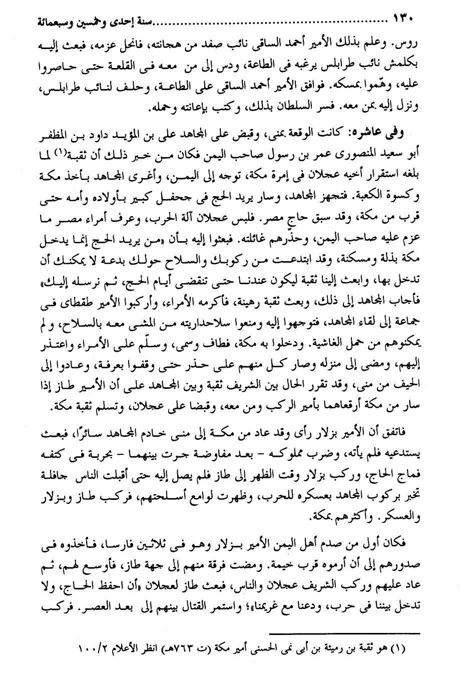 روس. وَعلم بذلك الْأَمِير أَحْمد الساقي نَائِب صفد من هجانته فانحل عزمه فَبعث إِلَيْهِ بكلمش نَائِب طرابلس يرغبه فِي الطَّاعَة ودس إِلَى من مَعَه فِي القلعة حَتَّى حاصروا عَلَيْهِ وهموا. بمسكه. فَوَافَقَ الْأَمِير أَحْمد الساقي على الطَّاعَة وَحلف لنائب طرابلس وَنزل إِلَيْهِ. بِمن مَعَه. فسر السُّلْطَان بذلك وَكتب بإعانته وَحمله. وَفِي عاشره: كَانَت الْوَقْعَة. بمنى وَقبض على الْمُجَاهِد على بن الْمُؤَيد دَاوُد بن المظفر أَبُو سعيد المنصوري عمر بن رَسُول صَاحب الْيمن فَكَانَ من خبر ذَلِك أَن ثقبة لما بلغه اسْتِقْرَار أَخِيه عجلَان فِي إمرة مَكَّة توجه إِلَى الْيمن وأغرى الْمُجَاهِد بِأخذ مَكَّة وَكِسْوَة الْكَعْبَة. فتجهز الْمُجَاهِد وَسَار يُرِيد الْحَج فِي جحفل كَبِير بأولاده وَأمه حَتَّى قرب من مَكَّة وَقد سبق حَاج مصر. فَلبس عجلَان آلَة الْحَرْب وَعرف أُمَرَاء مصر مَا عزم عَلَيْهِ صَاحب الْيمن وحذرهم غائلته. فبعثوا إِلَيْهِ بِأَن من يُرِيد الْحَج إِنَّمَا يدْخل مَكَّة بذلة ومسكنة وَقد ابتدعت من ركوبك وَالسِّلَاح حولك بِدعَة لَا يمكنك أَن تدخل بهَا وَابعث إِلَيْنَا ثقبة ليَكُون عندنَا حَتَّى تَنْقَضِي أَيَّام الْحَج ثمَّ نرسله إِلَيْك فَأجَاب الْمُجَاهِد إِلَى ذَلِك وَبعث ثقبة رهينة فَأكْرمه الْأُمَرَاء وأركبوا الْأَمِير طقطاي فِي جمَاعَة إِلَى لِقَاء الْمُجَاهِد فتوجهوا إِلَيْهِ وَمنعُوا سلاحداريته من الْمَشْي مَعَه بِالسِّلَاحِ وَلم يمكنوهم من حمل الغاشية. ودخلوا بِهِ مَكَّة فَطَافَ وسمى وَسلم على الْأُمَرَاء وَاعْتذر إِلَيْهِم وَمضى إِلَى منزله وَصَارَ كل مِنْهُم على حذر حَتَّى وقفُوا بِعَرَفَة وعادوا إِلَى الحيف من منى وَقد تقرر الْحَال بَين الشريف ثقبة وَبَين الْمُجَاهِد على أَن الْأَمِير طاز إِذا سَار من مَكَّة أرقعاهما بأمير الركب وَمن مَعَه وقبضا على عجلَان وتسلم ثقبة مَكَّة. فاتفق أَن الْأَمِير بزلار رأى وَقد عَاد من مَكَّة إِلَى منى خَادِم الْمُجَاهِد سائراً فَبعث يستدعيه فَلم يَأْته وَضرب مَمْلُوكه - بعد مُفَاوَضَة جرت بَينهمَا - بِحَرْبَة فِي كتفه فماج الْحَاج وَركب بزلار وَقت الظّهْر إِلَى طاز فَلم يصل إِلَيْهِ حَتَّى أَقبلت النَّاس جافلة تخبر بركوب الْمُجَاهِد بعسكره للحرب وَظَهَرت لوامع أسلحتهم فَركب طاز وبزلار والعسكر وَأَكْثَرهم بِمَكَّة. فَكَانَ أول من صدم أهل الْيمن الْأَمِير بزلار وَهُوَ فِي ثَلَاثِينَ فَارِسًا فَأَخَذُوهُ فِي صُدُورهمْ إِلَى أَن أرموه قرب خيمة. وَمَضَت فرقة مِنْهُم إِلَى جِهَة طاز فأوسع لَهُم ثمَّ عَاد عَلَيْهِم وَركب الشريف عجلَان وَالنَّاس فَبعث طاز لعجلان أَن احفظ الْحَاج وَلَا تدخل بَيْننَا فِي حَرْب وَدعنَا مَعَ غريمنا وَاسْتمرّ الْقِتَال بَينهم إِلَى بعد الْعَصْر. فَركب