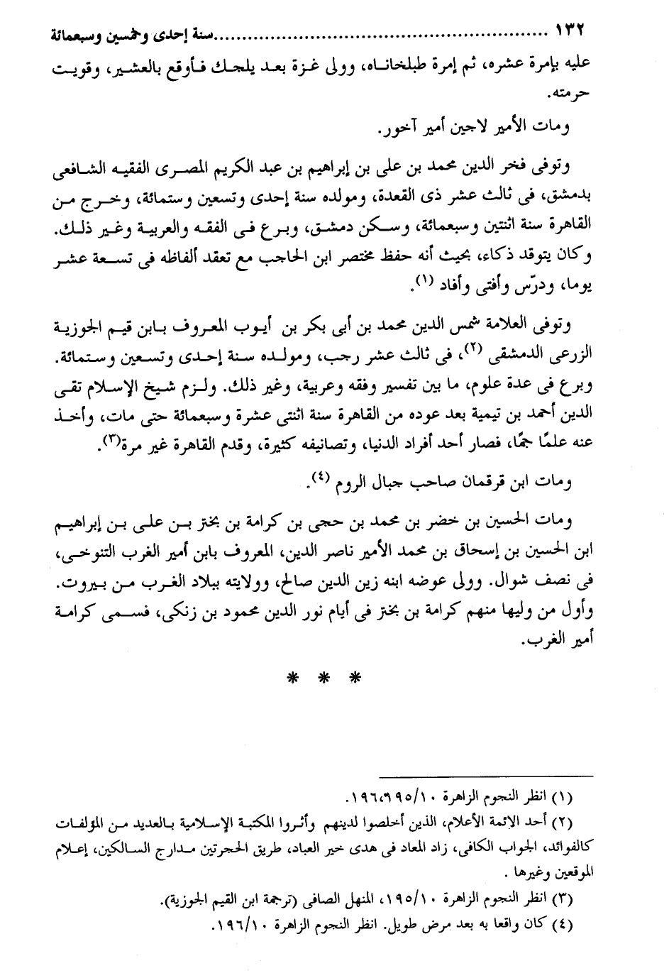 عَلَيْهِ بإمرة عشره ثمَّ إمرة طبلخاناه وَولي غَزَّة بعد يلجك فأوقع بالعشير وقويت حرمته. وَمَات الْأَمِير لاجين أَمِير آخور. وَتُوفِّي فَخر الدّين مُحَمَّد بن على بن إِبْرَاهِيم بن عبد الْكَرِيم الْمصْرِيّ الْفَقِيه الشَّافِعِي بِدِمَشْق فِي ثَالِث عشر ذِي الْقعدَة ومولده سنة إِحْدَى وَتِسْعين وسِتمِائَة وَخرج من الْقَاهِرَة سنة اثْنَتَيْنِ وَسَبْعمائة وَسكن دمشق وبرع فِي الْفِقْه والعربية وَغير ذَلِك. وَكَانَ يتوقد ذكاء بِحَيْثُ أَنه حفظ مُخْتَصر ابْن الْحَاجِب مَعَ تعقد أَلْفَاظه فِي تِسْعَة عشر يَوْمًا ودرس وَأفْتى وَأفَاد وَتُوفِّي الْعَلامَة شمس الدّين مُحَمَّد بن أبي بكر بن أَيُّوب الْمَعْرُوف بِابْن قيم الجوزية الزرعي الدِّمَشْقِي فِي ثَالِث عشر رَجَب ومولده سنة إِحْدَى وَتِسْعين وسِتمِائَة. وبرع فِي عدَّة عُلُوم مَا بَين تَفْسِير وَفقه وعربية وَغير ذَلِك. وَلزِمَ شيخ الْإِسْلَام تَقِيّ الدّين أَحْمد بن تَيْمِية بعد عوده من الْقَاهِرَة سنة اثْنَتَيْ عشرَة وَسَبْعمائة حَتَّى مَاتَ وَأخذ عَنهُ علما جماً فَصَارَ أحد أَفْرَاد الدُّنْيَا وتصانيفه كَثِيرَة وَقدم الْقَاهِرَة غير مرّة وَمَات ابْن قرقمان صَاحب جبال الرّوم وَمَات الْحُسَيْن بن خضر بن مُحَمَّد بن حجي بن كَرَامَة بن بختر بن على بن إِبْرَاهِيم ابْن الْحُسَيْن بن إِسْحَاق بن مُحَمَّد الْأَمِير نَاصِر الدّين الْمَعْرُوف بِابْن أَمِير الغرب التنوخى فِي نصف شَوَّال. وَولى عوضه ابْنه زين الدّين صَالح وولايته بِبِلَاد الغرب من بيروت. وَأول من وَليهَا مِنْهُم كَرَامَة بن بختر فِي أَيَّام نور الدّين مَحْمُود بن زنكي فَسُمي كَرَامَة أَمِير الغرب.