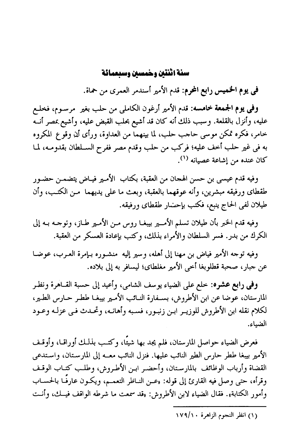 فِي يَوْم الْخَمِيس رَابِع الْمحرم: قدم الْأَمِير أسندمر الْعمريّ من حماة. وَفِي يَوْم الْجُمُعَة خامسه: قدم الْأَمِير أرغون الكاملي من حلب بِغَيْر مرسوم فَخلع عَلَيْهِ وَأنزل بالقلعة وَسبب ذَلِك أَنه كَانَ قد أشيع بحلب الْقَبْض عَلَيْهِ وَأشيع. بِمصْر أَنه خامر فكره تمكن مُوسَى حَاجِب حلب لما بَينهمَا من الْعَدَاوَة وَرَأى أَن وُقُوع الْمَكْرُوه بِهِ فِي غير حلب أخف عَلَيْهِ فَركب من حلب وَقدم مصر ففرح السُّلْطَان بقدومه لما كَانَ عِنْده من إِشَاعَة عصيانه وَفِيه قدم عِيسَى بن حسن الهجان من الْعقبَة بِكِتَاب الْأَمِير فياض يتَضَمَّن حُضُور طقطاى ورفيقه مبشرين وَأَنه عوقهما بِالْعقبَةِ وَبعث مَا على يديهما من الْكتب وَأَن طيلان لفي الْحَاج يَنْبع فَكتب بإحضار طقطاى ورفيقه. وَفِيه قدم الْخَبَر بِأَن طيلان تسلم الْأَمِير بيبغا روس من الْأَمِير طاز وَتوجه بِهِ إِلَى الكرك من بدر. فسر السُّلْطَان والأمراء بذلك وَكتب بِإِعَادَة الْعَسْكَر من الْعقبَة. وَفِيه توجه الْأَمِير فياض بن مهنا إِلَى أَهله وسير إِلَيْهِ منشوره بإمرة الْعَرَب عوضا عَن جَبَّار صُحْبَة قطلوبغا أخي الْأَمِير مغلطاى ليسافر بِهِ إِلَى بِلَاده. وَفِي رَابِع عشره: خلع على الضياء يُوسُف الشَّامي وأعيد إِلَى حسبَة الْقَاهِرَة وَنظر المارستان عوضا عَن ابْن الأطروش بسفارة النَّائِب الْأَمِير بيبغا ططر حارس الطير لكَلَام نَقله ابْن الأطروش للوزير ابْن زنبور فَسَبهُ وأهانه وتحدث فِي عَزله وعود الضياء. فَعرض الضياء حواصل المارستان فَلم يجد بهَا شَيْئا وَكتب بذلك أوراقاً وأوقف الْأَمِير بيبغا ططر حارس الطير النَّائِب عَلَيْهَا. فَنزل النَّائِب مَعَه إِلَى المارستان واستدعى الْقُضَاة وأرباب الْوَظَائِف بالمارستان وأحضر ابْن الأطروش وَطلب كتاب الْوَقْف وقرأه حَتَّى وصل فِيهِ الْقَارئ إِلَى قَوْله: عَن النَّاظر التعمم وَيكون عَارِفًا بِالْحِسَابِ وَأُمُور الْكِتَابَة. فَقَالَ الضياء لِابْنِ الأطروش: قد سَمِعت مَا شَرطه الْوَاقِف فِيك وَأَنت