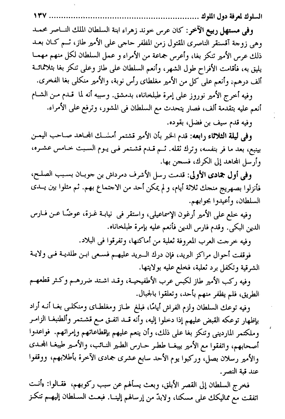 وَفِي مستهل ربيع الآخر. كَانَ عرس خوند زهراء ابْنة السُّلْطَان الْملك النَّاصِر مُحَمَّد وَهِي زَوْجَة آقسنقر الناصري الْمَقْتُول زمن المظفر حاجي على الْأَمِير طاز ثمَّ كَانَ بعد ذَلِك عرس الْأَمِير تنكز بغا وأعرس جمَاعَة من الْأُمَرَاء وَعمل السُّلْطَان لكل مِنْهُم مهما يَلِيق بِهِ فأقامت الأفراح طول الشَّهْر وأنعم السُّلْطَان على طاز وعَلى تنكز بغا بثلاثمائة ألف دِرْهَم وأنعم على كل من الْأَمِير مغلطاي رَأس نوبَة والأمير منكلى بغا الفخري. وَفِيه أخرج الْأَمِير نوروز على إمرة طبلخاناه بِدِمَشْق. وَسَببه أَنه لما قدم من الشَّام أنعم عَلَيْهِ بتقدمة ألف فَصَارَ يتحدث مَعَ السُّلْطَان فِي المشور وترفع على الْأُمَرَاء. وَفِيه قدم سيف بن فضل بقوده. وَفِي لَيْلَة الثُّلَاثَاء رابعه: قدم الْخَبَر بِأَن الْأَمِير قشتمر أمسك الْمُجَاهِد صَاحب الْيمن بينبع بعد مَا فر بِنَفسِهِ وَترك ثقله. ثمَّ قدم قشتمر فِي يَوْم السبت خَامِس عشره وَأرْسل الْمُجَاهِد إِلَى الكرك فسجن بهَا. وَفِي أول جُمَادَى الأولى: قدمت رسل الْأَشْرَف دمرداش بن جوبان بِسَبَب الصُّلْح فأنزلوا بصهريج منجك ثَلَاثَة أَيَّام وَلم يُمكن أحد من الِاجْتِمَاع بهم. ثمَّ مثلُوا بَين يَدي السُّلْطَان وأعيدوا بجوابهم. وَفِيه خلع على الْأَمِير أرغون الْإِسْمَاعِيلِيّ وَاسْتقر فِي نِيَابَة غَزَّة عوضا عَن فَارس الدّين ألبكي. وَقدم فَارس الدّين فأنعم عَلَيْهِ بإمرة طبلخاناه. وَفِيه خرجت الْعَرَب الْمَعْرُوفَة ثَعْلَبَة من أماكنها وَتَفَرَّقُوا فِي الْبِلَاد. فوقفت أَحْوَال مراكز الْبَرِيد فَإِن دَرك الْبَرِيد عَلَيْهِم فسعى ابْن طلدية فِي ولَايَة الشرقية وتكفل برد ثَعْلَبَة فَخلع عَلَيْهِ بولايتها. وَفِيه ركب الْأَمِير طاز لكبس عرب الأطفيحية وَقد اشْتَدَّ ضررهم وَكثر قطعهم الطَّرِيق فَلم يظفر مِنْهُم بِأحد وتعلقوا بالجبال. وَفِيه توعك السُّلْطَان وَلزِمَ الْفراش أَيَّامًا فَبلغ طاز ومغلطاى ومنكلى بغا أَنه أَرَادَ بِإِظْهَار توعكه الْقَبْض عَلَيْهِم إِذا دخلُوا إِلَيْهِ وَأَنه قد اتّفق مَعَ قشتمر وألطنبغا الزامر وملكتمر المارديني وتنكز بغا على ذَلِك وَأَن ينعم عَلَيْهِم بإقطاعاتهم وإمراتهم. فواعدوا أَصْحَابهم وَاتَّفَقُوا مَعَ الْأَمِير بيبغا ططر حارس الطير النَّائِب والأمير طيبغا المجدي والأمير رسْلَان بصل وركبوا يَوْم الْأَحَد سَابِع عشري جُمَادَى الْآخِرَة بأطلابهم ووقفوا عِنْد قبَّة النَّصْر. فَخرج السُّلْطَان إِلَى الْقصر الأبلق وَبعث يسألهم عَن سَبَب ركوبهم فَقَالُوا: أَنْت اتّفقت مَعَ مماليكك على مسكنا ولابد من إرسالهم إِلَيْنَا. فَبعث السُّلْطَان إِلَيْهِم تنكز