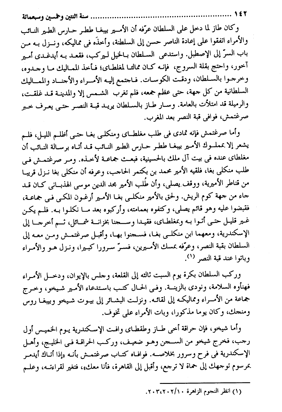 وَكَانَ طاز لما دخل على السُّلْطَان عرفه أَن الْأَمِير بيبغا ططر حارس الطير النَّائِب والأمراء اتَّفقُوا على إِعَادَة النَّاصِر حسن إِلَى السلطنة وَأَخذه فِي مماليكه وَنزل بِهِ من بَاب السِّرّ إِلَى الإصطبل. واستدعى السُّلْطَان بِالْخَيْلِ ليركب فَقعدَ بِهِ أيدغدي أَمِير آخور وَاحْتج بقلة السُّرُوج فَإِنَّهُ كَانَ ممالئاً لمغلطاي فَأخذ المماليك مَا وجدوه وَخَرجُوا بالسلطان ودقت الكوسات. فَاجْتمع إِلَيْهِ الْأُمَرَاء والأجناد والمماليك السُّلْطَانِيَّة من كل جِهَة حَتَّى عظم جمعه فَلم تغرب الشَّمْس إِلَّا وَالْمَدينَة قد غلقت والرميلة قد امْتَلَأت بالعامة. وَسَار طاز بالسلطان يُرِيد قبَّة النَّصْر حَتَّى يعرف خبر صرغتمش فَوَافى قبَّة النَّصْر بعد الْمغرب. وَأما صرغتمش فَإِنَّهُ تَمَادى فِي طلب مغلطاي ومنكلى بغا حَتَّى أظلم اللَّيْل فَلم يشْعر إِلَّا. بمملوك الْأَمِير بيبغا ططر حارس الطير النَّائِب قد أَتَاهُ برسالة النَّائِب أَن مغلطاي عِنْده فِي بَيت آل ملك بالحسينية فَبعث جمَاعَة لأَخذه. وَمر صرغتمش فِي طلب منكلى بغا فَلَقِيَهُ الْأَمِير مُحَمَّد بن بكتمر الحاحب وعرفه أَن منكلى بغا نزل قَرِيبا من قناطر الأميرية ووقف يُصَلِّي وَأَن طلب الْأَمِير مجد الدّين مُوسَى الهذباني كَانَ قد جَاءَ من جِهَة كوم الريش. وَلحق بالأمير منكلى بغا الْأَمِير أرغون الْمَكِّيّ فِي جمَاعَة فقبضوا عَلَيْهِ وَهُوَ قَائِم يُصَلِّي وكتفوه بعمامته وأركبوه بعد مَا نكلوا بِهِ. فَلم يكن غير قَلِيل حَتَّى أَتَوا بِهِ وبمغلطاي فقيدا وسجنا بخزانة شمائل ثمَّ أخرجَا إِلَى الْإسْكَنْدَريَّة ومعهما ابْن منكلى بغا فسجنوا بهَا وَأَقْبل صرغتمش وَمن مَعَه إِلَى السُّلْطَان بقبة النَّصْر وعرفه بمسك الأميرين فسر سُرُورًا كَبِيرا وَنزل هُوَ والأمراء وَبَاتُوا عِنْد قبَّة النَّصْر. وَركب السُّلْطَان بكرَة يَوْم السبت ثالثه إِلَى القلعة وَجلسَ بالإيوان وَدخل الْأُمَرَاء فهنأوه السَّلامَة وَنُودِيَ بالزينة. وَفِي الْحَال كتب باستدعاء الْأَمِير شيخو وَخرج جمَاعَة من الْأُمَرَاء ومماليكه إِلَى لِقَائِه. وَنزلت البشائر إِلَى بيُوت شيخو وبيبغا روس ومنجك وَكَانَ يَوْمًا مَذْكُورا وَبَات الْأُمَرَاء على تخوف. وَأما شيخو فَإِن حراقة أخي طاز وطقطاي وافت الاسكندرية يَوْم الْخَمِيس أول رَجَب فَخرج شيخو من السجْن وَهُوَ ضَعِيف وَركب الحراقة فِي الخليج وَأهل الْإسْكَنْدَريَّة فِي فَرح وسرور بخلاصه. فوافاه كتاب صرغتمش بِأَنَّهُ إِذا أَتَاك أيدمر بمرسوم توجهك إِلَى حماة لَا ترجع وَأَقْبل إِلَى الْقَاهِرَة فَأَنا مَعَك فَتغير لقرَاءَته وَعلم