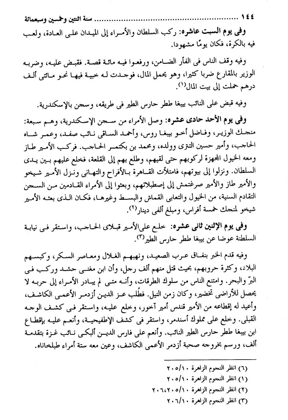 وَفِي يَوْم السبت عاشره: ركب السُّلْطَان والأمراء إِلَى الميدان على الْعَادة وَلعب فِيهِ بالكرة فَكَانَ يَوْمًا مشهوداً. وَفِيه وقف النَّاس فِي الفأر الضَّامِن وَرفعُوا فِيهِ مائَة قصَّة. فَقبض عَلَيْهِ وضربه الْوَزير بالمقارع ضربا كثيرا وَهُوَ يحمل المَال فَوجدت لَهُ خبية فِيهَا نَحْو مِائَتي ألف دِرْهَم حملت إِلَى بَيت المَال. وَفِيه قبض على النَّائِب بيبغا ططر حارس الطير فِي طَرِيقه وسجن بالإسكندرية. وَفِي يَوْم الْأَحَد حادي عشره. وصل الْأُمَرَاء من سجن الإسكندريه وهم سَبْعَة. منجك الْوَزير وفاضل أَخُو بيبغا روس وَأحمد الساقي نَائِب صفد وَعمر شاه الْحَاجِب وأمير حُسَيْن التتري وَولده وَمُحَمّد بن بكتمر الْحَاجِب. فَركب الْأَمِير طاز وَمَعَهُ الْخُيُول المجهزة لركوبهم حَتَّى لَقِيَهُمْ وطلع بهم إِلَى القلعة فَخلع عَلَيْهِم بَين يَدي السُّلْطَان. ونزلوا إِلَى بُيُوتهم فامتلأت الْقَاهِرَة بالأفراح والتهاني وَنزل الْأَمِير شيخو والأمير طاز والأمير صرغتمش إِلَى إصطبلاتهم وبعثوا إِلَى الْأُمَرَاء القادمين من السجْن التقادم السّنيَّة من الْخُيُول والتعابي القماش والبسط وَغَيرهَا فَكَانَ الَّذِي بَعثه الْأَمِير شيخو لمنجك خَمْسَة أَفْرَاس ومبلغ ألفي دِينَار وَفِي يَوْم الْإِثْنَيْنِ ثَانِي عشره: خلع على الْأَمِير قبلاي الْحَاجِب وَاسْتقر فِي نِيَابَة السلطنة عوضا عَن بيبغا ططر حارس الطير. وَفِيه قدم الْخَبَر بِنفَاق عرب الصَّعِيد ونهبهم الغلال ومعاصر السكر وكبسهم الْبِلَاد وكثره حروبهم بِحَيْثُ قتل مِنْهُم ألف رجل وَأَن ابْن مغنى حشد وَركب فِي الْبر وَالْبَحْر. وَامْتنع النَّاس من سلوك الطرقات وَأَنه مَتى لم يُبَادر الْأُمَرَاء إِلَى حربه لَا يحصل للأراضي تخضير وَكَانَ زمن النّيل. فَطلب عز الدّين أزدمر الْأَعْمَى الكاشف وأعيد لَهُ إقطاعه من الْأَمِير قندس أَمِير آخور وخلع عَلَيْهِ وَاسْتقر فِي كشف الْوَجْه القبلي. وخلع على مَمْلُوك أسندمر وَاسْتقر فِي كشف الإطفيحية وأنعم عَلَيْهِ بإقطاع ابْن بيبغا ططر حارس الطير النَّائِب. وأنعم على فَارس الدّين ألبكي نَائِب غَزَّة بتقدمة ألف ورسم بِخُرُوجِهِ صُحْبَة أزدمر الْأَعْمَى الكاشف وَعين مَعَه سِتَّة أُمَرَاء طبلخاناه.