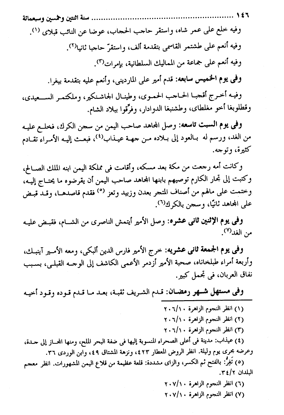 وَفِيه خلع على عمر شاه وَاسْتقر حاحب الْحجاب عوضا عَن النَّائِب قبلاي وَفِيه أنعم على طشتمر القاسمي بتقدمة ألف وَاسْتقر حاجباً ثَانِيًا. وَفِيه أنعم على جمَاعَة من المماليك السُّلْطَانِيَّة بإمرات. وَفِي يَوْم الْخَمِيس سابعه: قدم أَمِير على المارديني وأنعم عَلَيْهِ بتقدمة بيغرا. وَفِيه أخرج أقجبا الحاحب الْحَمَوِيّ وطينال الجاشنكير وملكتمر السعيدي وقطلوبغا أَخُو مغلطاى وطشنبغا الدوادار وَفرقُوا بِبِلَاد الشَّام. وَفِي يَوْم السبت تاسعه: وصل الْمُجَاهِد صَاحب الْيمن من سجن الكرك فَخلع عَلَيْهِ من الْغَد ورسم لَهُ بِالْعودِ إِلَى بِلَاده من جِهَة عيذاب فَبعث إِلَيْهِ الْأُمَرَاء تقادم كَثِيرَة وَتوجه. وَكَانَت أمه رجعت من مَكَّة بعد مسكه وأقامت فِي مملكة الْيمن ابْنه الْملك الصَّالح وكتبت إِلَى تجار الكارم توصيهم بابنها الْمُجَاهِد صَاحب الْيمن أَن يقرضوه مَا يحْتَاج إِلَيْهِ وختمت على مَالهم من أَصْنَاف المتجر بعدن وزبيد وتعز فَقدم قاصدها وَقد قبض على الْمُجَاهِد ثَانِيًا وسجن وَفِي يَوْم الْإِثْنَيْنِ ثَانِي عشره: وصل الْأَمِير أيتمش الناصري من الشَّام فَقبض عَلَيْهِ من الْغَد وَفِي يَوْم الْجُمُعَة ثَانِي عشريه: خرج الْأَمِير فَارس الدّين ألبكي وَمَعَهُ الْأَمِير آينبك وَأَرْبَعَة أُمَرَاء طبلخاناه صُحْبَة الْأَمِير أزدمر الْأَعْمَى الكاشف إِلَى الْوَجْه القبلي بِسَبَب نفاق العربان فِي تجمل كَبِير. وَفِي مستهل شهر رَمَضَان: قدم الشريف ثقبة بعد مَا قدم قوده وقود أَخِيه
