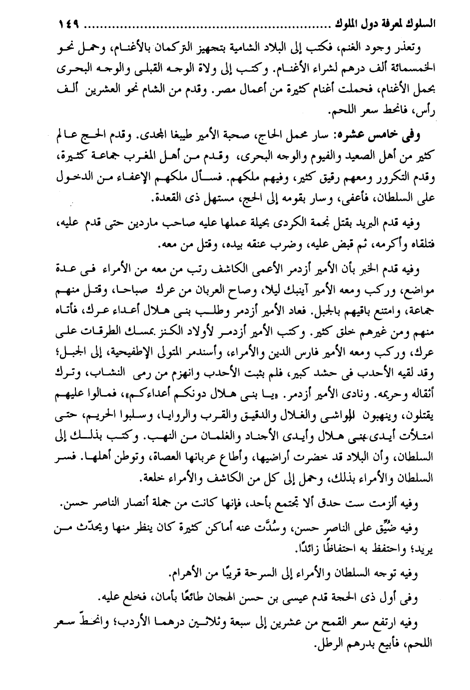 وَتعذر وجود الْغنم فَكتب فِي الْبِلَاد الشامية بتجهيز التركمان بالأغنام وَحمل نَحْو الْخَمْسمِائَةِ ألف دِرْهَم لشراء الأغنام. وَكتب إِلَى وُلَاة الْوَجْه القبلي وَالْوَجْه البحري بِحمْل الأغنام فَحملت أَغْنَام كَثِيرَة من أَعمال مصر. وَقدم من الشَّام نَحْو الْعشْرين ألف رَأس فَانْحَطَّ سعر اللَّحْم. وَفِي خَامِس عشره: سَار محمل الْحَاج صُحْبَة الْأَمِير طيبغا المجدي. وَقدم الْحَج عَالم كثير من أهل الصَّعِيد والفيوم وَالْوَجْه البحري وَقدم من أهل الْمغرب جمَاعَة كَثِيرَة وَقدم التكرور وَمَعَهُمْ رَقِيق كثير وَفِيهِمْ ملكهم. فَسَأَلَ ملكهم الإعفاء من الدُّخُول على السُّلْطَان فأعفي وَسَار بقَوْمه وَفِيه قدم الْبَرِيد بقتل نجمة الْكرْدِي بحيلة عَملهَا عَلَيْهِ صَاحب ماردين حَتَّى قدم عَلَيْهِ فَتَلقاهُ وأكرمه ثمَّ قبض عَلَيْهِ وَضرب عُنُقه بِيَدِهِ وَقتل من مَعَه. وَفِيه قدم الْخَبَر بَان الْأَمِير أزدمر الْأَعْمَى الكاشف رتب من مَعَه من الْأُمَرَاء فِي عدَّة مَوَاضِع وَركب وَمَعَهُ الْأَمِير آينبك لَيْلًا وَصَاح العربان من عَرك صباحاً وَقتل مِنْهُم جمَاعَة وَامْتنع باقيهم بِالْجَبَلِ. فَعَاد الْأَمِير أزدمر وَطلب بني هِلَال أَعدَاء عَرك فَأَتَاهُ مِنْهُم وَمن غَيرهم خلق كثير. وَكتب الْأَمِير أزدمر لأَوْلَاد الْكَنْز. بمسك الطرقات على عَرك وَركب وَمَعَهُ الْأَمِير فَارس الدّين والأمراء وأسندمر المتوفي الإطفيحية إِلَى الْجَبَل وَقد لقِيه الأحدب فِي حشد كَبِير فَلم بثبت الأحدب وَانْهَزَمَ من رمي النشاب وَترك أثقاله وحريمه. ونادى الْأَمِير أزدمر. يَا بنى هِلَال دونكم أعداءكم فمالوا عَلَيْهِم يقتلُون وينهبون الواشي والغلال والدقيق والقرب والروايا وسلبوا الْحَرِيم حَتَّى امْتَلَأت أَيدي بني هِلَال وأيدي الأجناد والغلمان من النهب. وَكتب بذلك إِلَى السُّلْطَان وَأَن الْبِلَاد قد خضرت أراضيها وأطاع عربانها العصاة وتوطن أَهلهَا. فسر السُّلْطَان والأمراء بذلك وَحمل إِلَى كل من الكاشف والأمراء خلعة. وَفِيه ألزمت سِتّ حدق أَلا تَجْتَمِع بِأحد فَإِنَّهَا كَانَت من جملَة أنصار النَّاصِر حسن. وَفِيه ضيق على النَّاصِر حسن وسدت عَنهُ أَمَاكِن كَثِيرَة كَانَ ينظر مِنْهَا وَيحدث من يُرِيد وَفِيه توجه السُّلْطَان والأمراء إِلَى السرحة قَرِيبا من الأهرام. وَفِي أول ذِي الْحجَّة قدم عِيسَى بن حسن الهجان طَائِعا بِأَمَان فَخلع عَلَيْهِ. وَفِيه ارْتَفع سعر الْقَمْح من عشْرين إِلَى سَبْعَة وَثَلَاثِينَ درهما الأردب وانحط سعر اللَّحْم فأبيع بدرهم الرطل.