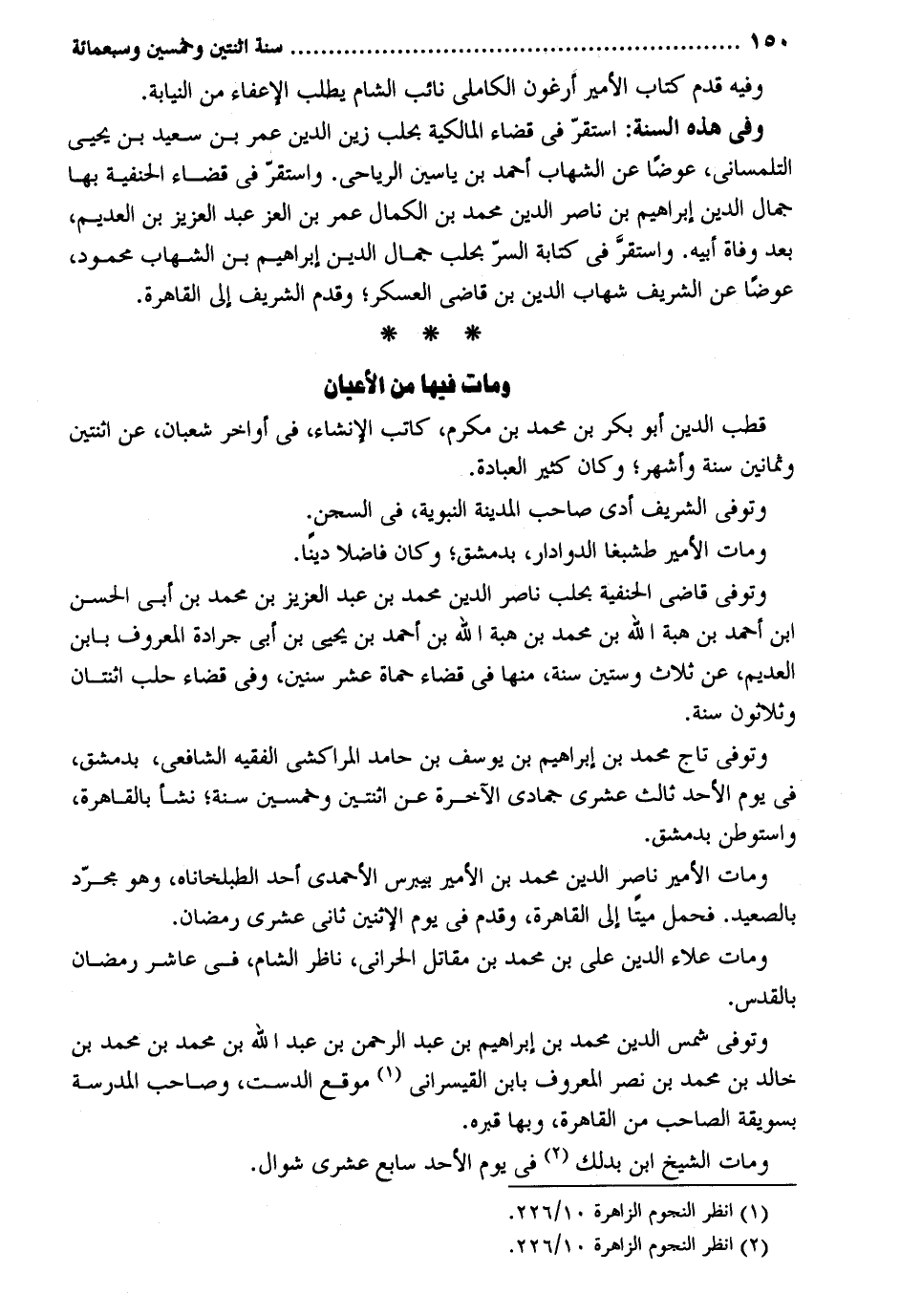 وَفِيه قدم كتاب الْأَمِير أرغون الكاملي نَائِب الشَّام يطْلب الإعفاء من النِّيَابَة. وَفِي هَذِه السّنة: اسْتَقر فِي قَضَاء الْمَالِكِيَّة بحلب زين الدّين عمر بن سعيد بن يحيى التلمساني عوضا عَن الشهَاب أَحْمد بن ياسين الريَاحي. وَاسْتقر فِي قَضَاء الْحَنَفِيَّة بهَا جمال الدّين إِبْرَاهِيم بن نَاصِر الدّين مُحَمَّد بن الْكَمَال عمر بن الْعِزّ عبد الْعَزِيز بن العديم بعد وَفَاة أَبِيه. وَاسْتقر فِي كِتَابَة السِّرّ بحلب جمال الدّين إِبْرَاهِيم بن الشهَاب مَحْمُود عوضا عَن الشريف شهَاب الدّين بن قَاضِي الْعَسْكَر وَقدم الشريف إِلَى الْقَاهِرَة. وَمَات فِيهَا من الْأَعْيَان قطب الدّين أَبُو بكر بن مُحَمَّد بن مكرم كَاتب الْإِنْشَاء فِي أَوَاخِر شعْبَان عَن اثْنَتَيْنِ وَثَمَانِينَ سنة وَأشهر وَكَانَ كثير الْعِبَادَة. وَتُوفِّي الشريف أدّى صَاحب الْمَدِينَة النَّبَوِيَّة فِي السحن. وَتُوفِّي قاضى الْحَنَفِيَّة بحلب نَاصِر الدّين مُحَمَّد بن عبد الْعَزِيز بن مُحَمَّد بن أبي الْحسن ابْن أَحْمد بن هبة الله بن مُحَمَّد بن هبة الله بن أَحْمد بن يحيى بن أَبى جَرَادَة الْمَعْرُوف بِابْن العديم عَن ثَلَاث وَسِتِّينَ سنة مِنْهَا فِي قَضَاء حماة عشر سِنِين وَفِي قَضَاء حلب اثْنَتَانِ وَثَلَاثُونَ سنة. وَتُوفِّي تَاج مُحَمَّد بن إِبْرَاهِيم بن يُوسُف بن حَامِد المراكشي الْفَقِيه الشَّافِعِي بِدِمَشْق فِي يَوْم الْأَحَد ثَالِث عشرى جُمَادَى الْآخِرَة عَن اثْنَتَيْنِ وَخمسين سنة نَشأ بِالْقَاهِرَةِ واستوطن بِدِمَشْق. وَمَات الْأَمِير نَاصِر الدّين مُحَمَّد بن الْأَمِير بيبرس الأحمدي أحد الطبلخاناه وَهُوَ مُجَرّد بالصعيد. فَحمل مَيتا إِلَى الْقَاهِرَة وَقدم فِي يَوْم الْإِثْنَيْنِ ثَانِي عشري رَمَضَان. وَمَات عَلَاء الدّين على بن مُحَمَّد بن مقَاتل الْحَرَّانِي نَاظر الشَّام فِي عَاشر رَمَضَان بالقدس. وَتُوفِّي شمس الدّين مُحَمَّد بن إِبْرَاهِيم بن عبد الرَّحْمَن بن عبد الله بن مُحَمَّد بن مُحَمَّد خَالِد بن مُحَمَّد بن نصر الْمَعْرُوف بِابْن القيسراني موقع الدست وَصَاحب الْمدرسَة بسويقة الصاحب من الْقَاهِرَة وَبهَا قَبره. وَمَات الشَّيْخ. ابْن بدلك فِي يَوْم الْأَحَد سَابِع عشرى شَوَّال.