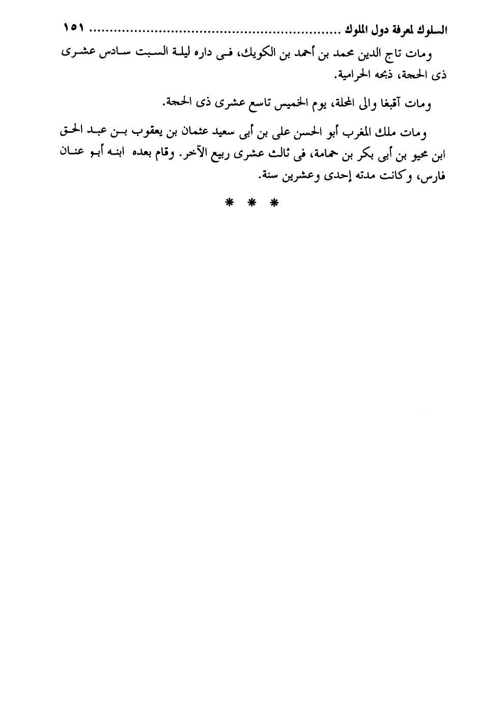 وَمَات تَاج الدّين مُحَمَّد بن أَحْمد بن الكويك فِي دَاره لَيْلَة السبت سادس عشرى ذِي الْحجَّة ذبحه الحرامية. وَمَات ملك الْمغرب أَبُو الْحسن عَليّ بن أبي سعيد عُثْمَان بن يَعْقُوب بن عبد الْحق ابْن محيو بن أبي بكر بن حمامة فِي ثَالِث عشري ربيع الآخر. وَقَامَ بعده ابْنه أَبُو عنان فَارس وَكَانَت مدَّته احدى وَعشْرين سنة.