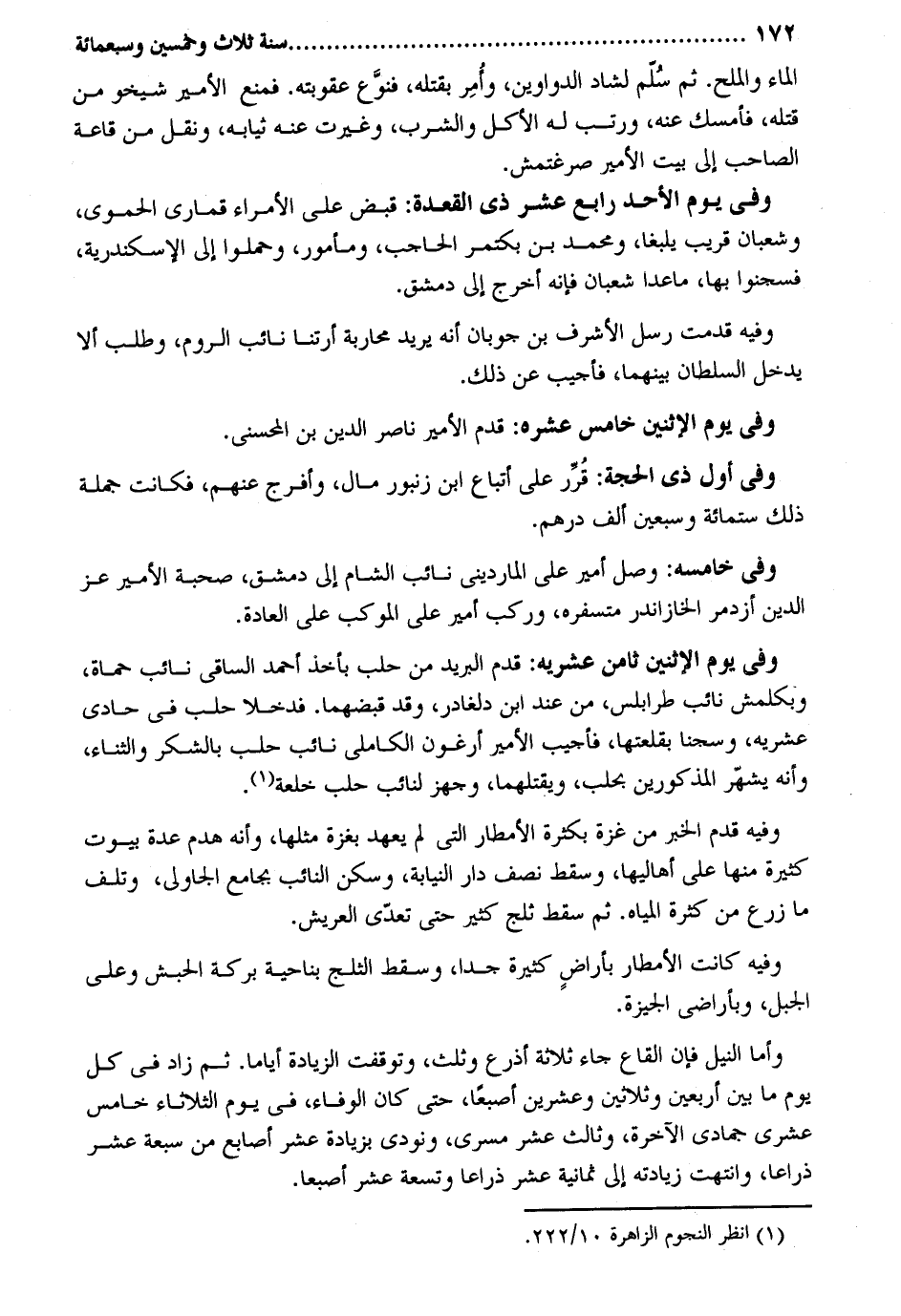المَاء وَالْملح. ثمَّ سلم لشاد الدَّوَاوِين وَأمر بقتْله فنوع عُقُوبَته. فَمنع الْأَمِير شيخو من قَتله فَأمْسك عَنهُ ورتب لَهُ الْأكل وَالشرب وغيرت عَنهُ ثِيَابه وَنقل من قاعة الصاحب إِلَى بَيت الْأَمِير صرغتمش. وَفِي يَوْم الْأَحَد رَابِع عشر ذِي الْقعدَة: قبض على الْأُمَرَاء قمارى الْحَمَوِيّ وَشَعْبَان قريب يلبغا وَمُحَمّد بن بكتمر الحاحب ومأمور وحملوا إِلَى الْإسْكَنْدَريَّة فسجنوا بهَا ماعدا شعْبَان فَإِنَّهُ أخرج إِلَى دمشق. وَفِيه قدمت رسل الْأَشْرَف بن جوبان أَنه يُرِيد محاربة أرتنا نَائِب الرّوم وَطلب أَلا يدْخل السُّلْطَان بَينهمَا فَأُجِيب عَن ذَلِك. وَفِي يَوْم الْإِثْنَيْنِ خَامِس عشره: قدم الْأَمِير نَاصِر الدّين بن المحسني. وَفِي أول ذِي الْحجَّة: قرر على أَتبَاع ابْن زنبور مَال وَأَفْرج عَنْهُم فَكَانَت جملَة ذَلِك سِتّمائَة وَسبعين ألف دِرْهَم. وَفِي خامسه: وصل أَمِير عَليّ المارديني نَائِب الشَّام إِلَى دمشق صُحْبَة الْأَمِير عز الدّين أزدمر الخازاندر متسفره وَركب أَمِير على الموكب على الْعَادة. وَفِي يَوْم الْإِثْنَيْنِ ثامن عشريه: قدم الْبَرِيد من حلب بِأخذ أَحْمد الساقي نَائِب حماة وبكلمش نَائِب طرابلس من عِنْد ابْن دلغادر وَقد قبضهما. فدخلا حلب فِي حادي عشريه وسجنا بقلعتها فَأُجِيب الْأَمِير أرغون الكاملي نَائِب حلب بالشكر وَالثنَاء وَأَنه يشهر الْمَذْكُورين بحلب ويقتلهما وجهز لنائب حلب خلعة. وَفِيه قدم الْخَبَر من غَزَّة بِكَثْرَة الأمطار الَّتِي لم يعْهَد بغزة مثلهَا وَأَنه هدم عدَّة بيُوت كَثِيرَة مِنْهَا على أهاليها وَسقط نصف دَار النِّيَابَة وَسكن النَّائِب بِجَامِع الجاولي وَتلف مَا زرع من كَثْرَة الْمِيَاه. ثمَّ سقط ثلج كثير حَتَّى تعدى الْعَريش. وَفِيه كَانَت الأمطار بأراض كَثِيرَة جدا وَسقط الثَّلج بِنَاحِيَة بركَة الْحَبَش وعَلى الْجَبَل وبأراضي الجيزة. وَأما النّيل فان القاع جَاءَ ثَلَاثَة أَذْرع وَثلث وتوقفت الزِّيَادَة أَيَّامًا. ثمَّ زَاد فِي كل يَوْم مَا بَين أَرْبَعِينَ وَثَلَاثِينَ وَعشْرين إصبعاً حَتَّى كَانَ الْوَفَاء فِي يَوْم الثُّلَاثَاء حادي عشري جُمَادَى الْآخِرَة وثالث عشر مسرى وَنُودِيَ بِزِيَادَة عشر أَصَابِع من سَبْعَة عشر ذِرَاعا وانتهت زِيَادَته إِلَى ثَمَانِيَة عشر ذِرَاعا وَتِسْعَة عشر أصبعاً.