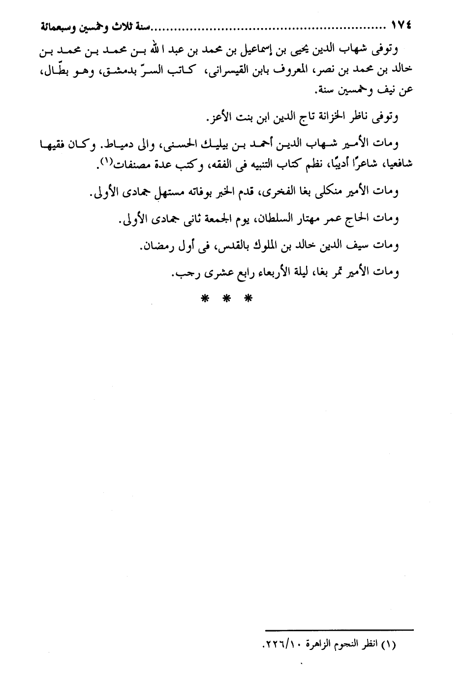 وَتُوفِّي شهَاب الدّين يحيى بن إِسْمَاعِيل بن مُحَمَّد بن عبد الله بن مُحَمَّد بن مُحَمَّد بن خَالِد بن مُحَمَّد بن نصر الْمَعْرُوف بِابْن القيسراني كَاتب السِّرّ لدمشق وَهُوَ بطال عَن نَيف وَخمسين سنة. وَتُوفِّي نَاظر الخزانة تَاج الدّين ابْن بنت الْأَعَز. وَمَات الْأَمِير شهَاب الدّين أَحْمد بن بيليك الحسني وَالِي دمياط. وَكَانَ فَقِيها شافعياً شَاعِرًا أديباً نظم كتاب التَّنْبِيه فِي الْفِقْه وَكتب عدَّة مصنفات وَمَات الْأَمِير منكلى بغا الفخري قدم الْخَبَر بوفاته مستهل جُمَادَى الأولى. وَمَات الْحَاج عمر مهتار السُّلْطَان يَوْم الْجُمُعَة ثَانِي جُمَادَى الأولى. وَمَات سيف الدّين خَالِد بن الْمُلُوك بالقدس فِي أول رَمَضَان. وَمَات الْأَمِير تمر بغا لَيْلَة الْأَرْبَعَاء رَابِع عشري رَجَب.