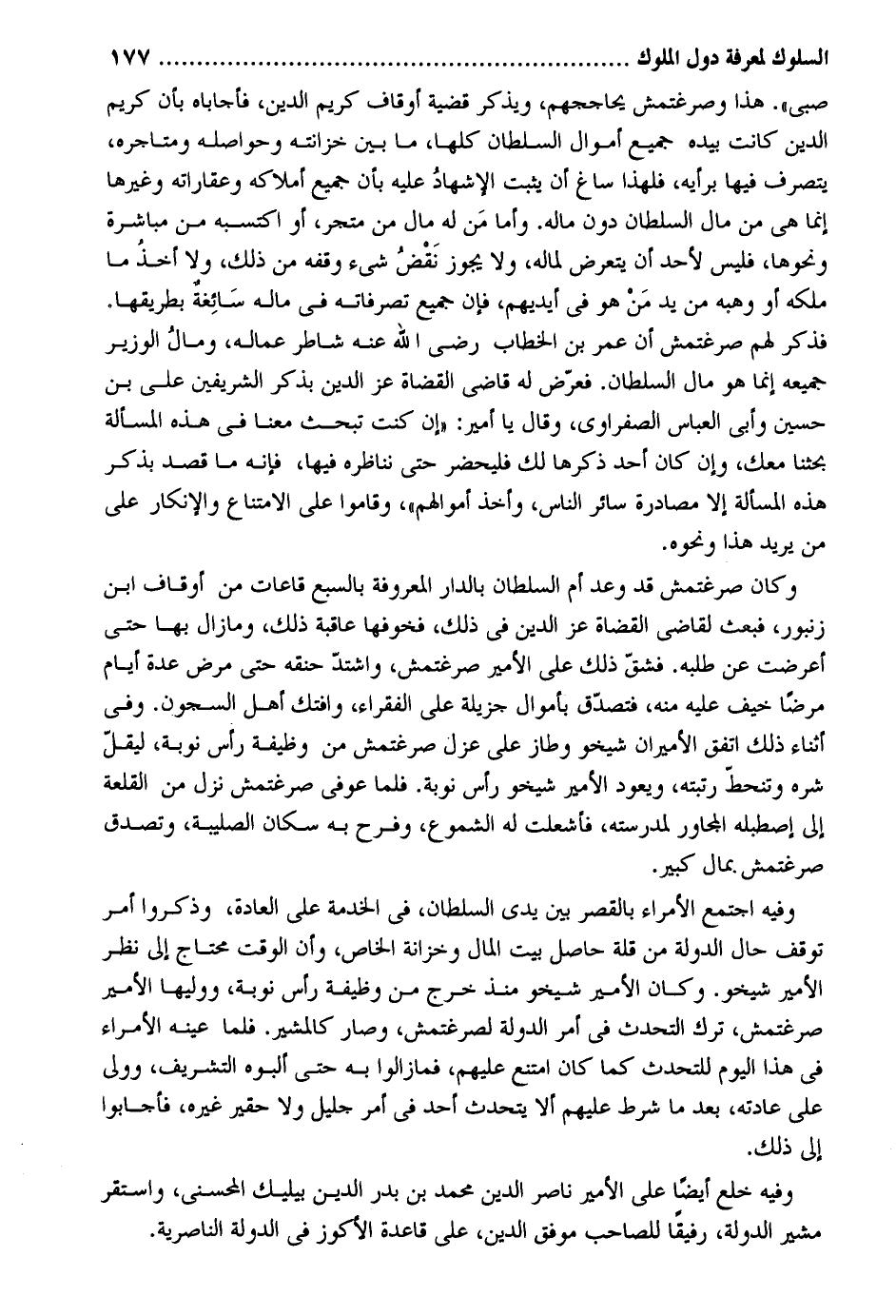 صبي. هَذَا وصرغتمش يحاججهم وَيذكر قَضِيَّة أوقاف كريم الدّين فأجاباه بِأَن كريم الدّين كَانَت بِيَدِهِ جَمِيع أَمْوَال السُّلْطَان كلهَا مَا بَين خزانته وحواصله ومتاجره يتَصَرَّف فِيهَا بِرَأْيهِ فَلهَذَا سَاغَ أَن يثبت الْإِشْهَاد عَلَيْهِ بِأَن جَمِيع أملاكه وعقاراته وَغَيرهَا إِنَّمَا هِيَ من مَال السُّلْطَان دون مَاله. وَأما من لَهُ مَال من متجر أَو اكْتَسبهُ من مُبَاشرَة وَنَحْوهَا فَلَيْسَ لأحد أَن يتَعَرَّض لمَاله وَلَا يجوز نقض شىء وَقفه من ذَلِك وَلَا أَخذ مَا ملكه أَو وهبه من يَد من هُوَ فِي أَيْديهم فَإِن جَمِيع تَصَرُّفَاته فِي مَاله سَائِغَة بطريقها. فَذكر لَهُم صرغتمش أَن عمر بن الْخطاب رَضِي الله عَنهُ شاطر عماله وَمَال الْوَزير جَمِيعه إِنَّمَا هُوَ مَال السُّلْطَان. فَعرض لَهُ قَاضِي الْقُضَاة عز الدّين بِذكر الشريفين عَليّ بن حُسَيْن وَأبي الْعَبَّاس الصفراوي وَقَالَ يَا أَمِير: إِن كنت تبحث مَعنا فِي هَذِه الْمَسْأَلَة بحثنا مَعَك وَإِن كَانَ أحد ذكرهَا لَك فليحضر حَتَّى نناظره فِيهَا فَإِنَّهُ مَا قصد بِذكر هَذِه الْمَسْأَلَة إِلَّا مصادرة سَائِر النَّاس وَأخذ أَمْوَالهم وَقَامُوا على الِامْتِنَاع وَالْإِنْكَار على من يُرِيد هَذَا وَنَحْوه. وَكَانَ صرغتمش قد وعد أم السُّلْطَان بِالدَّار الْمَعْرُوفَة بالسبع قاعات من أوقاف ابْن زنبور فَبعث لقَاضِي الْقُضَاة عز الدّين فِي ذَلِك فخوفها عَاقِبَة ذَلِك ومازال بهَا حَتَّى أَعرَضت عَن طلبه. فشق ذَلِك على الْأَمِير صرغتمش وَاشْتَدَّ حنقه حَتَّى مرض عدَّة أَيَّام مَرضا خيف عَلَيْهِ مِنْهُ فَتصدق بأموال جزيلة على الْفُقَرَاء وافتك أهل السجون. وَفِي أثْنَاء ذَلِك اتّفق الأميران شيخو وطاز على عزل صرغتمش من وَظِيفَة رَأس نوبَة ليقل شَره وتنحط رتبته وَيعود الْأَمِير شيخو رَأس نوبَة. فَلَمَّا عوفي صرغتمش نزل من القلعة إِلَى إصطبله المجاور لمدرسته فأشعلت لَهُ الشموع وَفَرح بِهِ سكان الصليبة وَتصدق صرغتمش بِمَال كَبِير. وَفِيه اجْتمع الْأُمَرَاء بِالْقصرِ بَين يَدي السُّلْطَان فِي الْخدمَة على الْعَادة وَذكروا أَمر توقف حَال الدولة من قلَّة حَاصِل بَيت المَال وخزانة الْخَاص وَأَن الْوَقْت مُحْتَاج إِلَى نظر الْأَمِير شيخو. وَكَانَ الْأَمِير شيخو مُنْذُ خرج من وَظِيفَة رَأس نوبَة ووليها الْأَمِير صرغتمش ترك التحدث فِي أَمر الدولة لصرغتمش وَصَارَ كالمشير. فَلَمَّا عينه الْأُمَرَاء فِي هَذَا الْيَوْم للتحدث كَمَا كَانَ امْتنع عَلَيْهِم فمازالوا بِهِ حَتَّى ألبوه التشريف وَولي على عَادَته بعد مَا شَرط عَلَيْهِم أَلا يتحدث أحد فِي أَمر جليل وَلَا حقير غَيره فَأَجَابُوا إِلَى ذَلِك. وَفِيه خلع أَيْضا على الْأَمِير نَاصِر الدّين مُحَمَّد بن بدر الدّين بيليك المحسني وَاسْتقر مشير الدولة رَفِيقًا للصاحب موفق الدّين على قَاعِدَة الأكوز فِي الدولة الناصرية.