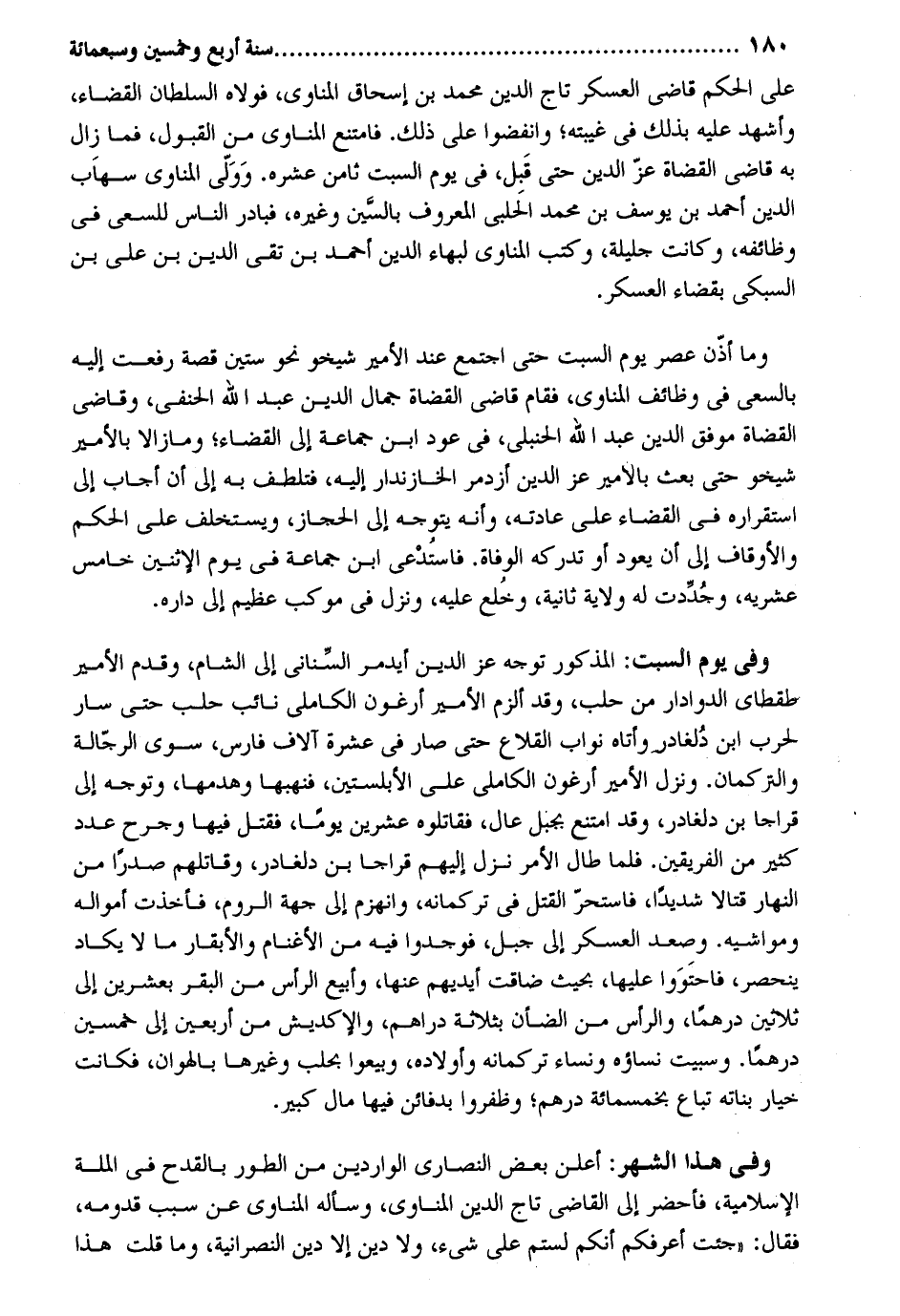 على الحكم قَاضِي الْعَسْكَر تَاج الدّين مُحَمَّد بن إِسْحَاق الْمَنَاوِيّ فولاه السُّلْطَان الْقَضَاء وَأشْهد عَلَيْهِ بذلك فِي غيبته وانفضوا على ذَلِك. فَامْتنعَ الْمَنَاوِيّ من الْقبُول فَمَا زَالَ بِهِ قَاضِي الْقُضَاة عز الدّين حَتَّى قبل فِي يَوْم السبت ثامن عشره. وَولي الْمَنَاوِيّ سهاب الدّين أَحْمد بن يُوسُف بن مُحَمَّد الْحلَبِي الْمَعْرُوف بِالسِّين وَغَيره فبادر النَّاس للسعي فِي وظائفه وَكَانَت جليلة وَكتب الْمَنَاوِيّ لبهاء الدّين أَحْمد بن تَقِيّ الدّين بن عَليّ بن السُّبْكِيّ بِقَضَاء الْعَسْكَر. وَمَا أذن عصر يَوْم السبت حَتَّى اجْتمع عِنْد الْأَمِير شيخو نَحْو سِتِّينَ قصَّة رفعت اليه بالسعي فِي وظائف الْمَنَاوِيّ فَقَامَ قَاضِي الْقُضَاة جمال الدّين عبد الله الْحَنَفِيّ وقاضي الْقُضَاة موفق الدّين عبد الله الْحَنْبَلِيّ فِي عود ابْن جمَاعَة إِلَى الْقَضَاء ومازالا بالأمير شيخو حَتَّى بعث بالأمير عز الدّين أزدمر الخازندار إِلَيْهِ فتلطف بِهِ إِلَى أَن أجَاب إِلَى استقراره فِي الْقَضَاء على عَادَته وَأَنه يتَوَجَّه إِلَى الْحجاز ويستخلف على الحكم والأوقاف إِلَى أَن يعود أَو تُدْرِكهُ الْوَفَاة. فاستدعي ابْن جمَاعَة فِي يَوْم الْإِثْنَيْنِ خَامِس عشريه وجددت لَهُ ولَايَة ثَانِيَة وخلع عَلَيْهِ وَنزل فِي موكب عَظِيم إِلَى دَاره. وَفِي يَوْم السبت: الْمَذْكُور توجه عز الدّين أيدمر السناني إِلَى الشَّام وَقدم الْأَمِير طقطاى الدوادار من حلب وَقد ألزم الْأَمِير أرغون الكاملي نَائِب حلب حَتَّى سَار لِحَرْب ابْن دلغادر وَأَتَاهُ نواب القلاع حَتَّى صَار فِي عشرَة آلَاف فَارس سوى الرجالة والتركمان. وَنزل الْأَمِير أرغون الكاملي على الأبلستين فنهبها وهدمها وَتوجه إِلَى قراجا بن دلغادر وَقد امْتنع بجبل عَال فقاتلوه عشْرين يَوْمًا فَقتل فِيهَا وجرح عدد كثير من الْفَرِيقَيْنِ. فَلَمَّا طَال الْأَمر نزل إِلَيْهِم قراجا بن دلغادر وَقَاتلهمْ صَدرا من النَّهَار قتالا شَدِيدا فاستمر الْقَتْل فِي تركمانه وَانْهَزَمَ إِلَى جِهَة الرّوم فَأخذت أَمْوَاله ومواشيه. وَصعد الْعَسْكَر إِلَى جبل فوجدوا فِيهِ من الأغنام والأبقار مَا لَا يكَاد ينْحَصر فاحتووا عَلَيْهَا بِحَيْثُ ضَاقَتْ أَيْديهم عَنْهَا وأبيع الرَّأْس من الْبَقر بِعشْرين إِلَى ثَلَاثِينَ درهما وَالرَّأْس من الضان بِثَلَاثَة دَرَاهِم والإكديش من أَرْبَعِينَ إِلَى خمسين درهما. وسبيت نساؤه وَنسَاء تركمانه وَأَوْلَاده وبيعوا بحلب وَغَيرهَا بالهوان فَكَانَت خِيَار بَنَاته تبَاع بِخَمْسِمِائَة دِرْهَم وظفروا بدفائن فِيهَا مَال كَبِير. وَفِي هَذَا الشَّهْر: أعلن بعض النَّصَارَى الواردين من الطّور بالقدح فِي الْملَّة الإسلامية فأحضر إِلَى القَاضِي تَاج الدّين الْمَنَاوِيّ وَسَأَلَهُ الْمَنَاوِيّ عَن سَبَب قدومه فَقَالَ: جِئْت أعرفكُم أَنكُمْ لَسْتُم على شَيْء وَلَا دين الا دين النَّصْرَانِيَّة وَمَا قلت هَذَا
