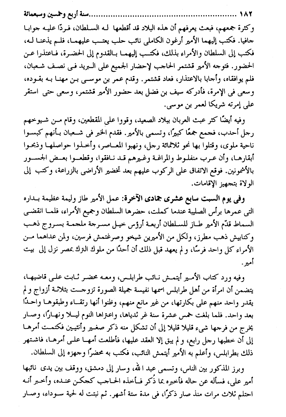 وَكَثْرَة جمعهم فَبعث يعرفهُمْ أَن هَذِه الْبِلَاد قد أقطعها لَهُ السُّلْطَان فَردا عَلَيْهِ جَوَابا جَافيا. فَكتب إِلَيْهِمَا الْأَمِير أرغون الكاملي نَائِب حلب يعتب عَلَيْهِمَا فَلم يذعنا لَهُ فَكتب إِلَى السُّلْطَان والأمراء بذلك فَكتب إِلَيْهِمَا بالقدوم إِلَى الحضرة فاعتذرا عَن الْحُضُور. فَتوجه الْأَمِير قشتمر الحاحب لإحضار الْجَمِيع على الْبَرِيد فِي نصف شعْبَان فَلم يوافقاه وأجابا بالاعتذار فَعَاد قشتمر. وَقدم عمر بن مُوسَى بن مهنا بِهِ بقوده وسعى فِي الإمرة فأدركه سيف بن فضل بعد حُضُور الْأَمِير قشتمر وسعى حَتَّى اسْتَقر على إمرته شَرِيكا لعمر بن مُوسَى. وَفِيه أَيْضا كثر عَبث العربان بِبِلَاد الصَّعِيد وقووا على المقطعين وَقَامَ من شيوخهم رجل أحدب فَجمع جمعا كَبِيرا وَتسَمى بالأمير. فَقدم الْخَبَر فِي شعْبَان بِأَنَّهُم كبسوا نَاحيَة ملوى وَقتلُوا بهَا نَحْو ثَلَاثمِائَة رجل ونهبوا المعاصر وَأخذُوا حواصلها وذبحوا أبقارها وَأَن عرب منفلوط والمراغة وَغَيرهم قد نافقوا وَقَطعُوا بعض الجسور بالأشمونين. فَوَقع الِاتِّفَاق على الرّكُوب عَلَيْهِم بعد تخضير الْأَرَاضِي بالزراعة وَكتب إِلَى الْوُلَاة بتجهيز الإقامات. وَفِي يَوْم السبت سَابِع عشرى جُمَادَى الْآخِرَة: عمل الْأَمِير طاز وَلِيمَة عَظِيمَة بداره الَّتِي عمرها بِرَأْس الصليبة عِنْدَمَا كملت حضرها السُّلْطَان وَجَمِيع الْأُمَرَاء فَلَمَّا انْقَضى السماط قدم الْأَمِير طاز للسُّلْطَان أَرْبَعَة أرؤس خيل مسرجة ملجمة بسروج ذهب وكنابيش ذهب مطرز وَلكُل من الأميرين شيخو وصرغتمش فرسين وَلمن عداهما من الْأُمَرَاء كل وَاحِد فرسا وَلم يعْهَد قبل ذَلِك أَن أحدا من مُلُوك التّرْك بِمصْر نزل إِلَى بَيت أَمِير. وَفِيه ورد كتاب الْأَمِير أيتمش نَائِب طرابلس وَمَعَهُ محْضر ثَابت على قاضيها يتَضَمَّن أَن امْرَأَة من أهل طرابلس اسْمهَا نفيسة جميلَة الصُّورَة تزوجت بِثَلَاثَة أَزوَاج وَلم يقدر وَاحِد مِنْهُم على بَكَارَتهَا من غير مَانع مِنْهُم وظنوا أَنَّهَا رتقاء وطبقوها وَاحِدًا بعد وَاحِد. فَلَمَّا بلغت خمس عشرَة سنة غر ثدياها واعتراها النّوم لَيْلًا وَنَهَارًا وَصَارَ يخرج من فرجهَا شَيْء قَلِيلا قَلِيلا إِلَى أَن تشكل مِنْهُ ذكر صَغِير وأنثيين فكتمت أمرهَا إِلَى أَن خطبهَا رجل رَابِع وَلم يبْق إِلَّا العقد عَلَيْهَا فأطلعت أمهَا على أمرهَا فاشتهر ذَلِك بطرابلس وَأعلم بِهِ الْأَمِير أيتمش النَّائِب فَكتب بِهِ محضراً وجهزه إِلَى السُّلْطَان. وبرز الْمَذْكُور بَين النَّاس وَتسَمى عبد الله وَسَار إِلَى دمشق ووقف بَين يَدي نائبها أَمِير عَليّ فَسَأَلَهُ عَن حَاله فَأخْبرهُ. بِمَا ذكر فَأَخذه الْحَاجِب كجكن عِنْده وَأخْبر أَنه احْتَلَمَ ثَلَاث مَرَّات مُنْذُ صَار ذكرا فِي مُدَّة سِتَّة أشهر. ثمَّ نَبتَت لَهُ لحية سَوْدَاء وَصَارَ