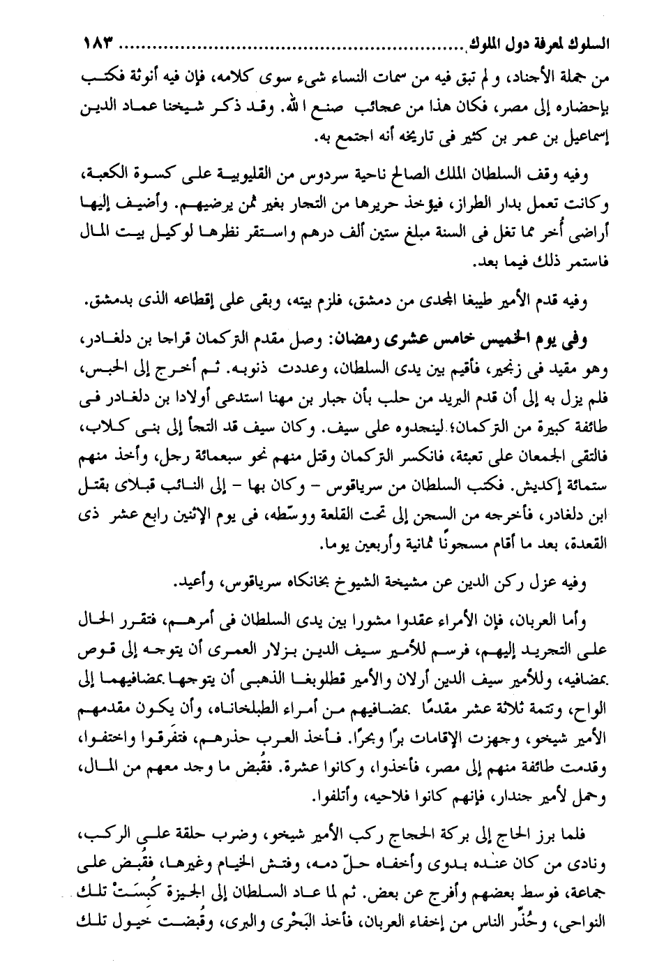 من جملَة الأجناد وَلم تبْق فِيهِ من سمات النِّسَاء شَيْء سوى كَلَامه فَإِن فِيهِ أنوثة فَكتب بإحضاره إِلَى مصر فَكَانَ هَذَا من عجائب صنع الله. وَقد ذكر شَيخنَا عماد الدّين إِسْمَاعِيل بن عمر بن كثير فِي تَارِيخه أَنه اجْتمع بِهِ. وَفِيه وقف السُّلْطَان الْملك الصَّالح نَاحيَة سردوس من القليوبية على كسْوَة الْكَعْبَة وَكَانَت تعْمل بدار الطّراز فَيُؤْخَذ حريرها من التُّجَّار بِغَيْر ثمن يرضيهم. وأضيف إِلَيْهَا أَرَاضِي أخر مِمَّا تغل فِي السّنة مبلغ سِتِّينَ ألف دِرْهَم وَاسْتقر نظرها لوكيل بَيت المَال فاستمر ذَلِك فِيمَا بعد. وَفِيه قدم الْأَمِير طيبغا المجدي من دمشق فَلَزِمَ بَيته وَبَقِي على إقطاعه الَّذِي بِدِمَشْق. وَفِي يَوْم الْخَمِيس خَامِس عشرى رَمَضَان: وصل مقدم التركمان قراجا بن دلغادر وَهُوَ مُقَيّد فِي زنجير فأقيم بَين يدى السُّلْطَان وعددت ذنُوبه. ثمَّ أخرج إِلَى الْحَبْس فَلم يزل بِهِ إِلَى أَن قدم الْبَرِيد من حلب بِأَن جَبَّار بن مهنا استدعى أَوْلَادًا بن دلغادر فِي طَائِفَة كَبِيرَة من التركمان. لينجدوه على سيف. وَكَانَ سيف قد التجأ إِلَى بني كلاب فَالتقى الْجَمْعَانِ على تعبئة فانكسر التركمان وَقتل مِنْهُم نَحْو سَبْعمِائة رجل وَأخذ مِنْهُم سِتّمائَة إكديش. فَكتب السُّلْطَان من سرياقوس - وَكَانَ بهَا - إِلَى النَّائِب قبلاي بقتل ابْن دلغادر فَأخْرجهُ من السجْن إِلَى تَحت القلعة ووسطه فِي يَوْم الْإِثْنَيْنِ رَابِع عشر ذِي الْقعدَة بعد مَا أَقَامَ مسجوناً ثَمَانِيَة وَأَرْبَعين يَوْمًا. وَفِيه عزل ركن الدّين عَن مشيخة الشُّيُوخ بخانكاه سرياقوس وأعيد. وَأما العربان فَإِن الْأُمَرَاء عقدوا مشورا بَين يَدي السُّلْطَان فِي أَمرهم فتقرر الْحَال على التَّجْرِيد إِلَيْهِم فرسم للأمير سيف الدّين بزلار الْعمريّ أَن يتَوَجَّه إِلَى قوص بمضافيه وللأمير سيف الدّين أرلان والأمير قطلوبغا الذَّهَبِيّ أَن يتوجها. بمضافيهما إِلَى أَلْوَاح وتتمة ثَلَاثَة عشر مقدما. بمضافيهم من أُمَرَاء الطبلخاناه وَأَن يكون مقدمهم الْأَمِير شيخو وجهزت الإقامات برا وبحراً. فَأخذ الْعَرَب حذرهم فَتَفَرَّقُوا واختفوا وقدمت طَائِفَة مِنْهُم إِلَى مصر فَأخذُوا وَكَانُوا عشرَة. فَقبض مَا وجد مَعَهم من المَال وَحمل لأمير جندار فَإِنَّهُم كَانُوا فلاحيه وأتلفوا. فَلَمَّا برز الْحَاج إِلَى بركَة الْحجَّاج ركب الْأَمِير شيخو وَضرب حَلقَة على الركب ونادى من كَانَ عِنْده بدوي وأخفاه حل دَمه وفتش الْخيام وَغَيرهَا فَقبض على جمَاعَة فوسط بَعضهم وَأَفْرج عَن بعض. ثمَّ لما عَاد السُّلْطَان إِلَى الجيزة كبست تِلْكَ النواحي وحذر النَّاس من إخفاء العربان فَأخذ البحري والبري وقبضت خُيُول تِلْكَ