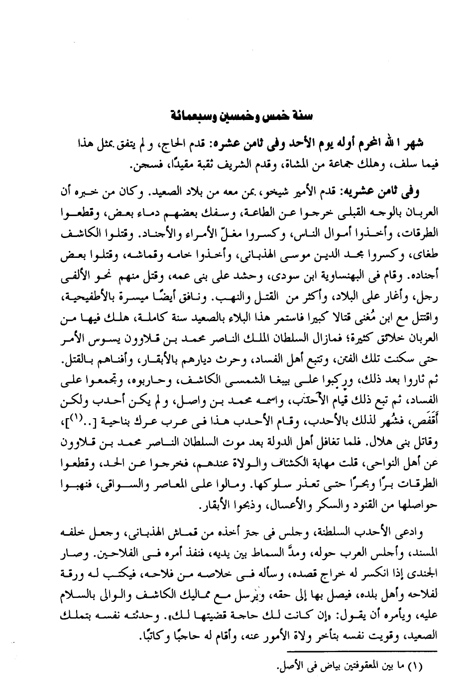 شهر الله الْمحرم أَوله يَوْم الْأَحَد وَفِي ثامن عشره: قدم الْحَاج وَلم يتَّفق بِمثل هَذَا فِيمَا سلف وَهلك جمَاعَة من المشاة وَقدم الشريف ثقبة مُقَيّدا فسجن. وَفِي ثامن عشريه: قدم الْأَمِير شيخو مِمَّن مَعَه من بِلَاد الصَّعِيد وَكَانَ من خَبره أَن العربان بِالْوَجْهِ القبلى خَرجُوا عَن الطَّاعَة وَسَفك بَعضهم دِمَاء بعض وَقَطعُوا الطرقات وَأخذُوا أَمْوَال النَّاس وكسروا مغل الْأُمَرَاء والأجناد. وَقتلُوا الكاشف طغاى وكسروا مجد الدّين مُوسَى الهذبانى وَأخذُوا خامه وقماشه وَقتلُوا بعض أجناده. وَقَامَ فِي البهنساوية ابْن سودى وحشد على بنى عَمه وَقتل مِنْهُم نَحْو الالفي رجل وأغار على الْبِلَاد وَأكْثر من الْقَتْل والنهب. ونافق أَيْضا ميسرَة بالأطفيحية واقتتل مَعَ ابْن مغنى قتالاً كَبِيرا فاستمر هَذَا الْبلَاء بالصعيد سنة كَامِلَة هلك فِيهَا من العربان خلائق كَثِيرَة فمازال السُّلْطَان الْملك النَّاصِر مُحَمَّد بن قلاوون يسوس الْأَمر حَتَّى سكنت تِلْكَ الْفِتَن وتتبع أهل الْفساد وحرث دِيَارهمْ بالأبقار وأفناهم بِالْقَتْلِ. ثمَّ ثَارُوا بعد ذَلِك وركبوا على بيبغا الشمسى الكاشف وحاربوه وتجمعوا على الْفساد ثمَّ تبع ذَلِك قيام الأحدب واسْمه مُحَمَّد بن وَاصل وَلم يكن أحدب وَلَكِن أقفص فشهر لذَلِك بالأحدب وَقَامَ الأحدب هَذَا فِي عرب عَرك بِنَاحِيَة وَقَاتل بنى هِلَال. فَلَمَّا تغافل أهل الدولة بعد موت السُّلْطَان النَّاصِر مُحَمَّد بن قلاوون عَن أهل النواحي قلت مهابة الْكَشَّاف والولاة عِنْدهم فَخَرجُوا عَن الْحَد وَقَطعُوا الطرقات برا وبحراً حَتَّى تعذر سلوكها. ومالوا على المعاصر والسواقي فنهبوا حواصلها من القنود وَالسكر والأعسال وذبحوا الأبقار. وَادّعى الأحدب السلطنة وَجلسَ فِي جتر أَخذه من قماش الهذبانى وَجعل خَلفه الْمسند وأجلس الْعَرَب حوله وَمد السماط بَين يَدَيْهِ فنفذ أمره فِي الفلاحين. وَصَارَ الجندي إِذا انْكَسَرَ لَهُ خراج قَصده وساله فِي خلاصه من فلاحه فَيكْتب لهورقة لفلاحه وَأهل بَلَده فيصل بهَا إِلَى حَقه وَيُرْسل مَعَ مماليك الكاشف والوالي بِالسَّلَامِ عَلَيْهِ ويأمره أَن يَقُول: إِن كَانَت لَك حَاجَة قضيتها لَك. وحدثته نَفسه بتملك الصَّعِيد وقويت نَفسه بتأخر وُلَاة الْأُمُور عَنهُ وَأقَام لَهُ حاجباً وكاتباً.