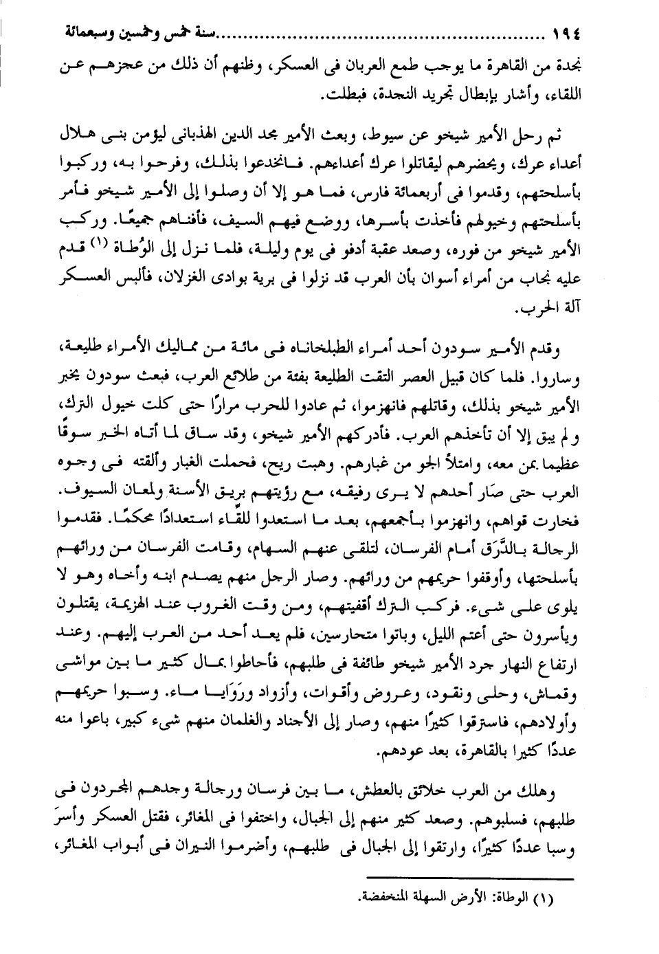 نجدة من الْقَاهِرَة مَا يُوجب طمع العربان فِي الْعَسْكَر وظنهم أَن ذَلِك من عجزهم عَن اللِّقَاء وَأَشَارَ بِإِبْطَال تَجْرِيد النجدة فبطلت. ثمَّ رَحل الْأَمِير شيخو عَن سيوط وَبعث الْأَمِير مجد الدّين الهذبانى ليؤمن بنى هِلَال أَعدَاء عَرك ويحضرهم لِيُقَاتِلُوا عَرك أعداءهم. فانخدعوا بذلك وفرحوا بِهِ وركبوا بأسلحتهم وَقدمُوا فِي أَرْبَعمِائَة فَارس فَمَا هُوَ الا أَن وصلوا إِلَى الْأَمِير شيخو فَأمر بأسلحتهم وخيولهم فَأخذت بأسرها وَوضع فيهم السَّيْف فأفناهم جَمِيعًا. وَركب الْأَمِير شيخو من فوره وَصعد عقبَة أدفو فِي يَوْم وَلَيْلَة فَلَمَّا نزل إِلَى الوطاة قدم عَلَيْهِ نجاب من أُمَرَاء أسوان بِأَن الْعَرَب قد نزلُوا فِي بَريَّة بوادي الغزلان فالبس الْعَسْكَر الة الْحَرْب. وَقدم الْأَمِير سودون أحد أمرأء الطبلخاناه فِي مائَة من مماليك الْأُمَرَاء طَلِيعَة وَسَارُوا. فَلَمَّا كَانَ قبيل الْعَصْر الْتَقت الطليعة بفئة من طلائع الْعَرَب فَبعث سودون يخبر الْأَمِير شيخو بذلك وَقَاتلهمْ فَانْهَزَمُوا ثمَّ عَادوا للحرب مرَارًا حَتَّى كلت خُيُول التّرْك وَلم يبْق الا أَن تأخذهم الْعَرَب. فأدركهم الْأَمِير شيخو وَقد سَاق لما أَتَاهُ الْخَبَر سوقاً عَظِيما مِمَّن مَعَه وامتلأ الجو من غبارهم. وهبت ريح فَحملت الْغُبَار والقته فِي وُجُوه الْعَرَب حَتَّى صَار أحدهم لَا يرى رَفِيقه مَعَ رُؤْيَتهمْ بريق الأسنة ولمعان السيوف. فخارت قواهم وانهزموا بأجمعهم بعد مَا اسْتَعدوا للقاء اسْتِعْدَادًا محكماً. فقدموا الرجالة بالدرق أَمَام الفرسان لتلقى عَنْهُم السِّهَام وَقَامَت الفرسان من ورائهم بأسلحتها وأوقفوا حريمهم من ورائهم. وَصَارَ الرجل مِنْهُم يصدم ابْنه وأخاه وَهُوَ لَا يلوى على شَيْء. فَركب التّرْك أقفيتهم وَمن وَقت الْغُرُوب عِنْد الْهَزِيمَة يقتلُون وَيَأْسِرُونَ حَتَّى أعتم اللَّيْل وَبَاتُوا متحارسين فَلم يعد أحد من الْعَرَب اليهم. وَعند ارْتِفَاع النَّهَار جرد الْأَمِير شيخو طَائِفَة فِي طَلَبهمْ فأحاطوا بِمَال كثير مَا بَين مواشي وقماش وحلى ونقود وعروض وأقوات وأزواد وروايا مَاء. وَسبوا حريمهم وَأَوْلَادهمْ فاسترقوا كثيرا مِنْهُم وَصَارَ إِلَى الأجناد والغلمان مِنْهُم شَيْء كَبِير باعوا مِنْهُ عددا كثيرا بِالْقَاهِرَةِ بعد عودهم. وَهلك من الْعَرَب خلائق بالعطش مَا بَين فرسَان ورجالة وجدهم المجردون فِي طَلَبهمْ فسلبوهم. وَصعد كثير مِنْهُم إِلَى الْجبَال واختفوا فِي المغائر فَقتل الْعَسْكَر وَأسر وسبا عددا كثيرا وارتقوا إِلَى الْجبَال فِي طَلَبهمْ وأضرمرا النيرَان فِي أَبْوَاب المغائر