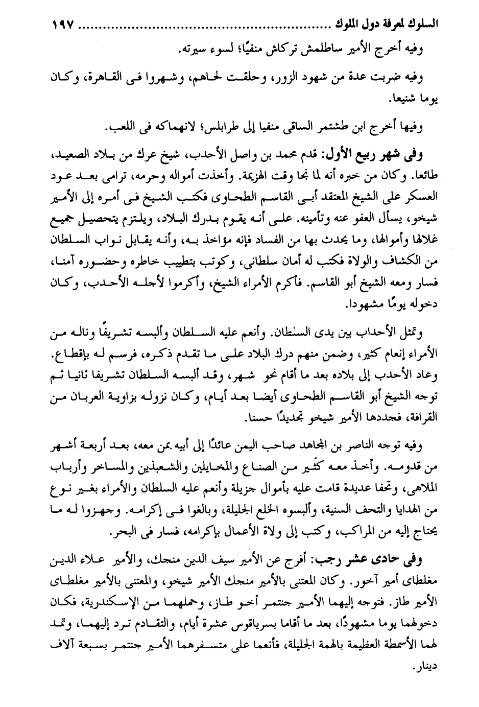 وَفِيه أخرج الْأَمِير ساطلمش تركاش منفياً لسوء سيرته. وَفِيه ضربت عدَّة من شُهُود الزُّور وحلقت لحاهم وشهروا فِي الْقَاهِرَة وَكَانَ يَوْمًا شنيعاً. وفيهَا أخرج ابْن طشتمر الساقي منفياً إِلَى طرابلس لانهماكه فِي اللّعب. وَفِي شهر ربيع الأول: قدم مُحَمَّد بن وَاصل الأحدب شيخ عَرك من بِلَاد الصَّعِيد طَائِعا. وَكَانَ من خَبره أَنه لما نجا وَقت الْهَزِيمَة. وَأخذت أَمْوَاله وَحرمه ترامى بعد عود الْعَسْكَر على الشَّيْخ المعتقد أَبى الْقَاسِم الطحاوى فَكتب الشَّيْخ فِي أمره إِلَى الْأَمِير شيخو يسال الْعَفو عَنهُ وتأمينه. على أَنه يقوم بدرك الْبِلَاد ويلتزم بتحصيل جَمِيع غلالها وأموالها وَمَا يحدث بهَا من الْفساد فَإِنَّهُ مواخذ بِهِ وَأَنه يُقَابل نواب السُّلْطَان من الْكَشَّاف والولاة فَكتب لَهُ أَمَان سلطاني وكوتب بتطييب خاطره وحضوره أمنا فَسَار وَمَعَهُ الشَّيْخ أَبُو الْقَاسِم. فَأكْرم الْأُمَرَاء الشَّيْخ وأكرموا لأَجله الأحدب وَكَانَ دُخُوله يَوْمًا مشهوداً. وتمثل الأحداب بَين يَدي السُّلْطَان. وأنعم عَلَيْهِ السُّلْطَان والبسه تَشْرِيفًا وناله من الْأُمَرَاء إنعام كثير وَضمن مِنْهُم دَرك الْبِلَاد على مَا تقدم ذكره فرسم لَهُ بإقطاع. وَعَاد الأحدب إِلَى بِلَاده بعد مَا أَقَامَ نَحْو شهر وَقد البسه السُّلْطَان تَشْرِيفًا ثَانِيًا ثمَّ توجه الشَّيْخ أَبُو الْقَاسِم الطَّحَاوِيّ أَيْضا بعد أَيَّام وَكَانَ نُزُوله بزاوية العربان من القرافة فجددها الْأَمِير شيخو تجديداً حسنا. وَفِيه توجه النَّاصِر بن الْمُجَاهِد صَاحب الْيمن عَائِدًا إِلَى أَبِيه بِمن مَعَه بعد أَرْبَعَة أشهر من قدومه. وَأخذ مَعَه كثير من الصناع والمخايلين والشعبذين والمساخر وأرباب الملاهى وتحفا عديدة قَامَت عَلَيْهِ بأموال جزيلة وأنعم عَلَيْهِ السُّلْطَان والأمراء بِغَيْر نوع من الْهَدَايَا والتحف السّنيَّة والبسوه الْخلْع الجليلة وبالغوا فِي إكرامه. وجهروا لَهُ مَا يحْتَاج اليه من المراكب وَكتب إِلَى وَفِي حادي عشر رَجَب: أفرج عَن الْأَمِير سيف الدّين منجك والأمير عَلَاء الدّين مغلطاي أَمِير أخور. وَكَانَ المعتنى بالأمير منجك الْأَمِير شيخو والمعتنى بالأمير مغلطاي الْأَمِير طاز. فَتوجه اليهما الْأَمِير جنتمر أَخُو طاز وحملهما من الْإسْكَنْدَريَّة فَكَانَ دخولهما يَوْمًا مشهوداً بعد مَا أَقَامَا بسرياقوس عشرَة أَيَّام والتقادم ترد اليهما وتمد لَهما الأسمطة الْعَظِيمَة بالهمة الجليلة فانعما على متسفرهما الْأَمِير جنتمر بسبعة الاف دِينَار.