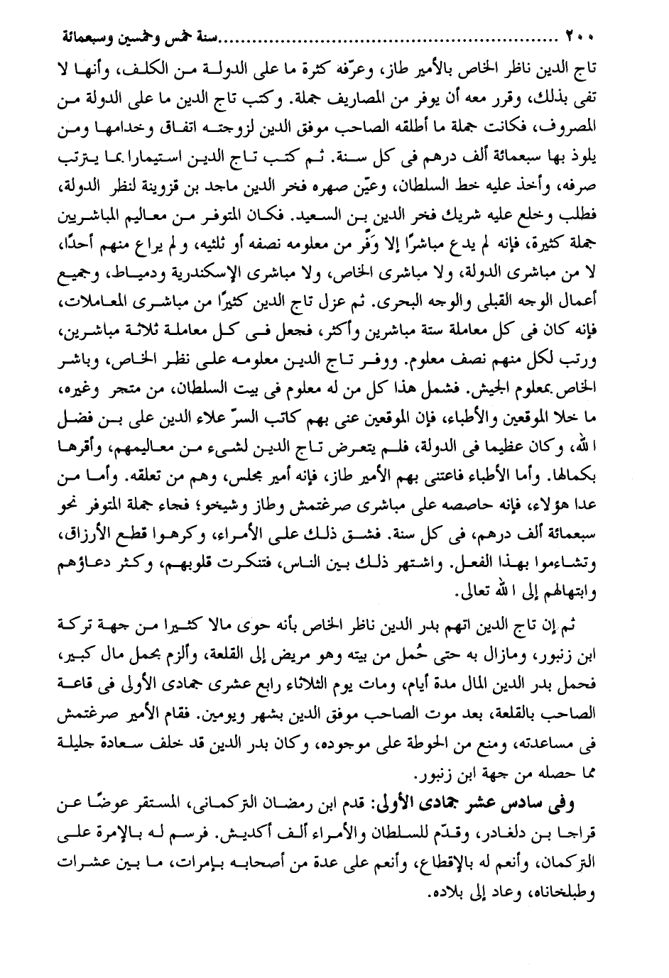 تَاج الدّين نَاظر الْخَاص بالأمير طاز وعرفه كَثْرَة مَا على الدولة من الكلف وَأَنَّهَا لَا تفى بذلك وَقرر مَعَه أَن يوفر من المصاريف جلة. وَكتب تَاج الدّين مَا على الدولة من المصروف فَكَانَت جملَة مَا أطلقهُ الصاحب موفق الدّين لزوجته اتِّفَاق وخدامها وَمن يلوذ بهَا سَبْعمِائة ألف دِرْهَم فِي كل سنة. ثمَّ كتب تَاج الدّين استيمارا بِمَا يَتَرَتَّب صرفه وَأخذ عَلَيْهِ خطّ السُّلْطَان وَعين صهره فَخر الدّين ماجد بن قزوينة لنظر الدولة فَطلب وخلع عَلَيْهِ شريك فَخر الدّين بن السعيد. فَكَانَ المتوفر من معاليم المباشريين جملَة كَثِيرَة فَإِنَّهُ لم يدع مباشراً الا وفر من معلومه نصفه أَو ثُلثَيْهِ وَلم يراع مِنْهُم أحدا لَا من مباشرى الدولة وَلَا مباشرى الْخَاص وَلَا مباشرى الْإسْكَنْدَريَّة ودمياط وجيع أَعمال الْوَجْه القبلى وَالْوَجْه البحرى. ثمَّ عزل تَاج الدّين كثيرا من مباشرى الْمُعَامَلَات فَإِنَّهُ كَانَ فِي كل مُعَاملَة سِتَّة مباشرين وَأكْثر فَجعل فِي كل مُعَاملَة ثَلَاثَة مباشرين ورتب لكل مِنْهُم نصف مَعْلُوم. ووفر تَاج الدّين معلومه على نظر الْخَاص وباشر الْخَاص بِمَعْلُوم الْجَيْش. فَشَمَلَ هَذَا كل من لَهُ مَعْلُوم فِي بَيت السُّلْطَان من متجر وَغَيره مَا خلا الموقعين والأطباء فَإِن الموقعين عَنى بهم كَاتب السِّرّ عَلَاء الدّين على بن فضل الله وَكَانَ عَظِيما فِي الدولة فَلم يتَعَرَّض تَاج الدّين لشَيْء من معاليمهم وأقرها بكمالها. وَأما الْأَطِبَّاء فاعتنى بهم الْأَمِير طاز فانه أَمِير مجْلِس وهم من تعلقه. وَأما من عدا هَؤُلَاءِ فَإِنَّهُ حاصصه على مباشرى صرغتمش وطاز وشيخو فجَاء جملَة المتوفر نَحْو سَبْعمِائة ألف دِرْهَم فِي كل سنة. فشق ذَلِك على الْأُمَرَاء وكرهوا قطع الأرزاق وتشاءموا بِهَذَا الْفِعْل. واشتهر ذَلِك بَين النَّاس فَتَنَكَّرت قُلُوبهم وَكثر دعاؤهم وابتهالهم إِلَى الله تَعَالَى. ثمَّ إِن تَاج الدّين اتهمَ بدر الدّين نَاظر الْخَاص بِأَنَّهُ حوى مَالا كثيرا من جِهَة تَرِكَة ابْن زنبور ومازال بِهِ حَتَّى حمل من بَيته وَهُوَ مَرِيض إِلَى القلعة والزم بِحمْل مَال كَبِير فَحمل بدر الدّين المَال مُدَّة أَيَّام وَمَات يَوْم الثُّلَاثَاء رَابِع عشرى جُمَادَى الأولى فِي قاعة الصاحب بالقلعة بعد موت الصاحب موفق الدّين بِشَهْر ويومين. فَقَامَ الْأَمِير صرغتمش فِي مساعدته وَمنع من الحوطة على موجوده وَكَانَ بدر الدّين قد خلف سَعَادَة جليلة مِمَّا حصله من جِهَة ابْن زنبور. وَفِي سادس عشر جُمَادَى الأولى: قدم ابْن رَمَضَان التركمانى المستقر عوضا عَن قراجا بن دلغادر وَقدم للسُّلْطَان والأمراء ألف أكديش. فرسم لَهُ بالإمرة على التركمان وأنعم لَهُ بالإقطاع وأنعم على عدَّة من أَصْحَابه بإمرات مَا بَين عشرات وطبلخاناه وَعَاد إِلَى بِلَاده.