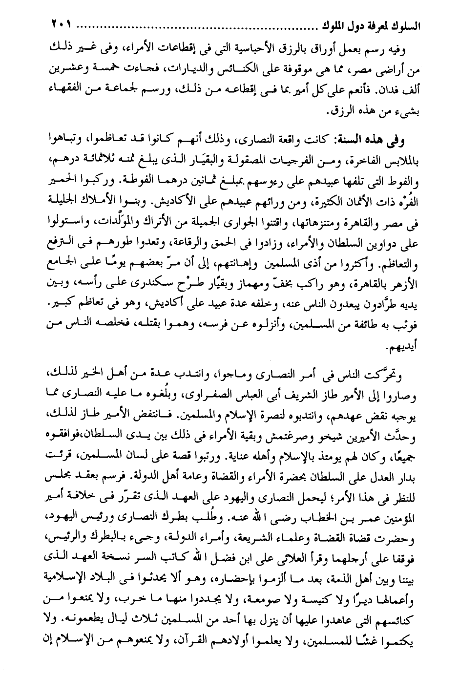 وَفِيه رسم بِعَمَل أوراق بالرزق الأحباسيه الَّتِي فِي إقطاعات الْأُمَرَاء وَفِي غير ذَلِك من أَرَاضِي مصر مِمَّا هِيَ مَوْقُوفَة على الْكَنَائِس والديارات فَجَاءَت خَمْسَة وَعشْرين ألف فدان. فأنعم وَفِي هَذِه السّنة: كَانَت وَاقعَة النَّصَارَى وَذَلِكَ أَنهم كَانُوا قد تعاظموا وتباهوا بالملابس الفاخرة وَمن الفرجيات المصقولة والبقيار الَّذِي يبلع ثمنه ثَلَاثمِائَة دِرْهَم والفرط الَّتِي تلفهَا عبيدهم على رؤوسهم. بمبلغ ثَمَانِينَ درهما الفوطة. وركبوا الْحمير الفره ذَات الْأَثْمَان الْكَثِيرَة وَمن ورائهم عبيدهم على الأكاديش. وبنوا الْأَمْلَاك الجليلة فِي مصر والقاهرة ومتنزهاتها واقتنوا الْجَوَارِي الجميلة من الأتراك والمولدات واستولوا على دواوين السُّلْطَان والأمراء وَزَادُوا فِي الْحمق والرقاعة وتعدوا طورهم فِي الترفع والتعاظم. وَأَكْثرُوا من أذي الْمُسلمين وإهانتهم إِلَى أَن مر بَعضهم يَوْمًا على الْجَامِع الْأَزْهَر بِالْقَاهِرَةِ وَهُوَ رَاكب بخف ومهماز وبقيار طرح سكندرى على رَأسه وَبَين يَدَيْهِ طرادون يبعدون النَّاس عَنهُ وَخَلفه عدَّة عبيد على أكاديش وَهُوَ فِي تعاظم كَبِير. فَوَثَبَ بِهِ طَائِفَة من الْمُسلمين وأنزلوه عَن فرسه وهموا بقتْله فخلصه النَّاس من أَيْديهم. وتحركت النَّاس فِي أَمر النَّصَارَى وماجوا وانتدب عدَّة من أهل الْخَيْر لذَلِك وصاروا إِلَى الْأَمِير طاز الشريف أَبى الْعَبَّاس الصفراوي وبلغوه مَا عَلَيْهِ النَّصَارَى مِمَّا يُوجِبهُ نقض عَهدهم وانتدبوه لنصرة الْإِسْلَام وَالْمُسْلِمين. فانتفض الْأَمِير طاز لذَلِك وَحدث الاصرين شيخو وصرغتمش وَبَقِيَّة الْأُمَرَاء فِي ذَلِك بَين يَدي السُّلْطَان فوافقوه جَمِيعًا وَكَانَ لَهُم يَوْمئِذٍ بِالْإِسْلَامِ وَأَهله عناية. ورتبوا قصَّة على لِسَان الْمُسلمين قُرِئت بدار الْعدْل على السُّلْطَان بِحَضْرَة الْأُمَرَاء والقضاة وَعَامة أهل الدولة. فرسم بِعقد مجْلِس للنَّظَر فِي هَذَا الْأَمر ليحمل النَّصَارَى وَالْيَهُود على الْعَهْد الَّذِي تقرر فِي خلَافَة أَمِير الْمُؤمنِينَ عمر بن الْخطاب رَضِي الله عَنهُ. وَطلب بطرك النَّصَارَى وَرَئِيس الْيَهُود وَحَضَرت قُضَاة الْقُضَاة وعلماء الشَّرِيعَة وأمراء الدولة وجىء بالبطرك والرئيس فوقفا على أرجلهما وَقَرَأَ العلائى على ابْن فضل الله كَاتب السِّرّ نُسْخَة الْعَهْد الَّذِي بَيْننَا وَبَين أهل الذِّمَّة بعد مَا الزموا بإحضاره وَهُوَ الا يحدثوا فِي الْبِلَاد الإسلامية وأعمالها ديراً وَلَا كَنِيسَة وَلَا صومعة وَلَا يجددوا مِنْهَا مَا خرب وَلَا يمنعوا من كنائسهم الَّتِي عَاهَدُوا عَلَيْهَا أَن ينزل بهَا أحد من الْمُسلمين ثَلَاث لَيَال يطعمونه. وَلَا يكتموا غشاً للْمُسلمين وَلَا يعلمُوا أَوْلَادهم الْقُرْآن وَلَا يمنعوهم من الْإِسْلَام إِن
