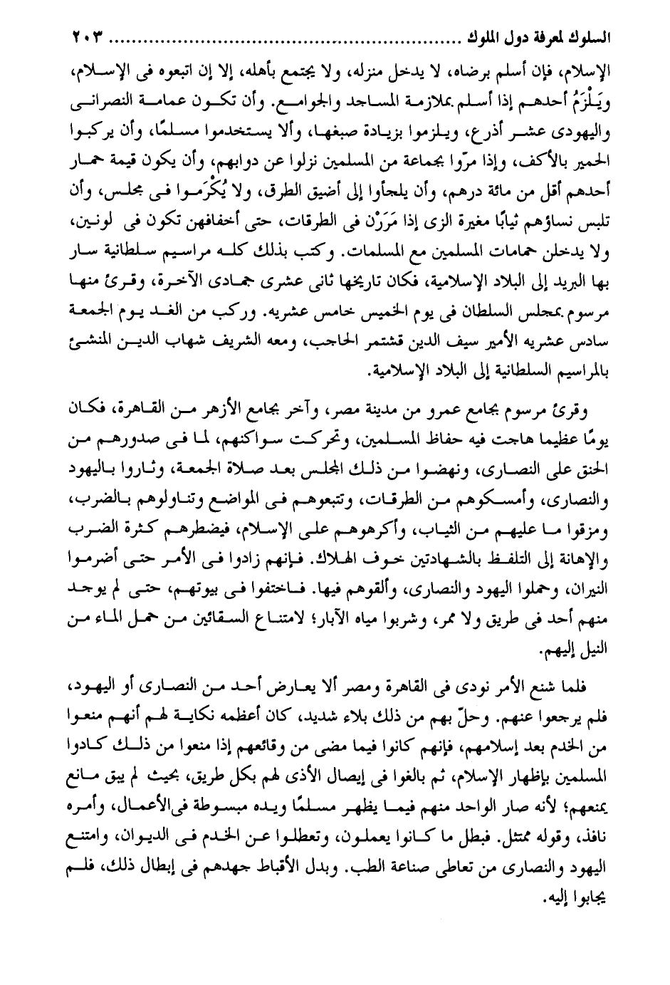 الْإِسْلَام فَإِن أسلم بِرِضَاهُ لَا يدْخل منزله وَلَا يجْتَمع بأَهْله الا إِن اتَّبعُوهُ فِي الْإِسْلَام وَيلْزم أحدهم إِذا أسلم. بملازمة الْمَسَاجِد والجوامع. وَأَن تكون عِمَامَة النَّصْرَانِي واليهودي عشر أَذْرع ويلزموا بِزِيَادَة صبغها والا يستخدموا مُسلما وَأَن يركبُوا الْحمير بالآكل وَإِذا مروا بِجَمَاعَة من الْمُسلمين نزلُوا عَن دوابهم وَأَن يكون قيمَة حمَار أحدهم أقل من مائَة دِرْهَم وَأَن يلجأوا إِلَى أضيق الطّرق وَلَا يكرموا فِي مجْلِس وَأَن تلبس نِسَاؤُهُم ثيابًا مُغيرَة الزي إِذا مررن فِي الطرقات حَتَّى أخفافهن تكون فِي لونين وَلَا يدخلن حمامات الْمُسلمين مَعَ المسلمات. وَكتب بذلك كُله مراسيم سلطانية سَار بهَا الْبَرِيد إِلَى الْبِلَاد الإسلامية فَكَانَ تاريخها ثَانِي عشري جُمَادَى الْآخِرَة وقرىء مِنْهَا مرسوم. بِمَجْلِس السُّلْطَان فِي يَوْم الْخَمِيس خَامِس عشريه. وَركب من الْغَد يَوْم الْجُمُعَة سادس عشريه الْأَمِير سيف الدّين وقرىء مرسوم بِجَامِع عَمْرو من مَدِينَة مصر وَآخر بِجَامِع الْأَزْهَر من الْقَاهِرَة فَكَانَ يَوْمًا عَظِيما هَاجَتْ فِيهِ حفاظ الْمُسلمين وتحركت سواكنهم لما فِي صُدُورهمْ من الحنق على النَّصَارَى ونهضوا من ذَلِك الْمجْلس بعد صَلَاة الْجُمُعَة وثاروا باليهود وَالنَّصَارَى وأمسكوهم من الطرقات وتتبعوهم فِي الْمَوَاضِع وتناولوهم بِالضَّرْبِ ومزقوا مَا عَلَيْهِم من الثِّيَاب وأكرهوهم على الْإِسْلَام فيضطرهم كَثْرَة الضَّرْب والإهانة إِلَى التَّلَفُّظ بِالشَّهَادَتَيْنِ خوف الْهَلَاك. فَإِنَّهُم زادوا فِي الْأَمر حَتَّى أضرموا النيرَان وحملوا الْيَهُود وَالنَّصَارَى والقوهم فِيهَا. فاختفوا فِي بُيُوتهم حَتَّى لم يُوجد مِنْهُم أحد فِي طَرِيق وَلَا ممر وَشَرِبُوا مياه الْآبَار لِامْتِنَاع السقائين من حمل المَاء من النّيل اليهم. فَلَمَّا شنع الْأَمر نُودي فِي الْقَاهِرَة ومصر الا يُعَارض أحد من النَّصَارَى أَو الْيَهُود فَلم يرجِعوا عَنْهُم. وَحل بهم من ذَلِك بلَاء شَدِيد كَانَ أعظمه نكاية لَهُم أَنهم منعُوا من الخدم بعد إسْلَامهمْ فَإِنَّهُم كَانُوا فِيمَا مضى من وقائعهم إِذا منعُوا من ذَلِك كَادُوا الْمُسلمين لإِظْهَار الْإِسْلَام ثمَّ بالغوا فِي إِيصَال الأذي لَهُم بِكُل طَرِيق بِحَيْثُ لم يبْق مَانع يمنعهُم لِأَنَّهُ صَار الْوَاحِد مِنْهُم فِيمَا يظْهر مُسلما وَيَده مبسوطة فِي الْأَعْمَال وَأمره نَافِذ وَقَوله ممتثل. فَبَطل مَا كَانُوا يعْملُونَ وتعطلوا عَن الخدم فِي الدِّيوَان وَامْتنع الْيَهُود وَالنَّصَارَى من تعاطى صناعَة الطِّبّ. وَبدل الأقباط ذَلِك فَلم يجابوا إِلَيْهِ.