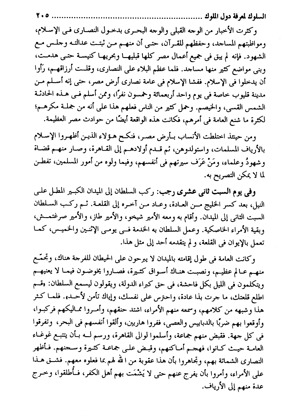 وَكَثُرت الْأَخْبَار من الْوَجْه القبلي وَالْوَجْه البحري بِدُخُول النَّصَارَى فِي الْإِسْلَام ومواظبتهم الْمَسَاجِد وحفظهم لِلْقُرْآنِ حَتَّى أَن مِنْهُم من ثبتَتْ عَدَالَته وَجلسَ مَعَ الشُّهُود. فَإِنَّهُ لم يبْق فِي جَمِيع أَعمال مصر كلهَا قبليها وبحريها كَنِيسَة حَتَّى هدمت وَبنى مَوَاضِع كثير مِنْهَا مَسَاجِد. فَلَمَّا عظم الْبلَاء على النَّصَارَى وَقلت أَرْزَاقهم رَأَوْا أَن يدخلُوا فِي الْإِسْلَام. فَفَشَا الْإِسْلَام فِي عَامَّة نَصَارَى أَرض مصر حَتَّى أَنه أسلم من مَدِينَة قليوب خَاصَّة فِي يَوْم وَاحِد أَرْبَعمِائَة وَخَمْسُونَ نَفرا وَمِمَّنْ أسلم فِي هَذِه الْحَادِثَة الشَّمْس القسى والخيصم. وَحمل كثير من النَّاس فعلهم هَذَا على أَنه من جملَة مَكْرهمْ لِكَثْرَة مَا شنع الْعَامَّة فِي أَمرهم فَكَانَت هَذِه الْوَاقِعَة أَيْضا من حوادث مصر الْعَظِيمَة. وَمن حِينَئِذٍ اخْتلطت الْأَنْسَاب بِأَرْض مصر فنكح هَؤُلَاءِ الَّذين أظهرُوا الْإِسْلَام بالأرياف المسلمات واستولدوهن ثمَّ قدم أَوْلَادهم إِلَى الْقَاهِرَة وَصَارَ مِنْهُم قُضَاة وشهود وعلماء وَمن عرف سيرتهم فِي أنفسهم وَفِيمَا ولوه من أُمُور الْمُسلمين تفطن لما لَا يُمكن التَّصْرِيح بِهِ. وَفِي يَوْم السبت ثَانِي عشري رَجَب: ركب السُّلْطَان إِلَى الميدان الْكَبِير المطل على النّيل بعد كسر الخليج من الْعَادة وَعَاد من أَخّرهُ إِلَى القلعة. ثمَّ ركب السُّلْطَان السبت الثَّانِي إِلَى الميدان. وأقامبه وَمَعَهُ الْأَمِير شيخو والأمير طاز والأمير صرغتمش وَبَقِيَّة الْأُمَرَاء الخاصكية. وَعمل السُّلْطَان بِهِ الْخدمَة فِي يومي الْإِثْنَيْنِ وَالْخَمِيس كَمَا تعْمل بالإيوان فِي القلعة وَلم يتقدمه أحد إِلَى مثل هَذَا. مِنْهُم عَالم عَظِيم ونصبت هُنَاكَ أسواق كَثِيرَة فصاروا يَخُوضُونَ فِيمَا لَا يعنيهم ويتكلمون فِي اللَّيْل بِكُل فَاحِشَة فِي حق كبراء الدولة وَيَقُولُونَ ليسمع السُّلْطَان: قُم اطلع قلعتك مَا جرت بذا عَادَة واحترس على نَفسك وَإِيَّاك تأمن لأحد. فَلَمَّا كثر هَذَا وَشبهه من كَلَامهم وسَمعه مِنْهُم الْأُمَرَاء اشْتَدَّ حنقهم وَأمرُوا مماليكهم فَرَكبُوا وأوقعوا بهم ضربا بالدبابيس والعصى فَفرُّوا هاربين والقوا أنفسهم فِي الْبَحْر وَتَفَرَّقُوا فِي كل جِهَة. فَقبض مِنْهُم جمَاعَة وَأَسْلمُوا لوالى الْقَاهِرَة ورسم لَهُ بِأَن يتتبع غوغاء الْعَامَّة حَيْثُ كَانُوا فهجم أماكنهم وَقبض على جمَاعَة كَثِيرَة وسجنهم. فاظهر النَّصَارَى الشماتة بهم وتجاهروا بِأَن هَذَا عُقُوبَة من الله لَهُم بِمَا فَعَلُوهُ مَعَهم. فشق هَذَا على الْأُمَرَاء وَأمرُوا بِأَن يفرج عَنْهُم حَتَّى لَا يشمت بهم أهل الْكفْر فأطلقوا وَخرج عدَّة مِنْهُم إِلَى الأرياف.