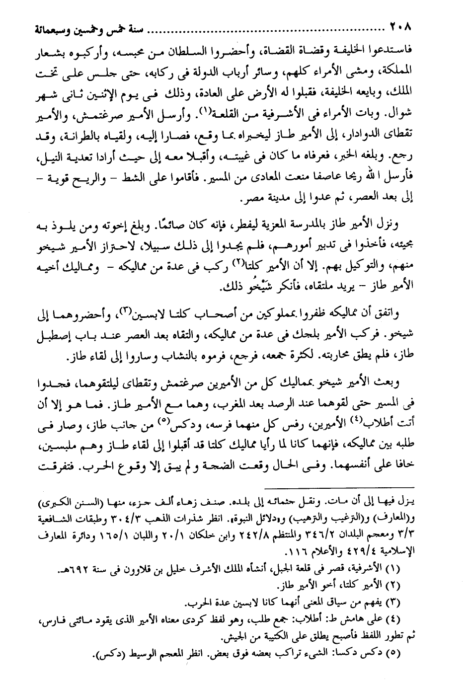 فاستدعوا الْخَلِيفَة وقضاة الْقُضَاة وأحضروا السُّلْطَان من محبسه وأركبوه بشعار المملكة وَمَشى الْأُمَرَاء كلهم وَسَائِر أَرْبَاب الدولة فِي ركابه حَتَّى جلس على تخت الْملك وَبَايَعَهُ الْخَلِيفَة فقبلوا لَهُ الأَرْض على الْعَادة وَذَلِكَ فِي يَوْم الْإِثْنَيْنِ ثَانِي شهر شَوَّال. وَبَات الْأُمَرَاء فِي الأشرفية من القلعة. وَأرْسل الْأَمِير صرغتمش والأمير تقطاى الدوادار إِلَى الْأَمِير طاز ليخبراه. مِمَّا وَقع فصارا اليه ولقياه بالطرانة وَقد رَجَعَ. وبلغه الْخَبَر فعرفاه مَا كَانَ فِي غيبته وأقبلا مَعَه إِلَى حَيْثُ أَرَادَا تَعديَة النّيل فَأرْسل الله ريحًا عاصفاً منعت المعادى من الْمسير. وَنزل الْأَمِير طاز بِالْمَدْرَسَةِ المعزية ليفطر فَإِنَّهُ كَانَ صَائِم. وَبلغ إخْوَته وَمن يلوذ بِهِ مَجِيئه فَأخذُوا فِي تَدْبِير أُمُورهم فَلم يَجدوا إِلَى ذَلِك سَبِيلا لاحتراز الْأَمِير شيخو مِنْهُم وَالتَّوْكِيل بهم. الا أَن الْأَمِير كلتا ركب فِي عدَّة من مماليكه - ومماليك أَخِيه الْأَمِير طاز - يُرِيد ملتقاه فَأنْكر شيخو ذَلِك. وَاتفقَ أَن مماليكه ظفروا. بمملوكين من أَصْحَاب كلتا لابسين وأحضروهما إِلَى شيخو. فَركب الْأَمِير بلجك فِي عدَّة من مماليكه والتقاه بعد الْعَصْر عِنْد بَاب اصطبل طاز فَلم يطق محاربته. لِكَثْرَة جمعه فَرجع فَرَمَوْهُ بالنشاب وَسَارُوا إِلَى لِقَاء طاز. وَبعث الْأَمِير شيخو. بمماليك كل من الاصرين صرغتمش وتقطاى ليلتقوهما فجدوا فِي الْمسير حَتَّى لقوهما عِنْد الرصد بعد الْمغرب وهما مَعَ الْأَمِير طاز. فَمَا هُوَ الا أَن أَتَت أطلاب الاصرين رفس كل مِنْهُمَا فرسه ودكس من جَانب طاز وَصَارَ فِي طلبه بَين مماليكه فَإِنَّهُمَا كَانَا لما رَأيا مماليك كلتا قد أَقبلُوا إِلَى لِقَاء طاز وهم ملبسين خافا على أَنفسهمَا. وَفِي الْحَال وَقعت الضجة وَلم يبْق الا وُقُوع الْحَرْب. فتفرقت