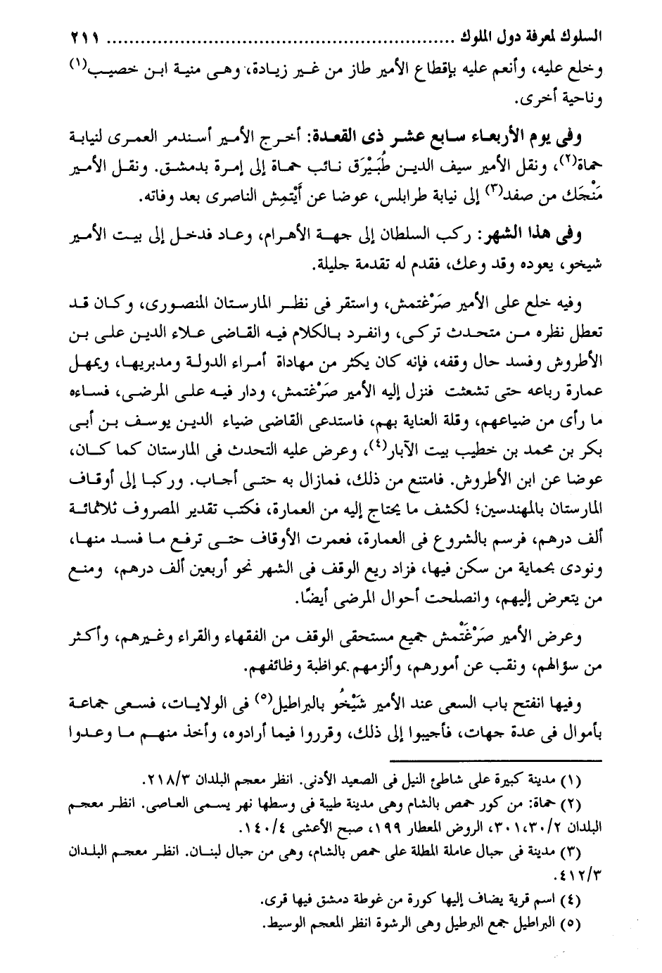 وخلع عَلَيْهِ وأنعم عَلَيْهِ بإقطاع الْأَمِير طاز من غير زِيَادَة وَهِي منية ابْن خصيب وناحية أُخْرَى. وَفِي يَوْم الْأَرْبَعَاء سَابِع عشر ذِي الْقعدَة: أخرج الْأَمِير أسندمر الْعُمْرَى لنيابة حماة وَنقل الْأَمِير سيف الدّين طبيرق نَائِب حماة إِلَى إمرة بِدِمَشْق. وَنقل الْأَمِير منجك من صفد إِلَى نِيَابَة طرابلس عوضا عَن أيتمش الناصري بعد وَفَاته. وَفِي هَذَا الشَّهْر: ركب السُّلْطَان إِلَى جِهَة الأهرام وَعَاد فَدخل إِلَى بَيت الْأَمِير شيخو يعودهُ وَقد وعك فَقدم لَهُ تقدمة جليلة. وَفِيه خلع على الْأَمِير صرغتمش وَاسْتقر فِي نظر المارستان المنصوري وَكَانَ قد تعطل نظره من متحدث تركي وَانْفَرَدَ بالْكلَام فِيهِ القَاضِي عَلَاء الدّين على بن الأطروش وَفَسَد حَال وَقفه فَإِنَّهُ كَانَ يكثر من مهاداة أُمَرَاء الدولة ومدبريها ويمهل عمَارَة رباعه حَتَّى تشعثت فَنزل اليه الْأَمِير صرغتمش وَدَار فِيهِ على المرضى فساءه مَا رأى من ضياعهم وَقلة الْعِنَايَة بهم فاستدعى القَاضِي ضِيَاء الدّين يُوسُف بن أَبى بكر بن مُحَمَّد بن خطيب بَيت الْآبَار وَعرض عَلَيْهِ التحدث فِي المارستان كَمَا كَانَ عوضا عَن ابْن الأطروش. فَامْتنعَ من ذَلِك فمازال بِهِ حَتَّى أجَاب. وركبا إِلَى أوقاف المارستان بالمهندسين لكشف مَا يحْتَاج اليه من الْعِمَارَة فَكتب تَقْدِير المصروف ثَلَاثمِائَة ألف دِرْهَم فرسم بِالشُّرُوعِ فِي الْعِمَارَة فعمرت الْأَوْقَاف حَتَّى ترفع مَا فسد مِنْهَا ونودى بحمايه من سكن فِيهَا فَزَاد ريع الْوَقْف فِي الشَّهْر نَحْو أَرْبَعِينَ ألف دِرْهَم وَمنع من يتَعَرَّض اليهم وانصلحت أَحْوَال المرضى أَيْضا. وَعرض الْأَمِير صرغتمش جَمِيع مستحقى الْوَقْف من الْفُقَهَاء والقراء وَغَيرهم وَأكْثر من سُؤَالهمْ ونقب عَن أُمُورهم والزمهم بمواظبة وظائفهم. وفيهَا انْفَتح بَاب السَّعْي عِنْد الْأَمِير شيخو بالبراطيل فِي الولايات فسعى جمَاعَة بأموال فِي عدَّة جِهَات فأجيبوا إِلَى ذَلِك وقرروا فِيمَا أرادوه وَأخذ مِنْهُم مَا وعدوا