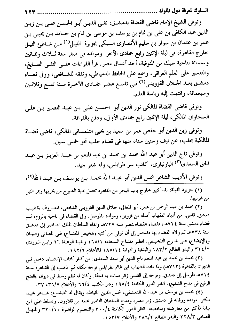 وَتُوفِّي الشَّيْخ الإِمَام قاضى الْقُضَاة بِدِمَشْق تَقِيّ الدّين أَبُو الْحسن على بن زين الدّين عبد الْكَافِي بن على بن تَمام بن يُوسُف بن مُوسَى بن تَمام بن حَامِد بن يحيى بن عمر بن عُثْمَان بن سوار بن سليم الْأنْصَارِيّ السُّبْكِيّ بحزيرة النّيل من شاطىء النّيل خَارج الْقَاهِرَة فِي لَيْلَة الْإِثْنَيْنِ رَابِع جُمَادَى الآخر. ومولده فِي صفر سنة ثَلَاث وَثَمَانِينَ وسِتمِائَة بِنَاحِيَة سبك من المنوفية أحد أَعمال مصر. قَرَأَ الْقرَاءَات على التقى الصايغ وَالتَّفْسِير على الْعلم الْعِرَاقِيّ وَسمع على الْحَافِظ الدمياطي وتفقه للشَّافِعِيّ وَولى قَضَاء دمشق بعد الْجلَال الْقزْوِينِي فِي تَاسِع عشر جُمَادَى الْآخِرَة سنة تسع وَثَلَاثِينَ وَسَبْعمائة وانتهت اليه رياسة الْعلم. وَتُوفِّي قاضى الْقُضَاة الْمَالِكِي نور الدّين أَبُو الْحسن عَليّ بن عبد النصير بن عَليّ السخاوي الْمَالِكِي لَيْلَة الْإِثْنَيْنِ رَابِع جُمَادَى الأولى وَدفن بالقرافة. وَتُوفِّي زين الدّين أَبُو حَفْص عمر بن سعيد بن يحيى التلمساني الْمَالِكِي قَاضِي قُضَاة الْمَالِكِيَّة بحلب عَن نَيف وَسِتِّينَ سنة مِنْهَا فِي قَضَاء حلب نَحْو خمس سِنِين. وَتُوفِّي تَاج الدّين أَبُو عبد الله مُحَمَّد بن مُحَمَّد بن عبد الْمُنعم بن عبد الْعَزِيز بن عبد الْحق السَّعْدِيّ البارنباري كَاتب سر طرابلس وَله شعر جيد. وَتُوفِّي الأديب الشَّاعِر شمس الدّين أَبُو عبد الله مُحَمَّد بن يُوسُف بن عبد الله