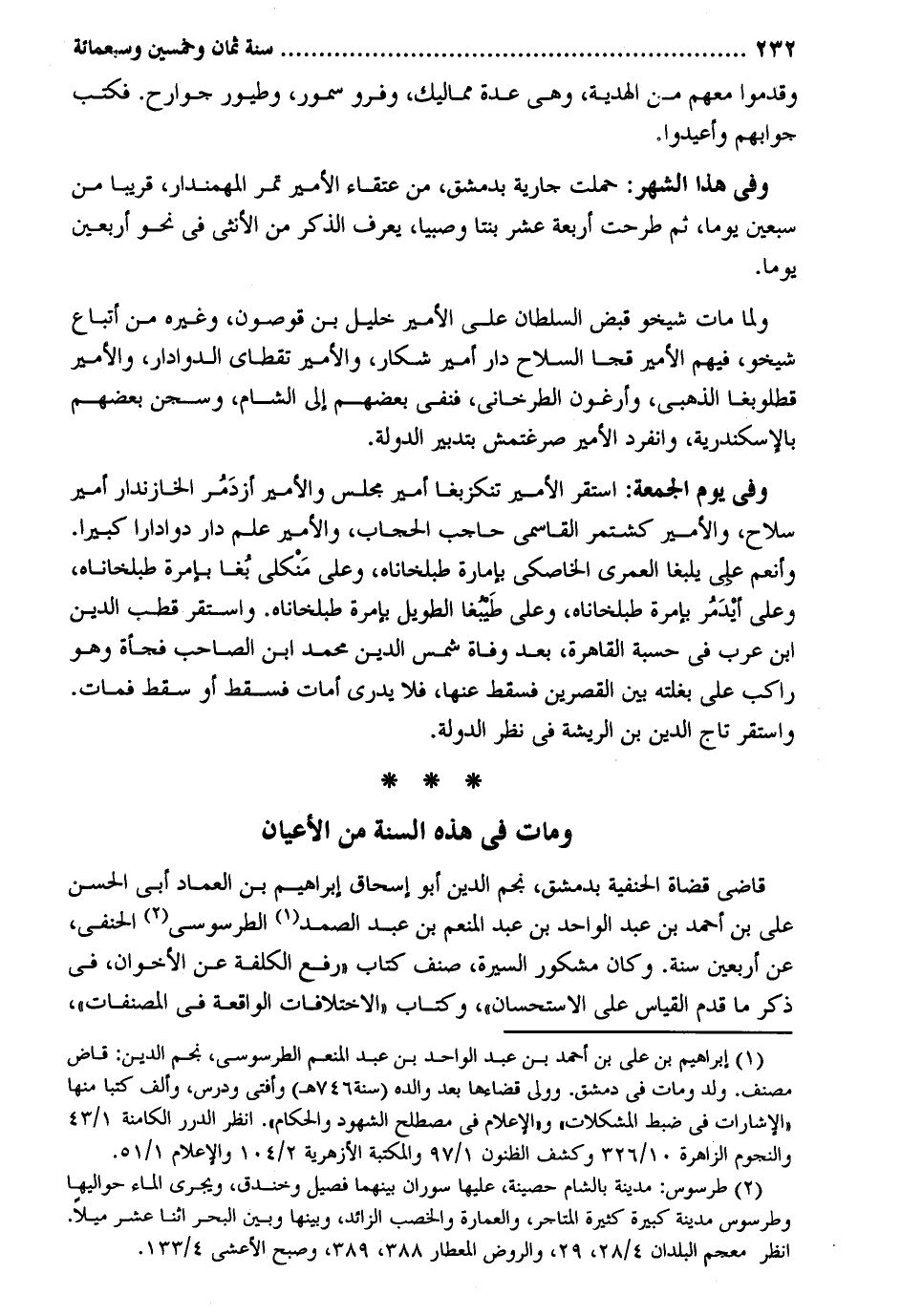 وَقدمُوا مَعَهم من الْهَدِيَّة، وَهِي عدَّة مماليك، وفرو سمور، وطيور جوارح. فَكتب جوابهم وأعيدوا. وَفِي هَذَا الشَّهْر: حملت جَارِيَة بِدِمَشْق من عُتَقَاء الْأَمِير تمر المهمندار قَرِيبا من سبعين يَوْمًا ثمَّ طرحت أَرْبَعَة عشر بِنْتا وصبياً يعرف الذّكر من الْأُنْثَى فِي نَحْو أَرْبَعِينَ يَوْمًا. وَلما مَاتَ شيخو قبض السُّلْطَان على الْأَمِير خَلِيل بن قوصون وَغَيره من أَتبَاع شيخو فيهم الْأَمِير قجا السِّلَاح دَار أَمِير شكار والأمير تقطاى الدوادار والأمير قطلوبغا الذَّهَبِيّ وأرغون الطرخاني فنفي بَعضهم إِلَى الشَّام وسجن بَعضهم بالإسكندرية وَانْفَرَدَ الْأَمِير صرغتمش بتدبير الدولة. وَفِي يَوْم الْجُمُعَة: اسْتَقر الْأَمِير تنكزبغا أَمِير مجْلِس والأمير أزدَمُر الخازندار أَمِير سلَاح والأمير كشتمر القاسمي حَاجِب الْحجاب والأمير علم دَار دوادارا كَبِيرا. وأنعم على يلبغا الْعمريّ الخاصكي بإمارة طبلخاناه وعَلى مَنْكلى بُغا بإمرة طبلخاناه وعَلى أيْدَمُر بإمرة طبلخاناه وعَلى طَيبغا الطَّوِيل بإمر طبلخاناه. وَاسْتقر قطب الدّين ابْن عرب فِي حسبَة الْقَاهِرَة بعد وَفَاة شمس الدّين مُحَمَّد ابْن الصاحب فَجْأَة وَهُوَ رَاكب على بغلته بَين القصرين فَسقط عَنْهَا فَلَا يدرى أمات فَسقط أَو سقط فَمَاتَ. وَاسْتقر تَاج الدّين بن الريشة فِي نظر الدولة. وَمَات فِي هَذِه السّنة من الْأَعْيَان قَاضِي قُضَاة الْحَنَفِيَّة بِدِمَشْق نجم الدّين أَبُو إِسْحَاق إِبْرَاهِيم بن الْعِمَاد أبي الْحسن عَليّ ابْن أَحْمد بن عبد الْوَاحِد بن عبد الْمُنعم بن عبد الصَّمد الطرسوسي الْحَنَفِيّ عَن أَرْبَعِينَ سنة. وَكَانَ مشكور السِّيرَة صنف كتاب رفع الكلفة عَن الأخوان فِي ذكر مَا قدم الْقيَاس على الِاسْتِحْسَان وَكتاب الاختلافات الْوَاقِعَة فِي المصنفات