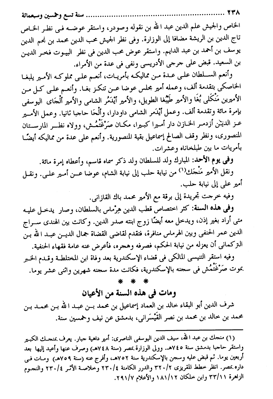 الْخَاص والجيش علم الدّين عبد الله بن نقُوله وصودر وَاسْتقر عوضه فِي نظر الْخَاص تَاج الدّين بن الريشة مُضَافا إِلَى الوزارة. وَفِي نظر الْجَيْش محب الدّين مُحَمَّد بن نجم الدّين يُوسُف بن أَحْمد بن عبد الدايم. وَاسْتقر عوض محب الدّين فِي نظر الْبيُوت فَخر الدّين بن السعيد. قبض على جرجى الأدريسي وَنفي فِي عدَّة من الْأُمَرَاء. وأنعم السُّلْطَان على عدَّة من مماليكه بأمريات أنعم على مَمْلُوكه الْأَمِير يلبغا الخاصكي بتقدمة ألف وَعَمله أَمِير مجْلِس عوضا عَن تنكز بغا. وأنعم على كل من الأميرين مَنكَلى بُغَا والأمير طَيبغا الطَّوِيل والأمير أندَمُر الشَّامي والأمير ألجَاي اليوسفي بإمرة مائَة وتقدمة ألف. وَعمل أيْدَمر الشَّامي داودارا وألحَا حاجباً ثَانِيًا. وَعمل الْأَمِير عز الدّين أزدمر الخازن دَار أَمِيرا كَبِيرا مَكَان صَرْغَتمش وولاه نظر المارستان المنصوري وَنظر وقف الصَّالح إِسْمَاعِيل بَقِيَّة المنصورية. وأنعم على عدَّة من مماليكه أَيْضا بأمريات مَا بَين طبلخاناه وعشرات. وَفِي يَوْم الْأَحَد: الْمُبَارك ولد للسُّلْطَان ولد ذكر سَمَّاهُ قَاسم وَأَعْطَاهُ إمرة مائَة. وَنقل الْأَمِير مَنْجَك من نِيَابَة حلب إِلَى نِيَابَة الشَّام عوضا عَن أَمِير عَليّ. وَنقل أَمِير عَليّ إِلَى نِيَابَة حلب. وَفِيه خرجت تجريدة إِلَى برقة مَعَ الْأَمِير مُحَمَّد باك القازاني. وَفِي هَذِه السّنة: كثر اخْتِصَاص قطب الدّين هِرْماس بالسلطان وَصَارَ يدْخل عَلَيْهِ مَتى أَرَادَ بِغَيْر إِذن وَيدخل مَعَه أَيْضا زوج ابْنَته صدر الدّين. وَكَانَت بَين الْهِنْدِيّ سراج الدّين عمر الْحَنَفِيّ وَبَين الهرماس منافرة فَتقدم لقَاضِي الْقُضَاة جمال الدّين عبد الله بن التركماني أَن يعزله من نِيَابَة الحكم فَصَرفهُ وهجره فَأَعْرض عَنهُ عَامَّة فُقَهَاء الْحَنَفِيَّة. وَفِيه اسْتَقر التنيسِي الْمَالِكِي فِي قَضَاء الْإسْكَنْدَريَّة بعد وَفَاة ابْن المختلطة وَقدم الْخَبَر بِمَوْت صرغَتمش فِي سجنه بالإسكندرية فَكَانَت مُدَّة سجنه شَهْرَيْن واثني عشر يَوْمًا. وَمَات فِي هَذِه السّنة من الْأَعْيَان شرف الدّين أَبُو الْبَقَاء خَالِد بن الْعِمَاد إِسْمَاعِيل بن مُحَمَّد بن عبد الله بن مُحَمَّد بن مُحَمَّد بن خَالِد بن مُحَمَّد بن نصر القَنسَراني بِدِمَشْق عَن نَيف وَخمسين سنة.
