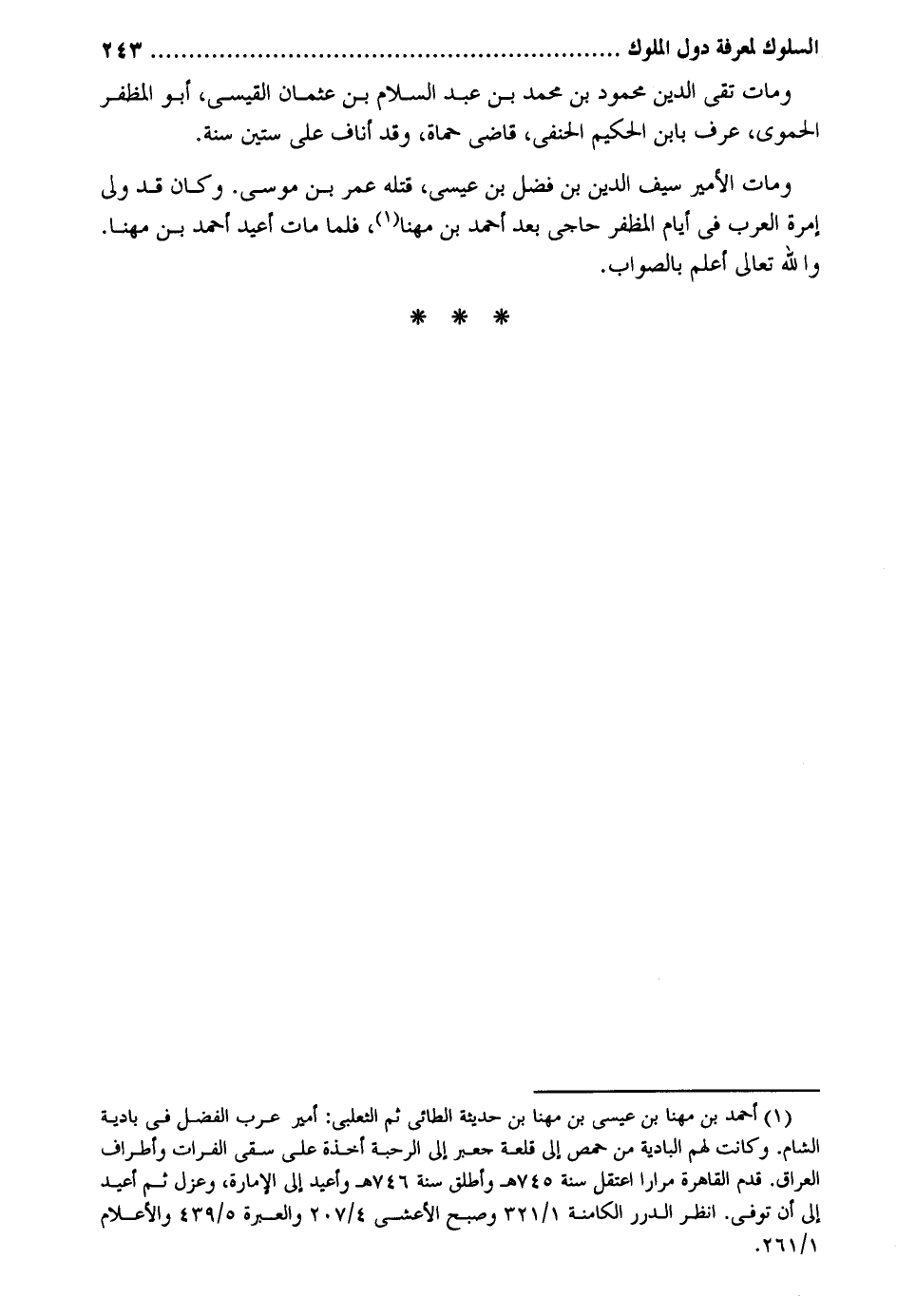 وَمَات تَقِيّ الدّين مَحْمُود بن مُحَمَّد بن عبد السَّلَام بن عُثْمَان الْقَيْسِي أَبُو المظفر الْحَمَوِيّ عرف بِابْن الْحَكِيم الْحَنَفِيّ قَاضِي حماة وَقد أناف على سِتِّينَ سنة. وَمَات الْأَمِير سيف الدّين بن فضل بن عِيسَى قَتله عمر بن مُوسَى. وَكَانَ قد ولى إمرة الْعَرَب فِي أَيَّام المظفر حاجى بعد أَحْمد بن مهنا فَلَمَّا مَاتَ أُعِيد أَحْمد بن مهنا. وَالله تَعَالَى أعلم بِالصَّوَابِ.