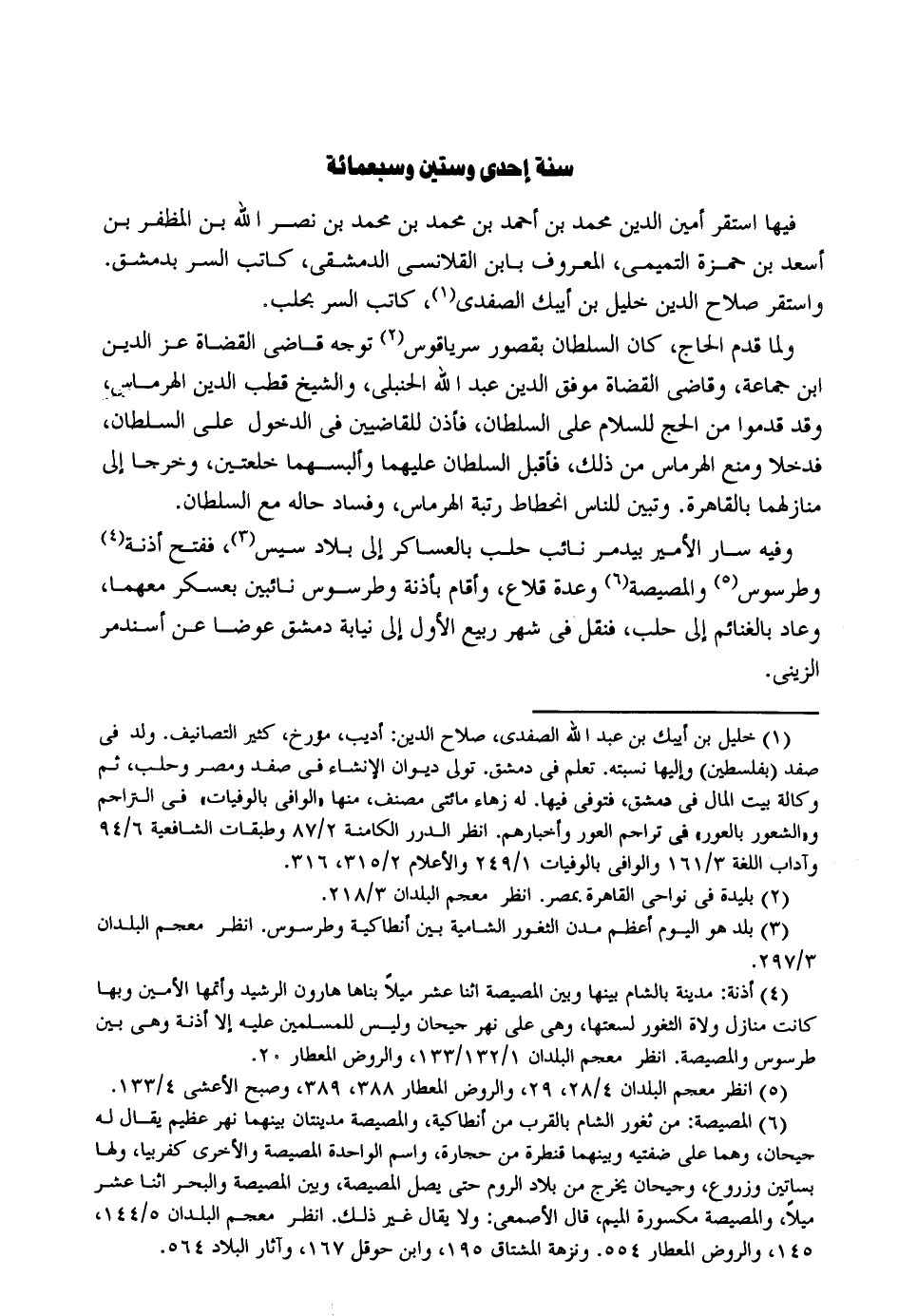 سنة إِحْدَى وَسِتِّينَ وَسَبْعمائة فِيهَا اسْتَقر أَمِين الدّين مُحَمَّد بن أَحْمد بن مُحَمَّد بن مُحَمَّد بن نصر الله بن المظفر بن أسعد بن حَمْزَة التَّمِيمِي الْمَعْرُوف بِابْن القلانسي الدِّمَشْقِي كَاتب السِّرّ بِدِمَشْق اسْتَقر صَلَاح الدّين خَلِيل بن أيبك الصَّفَدِي كَاتب السِّرّ بحلب. وَلما قدم الْحَاج كَانَ السُّلْطَان بقصور سرياقوس توجه قَاضِي الْقُضَاة عز الدّين ابْن جمَاعَة وقاضي الْقُضَاة موفق الدّين عبد الله الْحَنْبَلِيّ وَالشَّيْخ قطب الدّين الهرماس وَقد قدمُوا من الْحَج للسلام على السُّلْطَان فَأذن للقاضيين فِي الدُّخُول على السُّلْطَان فدخلا وَمنع الهرماس من ذَلِك فَأقبل السُّلْطَان عَلَيْهِمَا وألبسهما خلعتين وخرجا إِلَى منازلهما بِالْقَاهِرَةِ. وَتبين للنَّاس انحطاط رُتْبَة الهرماس وَفَسَاد حَاله مَعَ السُّلْطَان. وَفِيه سَار الْأَمِير بيدمر نَائِب حلب بالعساكر إِلَى بِلَاد سيس فَفتح أذنة وطرسوس والمصيصة وعدة قلاع وَأقَام بأذنة وطرسوس نائبين بعسكر مَعَهُمَا وَعَاد بالغنائم إِلَى حلب فَنقل فِي شهر ربيع الأول إِلَى نِيَابَة دمشق عوضا عَن أسندمر الزيني.