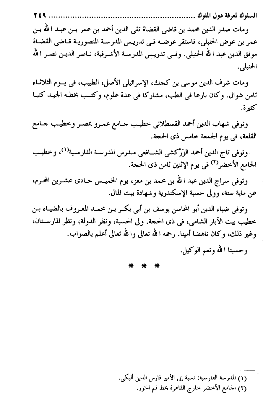 وَمَات صدر الدّين مُحَمَّد بن قَاضِي الْقُضَاة تَقِيّ الدّين أَحْمد بن عمر بن عبد الله بن عمر بن عوض الْحَنْبَلِيّ فاستقر عوضه فِي تدريس الْمدرسَة المنصورية قَاضِي الْقُضَاة موفق الدّين عبد الله الْحَنْبَلِيّ. وَفِي تدريس الْمدرسَة الأشرفية نَاصِر الدّين نصر الله الْحَنْبَلِيّ. وَمَات شرف الدّين مُوسَى بن كجك الإسرائيلي الأَصْل الطّيب فِي يَوْم الثُّلَاثَاء ثامن شَوَّال. وَتُوفِّي شهَاب الدّين أَحْمد الْقُسْطَلَانِيّ خطيب جَامع عَمْرو بِمصْر وخطيب جَامع القلعة فِي يَوْم الْجُمُعَة خَامِس ذِي الْحجَّة. وَتُوفِّي تَاج الدّين أَحْمد الزَركشي الشَّافِعِي مدرس الْمدرسَة الفارسية وخطيب الْجَامِع الْأَخْضَر فِي يَوْم الْإِثْنَيْنِ ثامن ذِي الْحجَّة. وَتُوفِّي سراج الدّين عبد الله بن مُحَمَّد بن معز يَوْم الْخَمِيس حادي عشْرين الْمحرم عَن ماية سنة وَولى حسبَة الْإسْكَنْدَريَّة وَشَهَادَة بَيت المَال. وَتُوفِّي ضِيَاء الدّين أَبُو المحاسن يُوسُف بن أَبى بكر بن مُحَمَّد الْمَعْرُوف بالضياء بن خطيب بَيت الْآبَار الشَّامي فِي ذِي الْحجَّة. ولى الْحِسْبَة وَنظر الدولة وَنظر المارستان وَغير ذَلِك وَكَانَ ناهضاً أَمينا. رَحمَه الله تَعَالَى وَالله تَعَالَى أعلم بِالصَّوَابِ. وحسبنا الله وَنعم الْوَكِيل.