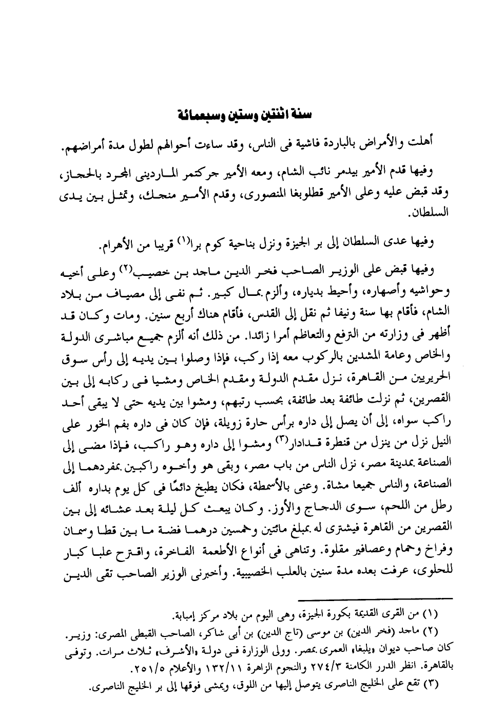 سنة اثْنَتَيْنِ وَسِتِّينَ وَسَبْعمائة أهلت والأمراض بالباردة فَاشِية فِي النَّاس وَقد ساءت أَحْوَالهم لطول مُدَّة أمراضهم. وفيهَا قدم الْأَمِير بيدمر نَائِب الشَّام وَمَعَهُ الْأَمِير جركتمر المارديني الْمُجَرّد بالحجاز وَقد قبض عَلَيْهِ وفيهَا عدى السُّلْطَان إِلَى بر الجيزة وَنزل بِنَاحِيَة كوم برا قَرِيبا من الأهرام. وفيهَا قبض على الْوَزير الصاحب فَخر الدّين ماجد بن خصيب وعَلى أَخِيه وحواشيه وأصهاره وأحيط بدياره وألزم بِمَال كَبِير. ثمَّ نفي إِلَى مصياف من بِلَاد الشَّام فَأَقَامَ بهَا سنة ونيفاً ثمَّ نقل إِلَى الْقُدس فَأَقَامَ هُنَاكَ أَربع سِنِين مَاتَ وَكَانَ قد أظهر فِي وزارته من الترفع والتعاظم أمرا زَائِدا. من ذَلِك أَنه ألزم جَمِيع مباشري الدولة وَالْخَاص وَعَامة المشدين بالركوب مَعَه إِذا ركب فَإِذا وصلوا بَين يَدَيْهِ إِلَى رَأس سوق الحريريين من الْقَاهِرَة نزل مقدم الدولة ومقدم الْخَاص ومضيا فِي ركابه إِلَى بَين القصرين ثمَّ نزلت طَائِفَة بعد طَائِفَة بِحَسب رتبهم وَمَشوا بَين يَدَيْهِ حَتَّى لَا يبْقى أحد رَاكب سواهُ إِلَى أَن يصل إِلَى دَاره بِرَأْس حارة زويلة فَإِن كَانَ فِي دَاره بِفَم الخور على النّيل نزل من ينزل من قنطرة قدادار وَمَشوا إِلَى دَاره وَهُوَ رَاكب فَإِذا مضى إِلَى الصِّنَاعَة بِمَدِينَة مصر نزل النَّاس من بَاب مصر وَبَقِي هُوَ وَأَخُوهُ راكبين. بمفردهما إِلَى الصِّنَاعَة وَالنَّاس جَمِيعًا مشَاة. وعنى بالأسمطة فَكَانَ يطْبخ دَائِما فِي كل يَوْم بداره ألف رَطْل من اللَّحْم سوى الدَّجَاج والأوز. وَكَانَ يبْعَث كل لَيْلَة بعد عشائه إِلَى بَين القصرين من الْقَاهِرَة فيشترى لَهُ. بمبلغ مِائَتَيْنِ وَخمسين درهما فضَّة مَا بَين قطا وسمان وفراخ وحمام وعصافير مقلوة. وتناهي فِي أَنْوَاع الْأَطْعِمَة الفاخرة واقترح عُلَبًا كبار للحلوى عرفت بعده مُدَّة سِنِين بالعلب الخصيبية. وَأَخْبرنِي الْوَزير الصاحب تَقِيّ الدّين