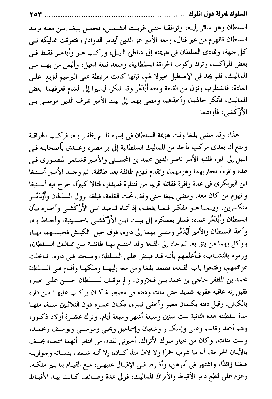 السُّلْطَان وَهُوَ سَائِر إِلَيْهِ وتوافقا حَتَّى غربت الشَّمْس فَحمل يلبغا. بِمن مَعَه يُرِيد السُّلْطَان فَانْهَزَمَ من غير قتال وَمَعَهُ الْأَمِير عز الدّين أيدمر الدوادار فتفرقت مماليكه فِي كل جِهَة وَتَمَادَى السُّلْطَان فِي هزيمته إِلَى شاطىء النّيل وَركب هُوَ وأيدمر فَقَط فِي بعض المراكب وَترك ركُوب الحراقة السُّلْطَانِيَّة وَصعد قلعة الْجَبَل وألبس من بهَا من المماليك فَلم يجد فِي الإصطبل خيولاً لَهُم فَإِنَّهَا كَانَت مرتبطة على البرسيم لتربع على الْعَادة فاضطرب وَنزل من القلعة وَمَعَهُ أيْدَمُر وَقد تنكرا ليسيرا إِلَى الشَّام فعرفهما بعض المماليك فَأنْكر حَالهمَا وَأَخذهمَا وَمضى بهما إِلَى بَيت الْأَمِير شرف الدّين مُوسَى بن المازْكَشي فأواهما. هَذَا وَقد مضى يلبغا وَقت هزيمَة السُّلْطَان فِي إسره فَلم يظفر بِهِ فَركب الحراقة وَمنع أَن يعدى مركب بِأحد من المماليك السُّلْطَانِيَّة إِلَى بر مصر وعدى بَأصحابه فِي اللَّيْل إِلَى الْبر فَلَقِيَهُ الْأَمِير نَاصِر الدّين مُحَمَّد بن المحسني والأمير قشتمر المنصوري فِي عدَّة وافرة فحاربهما وهزمهما وَتقدم فَهزمَ طَائِفَة بعد طَائِفَة. ثمَّ وجد الْأَمِير أسنبغا ابْن البوبكري فِي عدَّة وافرة فقاتله قَرِيبا من قنطرة قديدار قتالاً كَبِيرا جرح فِيهِ أسنبغا وَانْهَزَمَ من كَانَ مَعَه. وَمضى يلبغا حَتَّى وقف تَحت القلعة فَبَلغهُ نزُول السُّلْطَان وأَيْدَمُر منكسرين. وبينما هُوَ مفكر فِيمَا يَفْعَله إِذْ أَتَاهُ قَاصد ابْن الأزْكَشي وَأخْبرهُ بِأَن السُّلْطَان وأَيْدَمر عِنْده فَسَار بعسكره إِلَى بَيت ابْن الأزْكَشي بالحسينية وأحاط بِهِ وَأخذ السُّلْطَان والأمير أَيْدَمُر وَمضى بهما إِلَى دَاره قرب جبل الْكَبْش فحبسهما بهَا ووكل بهما من يَثِق بِهِ. ثمَّ عَاد إِلَى القلعة وَقد امْتنع بهَا طَائِفَة من مماليك السُّلْطَان ورموه بالنشاب فأعلمهم بِأَنَّهُ قد قبض على السُّلْطَان وسجنه فِي دَاره فانحلت عزائمهم وفتحوا بَاب القلعة فَصَعدَ يلبغا وَمن مَعَه إِلَيْهَا وملكها وَأقَام فِي السلطنة مُحَمَّد بن المظفر حاجي بن مُحَمَّد بن قلاوون. وَلم يُوقف للسُّلْطَان حسن على خبر فَقيل إِنَّه عاقبه عُقُوبَة شَدِيدَة حَتَّى مَاتَ وَدَفنه فِي مصبطة كَانَ يركب عَلَيْهَا من دَاره بالكبش. وَقيل دَفنه بكيمان مُضر وأَخفي قَبره فَكَانَ عمره دون الثَّلَاثِينَ سنة مِنْهَا مُدَّة سلطنته هَذِه الثَّانِيَة سِتّ سِنِين وَسَبْعَة أشهر وَسَبْعَة أَيَّام. وَترك عشرَة أَوْلَاد ذُكُور وهم أَحْمد وقاسم وَعلي وإسكندر وَشَعْبَان وَإِسْمَاعِيل وَيحيى ومُوسَى ويوسف وَمُحَمّد وست بَنَات. وَكَانَ من خِيَار مُلُوك الأتراك. أَخْبرنِي ثقتان من النَّاس أَنَّهُمَا سمعاه يحلف بالأيمان الحرجة أَنه مَا شرب خمرًا وَلَا لَاطَ مُنْذُ كَانَ إِلَّا أَنه شغف بنسائه وجواريه شغفاً زَائِدا واشتهر فِي أمرهن وأفرط فِي الإقبال عَلَيْهِنَّ مَعَ الْقيام بتدبير ملكه. وعزم على قطع دابر الأقباط والأتراك المماليك فولى عدَّة وظائف كَانَت بيد الأقباط