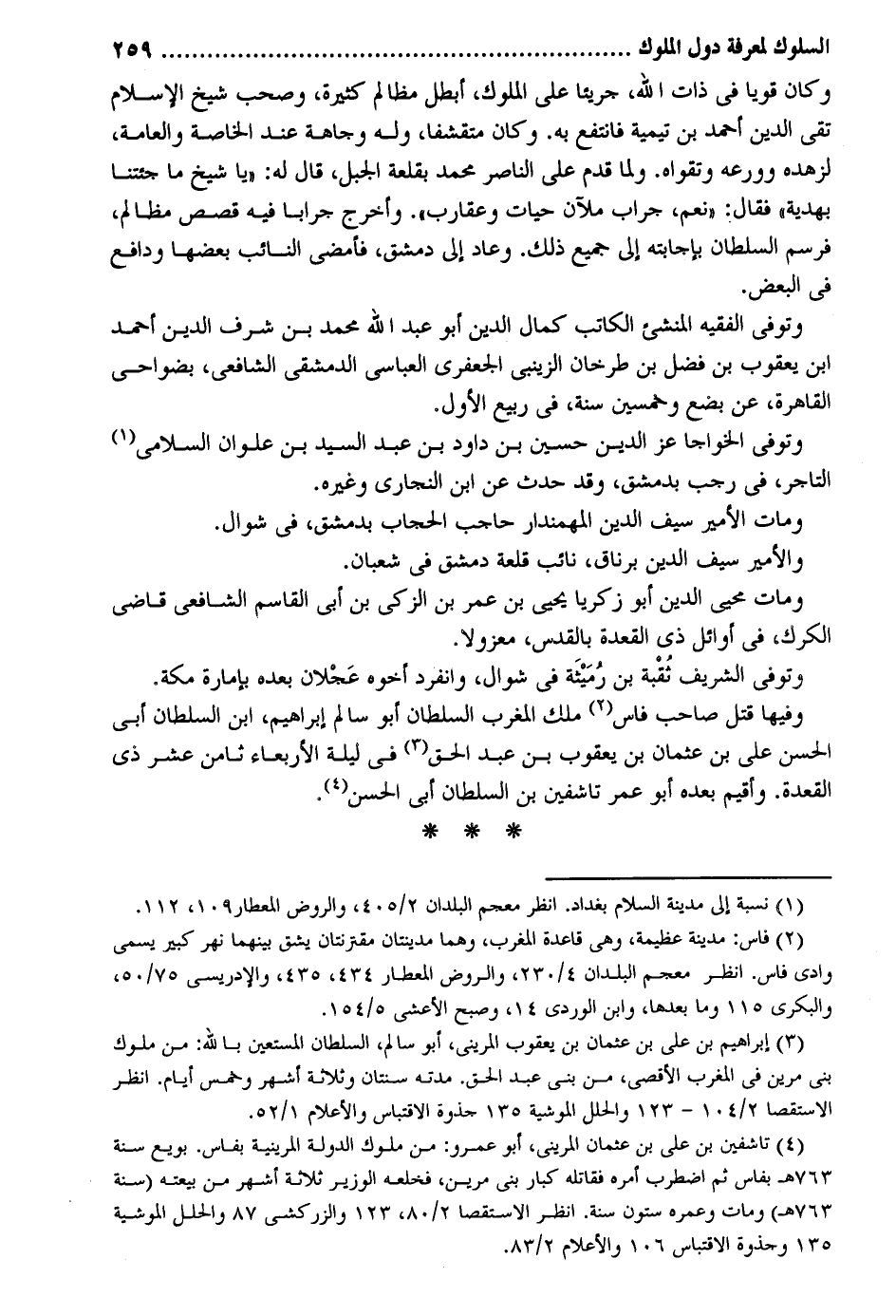 وَكَانَ قَوِيا فِي ذَات الله جريئاً على الْمُلُوك أبطل مظالم كَثِيرَة وَصَحب شيخ الْإِسْلَام تَقِيّ الدّين أَحْمد بن تَيْمِية فَانْتَفع بِهِ. وَكَانَ متقشفاً وَله وجاهة عِنْد الْخَاصَّة والعامة لزهده وورعه وتقواه. وَلما قدم على النَّاصِر مُحَمَّد بقلعة الْجَبَل قَالَ لَهُ: يَا شيخ مَا جئتنا بهدية! فَقَالَ: نعم جراب ملآن حيات وعقارب. وَأخرج جراباً فِيهِ قصَص مظالم فرسم السُّلْطَان بإجابته إِلَى جَمِيع ذَلِك. وَعَاد إِلَى دمشق فَأمْضى النَّائِب بَعْضهَا ودافع فِي الْبَعْض. وَتُوفِّي الْفَقِيه المنشىء الْكَاتِب كَمَال الدّين أَبُو عبد الله مُحَمَّد بن شرف الدّين أَحْمد ابْن يَعْقُوب بن فضل بن طرخان الزَّيْنَبِي الْجَعْفَرِي العباسي الدِّمَشْقِي الشَّافِعِي بضواحي الْقَاهِرَة عَن بضع وَتُوفِّي الخواجا عز الدّين حُسَيْن بن دَاوُد بن عبد السَّيِّد بن علوان السلَامِي التَّاجِر فِي رَجَب بِدِمَشْق وَقد حدث عَن ابْن النجاري وَغَيره. وَمَات الْأَمِير سيف الدّين المهمندار حَاجِب الْحجاب بِدِمَشْق فِي شَوَّال. والأمير سيف الدّين برناق نَائِب قلعة دمشق فِي شعْبَان. وَمَات محيى الدّين أَبُو زَكَرِيَّا يحيى بن عمر بن الزكي بن أبي الْقَاسِم الشَّافِعِي قَاضِي الكرك فِي أَوَائِل ذِي الْقعدَة بالقدس معزولاً. وَتُوفِّي الشريف ثُقبة بن رُميثَة فِي شَوَّال وَانْفَرَدَ أَخُوهُ عَجلان بعده بإمارة مَكَّة. وفيهَا قتل صَاحب فاس ملك الْمغرب السُّلْطَان أَبُو سَالم إِبْرَاهِيم ابْن السُّلْطَان أبي الْحسن عَليّ بن عُثْمَان بن يَعْقُوب بن عبد الْحق فِي لَيْلَة الْأَرْبَعَاء ثامن عشر ذِي الْقعدَة. وأقيم بعده أَبُو عمر تاشفين بن السُّلْطَان أبي الْحسن.