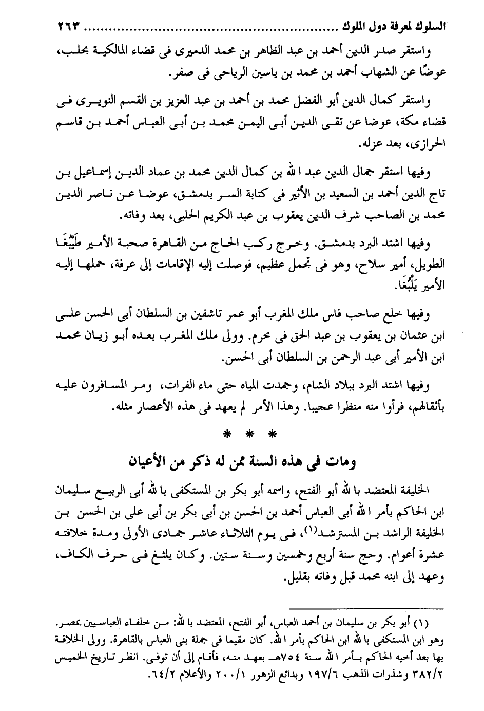 وَاسْتقر صدر الدّين أَحْمد بن عبد الظَّاهِر بن مُحَمَّد الدَّمِيرِيّ فِي قَضَاء الْمَالِكِيَّة بحلب عوضا عَن الشهَاب أَحْمد بن مُحَمَّد بن ياسين الريَاحي فِي صفر. وَاسْتقر كَمَال الدّين أَبُو الْفضل مُحَمَّد بن أَحْمد بن عبد الْعَزِيز بن الْقسم النويري فِي قَضَاء مَكَّة عوضا عَن تَقِيّ الدّين أبي الْيمن مُحَمَّد بن أَبى الْعَبَّاس أَحْمد بن قَاسم الْحرَازِي بعد عَزله. وفيهَا اسْتَقر جمال الدّين عبد الله بن كَمَال الدّين مُحَمَّد بن عماد الدّين إِسْمَاعِيل بن تَاج الدّين أَحْمد بن السعيد بن الْأَثِير فِي كِتَابَة السِّرّ بِدِمَشْق عوضا عَن نَاصِر الدّين مُحَمَّد بن الصاحب شرف الدّين يَعْقُوب بن عبد الْكَرِيم الْحلَبِي بعد وَفَاته. وفيهَا اشْتَدَّ الْبرد بِدِمَشْق. وَخرج ركب الْحَاج من الْقَاهِرَة صُحْبَة الْأَمِير طَيبغَا الطَّوِيل أَمِير سلَاح وَهُوَ فِي تجمل عَظِيم فوصلت إِلَيْهِ الإقامات إِلَى عَرَفَة حملهَا إِلَيْهِ الْأَمِير يَلبغا وفيهَا خلع صَاحب فاس ملك الْمغرب أَبُو عمر تاشفين بن السُّلْطَان أبي الْحسن على ابْن عُثْمَان بن يَعْقُوب بن عبد الْحق فِي محرم. وَولى ملك الْمغرب بعد أَبُو زيان مُحَمَّد ابْن الْأَمِير أَبى عبد الرَّحْمَن بن السُّلْطَان أبي الْحسن. وفيهَا اشْتَدَّ الْبرد بِبِلَاد الشَّام وجمدت الْمِيَاه حَتَّى مَاء الْفُرَات وَمر المسافرون عَلَيْهِ بأثقالهم فَرَأَوْا مِنْهُ منْظرًا عجيباً. وَهَذَا الْأَمر لم يعْهَد فِي هَذِه الْأَعْصَار مثله. وَمَات فِي هَذِه السّنة مِمَّن لَهُ ذكر من الْأَعْيَان الْخَلِيفَة المعتضد بِاللَّه أَبُو الْفَتْح واسْمه أَبُو بكر بن المستكفي بِاللَّه أبي الرّبيع سُلَيْمَان ابْن الْحَاكِم بِأَمْر الله أبي الْعَبَّاس أَحْمد بن الْحسن بن أبي بكر بن أبي عَليّ بن الْحسن بن الْخَلِيفَة الراشد بن المسترشد فِي يَوْم الثُّلَاثَاء عَاشر جُمَادَى الأولى وَمُدَّة خِلَافَته عشرَة أَعْوَام. وَحج سنة أَربع وَخمسين وَسنة سِتِّينَ. وَكَانَ يلثغ فِي حرف الْكَاف وعهد إِلَى ابْنه مُحَمَّد قبل وَفَاته بِقَلِيل.