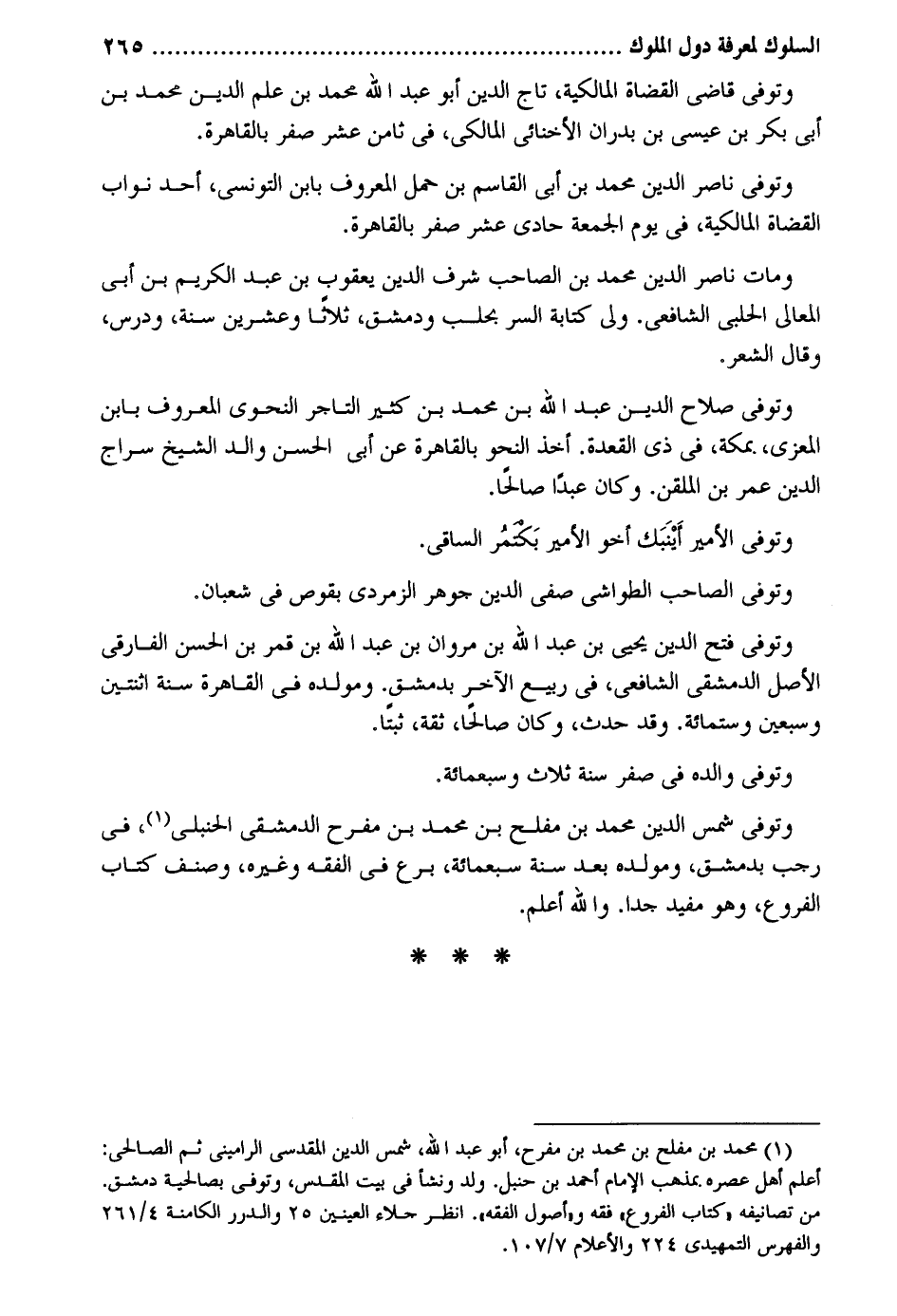 وَتُوفِّي قَاضِي الْقُضَاة الْمَالِكِيَّة تَاج الدّين أَبُو عبد الله مُحَمَّد بن علم الدّين مُحَمَّد بن أبي بكر بن عِيسَى بن بدران الأخنائي الْمَالِكِي فِي ثامن عشر صفر بِالْقَاهِرَةِ. وَتُوفِّي نَاصِر الدّين مُحَمَّد بن أبي الْقَاسِم بن حمل الْمَعْرُوف بِابْن التّونسِيّ أحد نواب الْقُضَاة الْمَالِكِيَّة فِي يَوْم الْجُمُعَة حادي عشر صفر بِالْقَاهِرَةِ. وَمَات نَاصِر الدّين مُحَمَّد بن الصاحب شرف الدّين يَعْقُوب بن عبد الْكَرِيم بن أبي الْمَعَالِي الْحلَبِي الشَّافِعِي. ولي كِتَابَة السِّرّ بحلب ودمشق ثلاَثاً وَعشْرين سنة ودرس وَقَالَ الشّعْر. وَتُوفِّي صَلَاح الدّين عبد الله بن مُحَمَّد بن كثير التَّاجِر النَّحْوِيّ الْمَعْرُوف بِابْن المعزى بِمَكَّة فِي ذِي الْقعدَة. أَخذ النَّحْو بِالْقَاهِرَةِ عَن أبي الْحسن وَالِد الشَّيْخ سراج الدّين عمر بن الملقن. وَكَانَ عبدا صَالحا. وَتُوفِّي الْأَمِير أَيْنَبَك أَخُو الْأَمِير بَكتمُر الساقي. وَتُوفِّي الصاحب الطواشي صفي الدّين جَوْهَر الزمردي بقوص فِي شعْبَان. وَتُوفِّي فتح الدّين يحيى بن عبد الله بن مَرْوَان بن عبد الله بن قمر بن الْحسن الفارقي الأَصْل الدِّمَشْقِي الشَّافِعِي فِي ربيع الآخر بِدِمَشْق. ومولده فِي الْقَاهِرَة سنة اثْنَتَيْنِ وَسبعين وسِتمِائَة. وَقد حدث وَكَانَ صَالحا ثِقَة ثبتاً. وَتُوفِّي وَالِده فِي صفر سنة ثَلَاث وَسَبْعمائة. وَتُوفِّي شمس الدّين مُحَمَّد بن مُفْلِح بن مُحَمَّد بن مفرح الدِّمَشْقِي الْحَنْبَلِيّ فِي رَجَب بِدِمَشْق ومولده بعد سنة سَبْعمِائة برع فِي الْفِقْه وَغَيره وصنْف كتاب الْفُرُوع وَهُوَ مُفِيد جدا. وَالله أعلم.