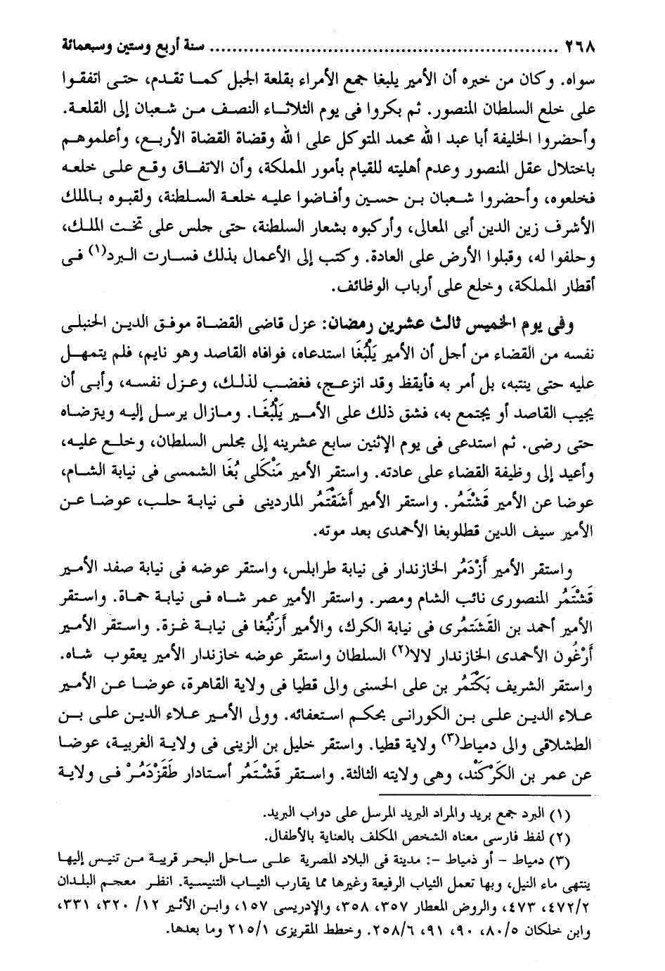 سواهُ. وَكَانَ من خَبره أَن الْأَمِير يلبغا جمع الْأُمَرَاء بقلعة الْجَبَل كَمَا تقدم حَتَّى اتَّفقُوا على خلع السُّلْطَان الْمَنْصُور. ثمَّ بَكرُوا فِي يَوْم الثُّلَاثَاء النّصْف من شعْبَان إِلَى القلعة وأحضروا الْخَلِيفَة أَبَا عبد الله مُحَمَّد المتَوَكل على الله وقضاة الْقُضَاة الْأَرْبَع وأعلموهم باختلال عقل الْمَنْصُور وَعدم أَهْلِيَّته للْقِيَام بِأُمُور المملكة وَأَن الِاتِّفَاق وَقع على خلعه فخلعوه وأحضروا شعْبَان بن حُسَيْن وأفاضوا عَلَيْهِ خلعة السلطنة ولقبوه بِالْملكِ الْأَشْرَف زين الدّين أبي الْمَعَالِي وأركبوه بشعار السلطة حَتَّى جلس على تخت الْملك وحلفوا لَهُ وقبلوا الأَرْض على الْعَادة. وَكتب إِلَى الْأَعْمَال بذلك فسارت الْبرد فِي أقطار المملكة وخلع على أَرْبَاب الْوَظَائِف. وَفِي يَوْم الْخَمِيس ثَالِث عشْرين رَمَضَان: عزل قَاضِي الْقُضَاة موفق الدّين الْحَنْبَلِيّ نَفسه من الْقَضَاء من أجل أَن الْأَمِير يَلبغَا استدعاه فوافاه القاصد وَهُوَ نايم فَلم يتمهل عَلَيْهِ حَتَّى ينتبه بل أَمر بِهِ فأيقظ وَقد انزعج فَغَضب لذَلِك وعزل نَفسه وأبى أَن يُجيب القاصد أَو يجْتَمع بِهِ فشق ذَلِك على الْأَمِير يَلبغَا. ومازال يُرْسل إِلَيْهِ ويترضاه حَتَّى رَضِي. ثمَّ استدعى فِي يَوْم الْإِثْنَيْنِ سَابِع عشرينه إِلَى مجْلِس السُّلْطَان وخلع عَلَيْهِ وأعيد إِلَى وَظِيفَة الْقَضَاء على عَادَته. وَاسْتقر الْأَمِير مَنْكَلى بُغَا الشمسي فِي نِيَابَة الشَّام عوضا عَن الْأَمِير قَشْتَمُر. وَاسْتقر الْأَمِير أَشَقتمر المارديني فِي نِيَابَة حلب عوضا عَن الْأَمِير سيف الدولة قطلوبغا الأحمدي بعد مَوته. وَاسْتقر الْأَمِير أَزْدَمر الخازندار فِي نِيَابَة طرابلس وَاسْتقر عوضه فِي نِيَابَة صفد الْأَمِير قَشْتَمُر المنصوري نَائِب الشَّام ومصر. وَاسْتقر الْأَمِير عمر شاه فِي نِيَابَة حماة. وَاسْتقر الْأَمِير أَحْمد بن القَشَتمُري فِي نِيَابَة الكرك والأمير أَرَنبُغا فِي نِيَابَة غَزَّة. وَاسْتقر الْأَمِير أَرْغون الأحمدي الخازندار لالا السُّلْطَان وَاسْتقر عوضه خازندار الْأَمِير يَعْقُوب شاه. وَاسْتقر الشريف بَكتمُر بن عَليّ الحسني وَالِي قطا فِي ولَايَة الْقَاهِرَة عوضا عَن الْأَمِير عَلَاء الدّين عَليّ بن الكوراني بِحكم استعفائه. وَولي الْأَمِير عَلَاء الدّين عَليّ بن الطشلاقي وَالِي دمياط ولَايَة قطيا. وَاسْتقر خَلِيل بن الزيني فِي ولَايَة الغربية عوضا عَن عمر بن الكركَنْد وَهِي ولَايَته الثَّالِثَة. وَاسْتقر قَشْتَمُر أستادار طَقَزْدَمُرْ فِي ولَايَة