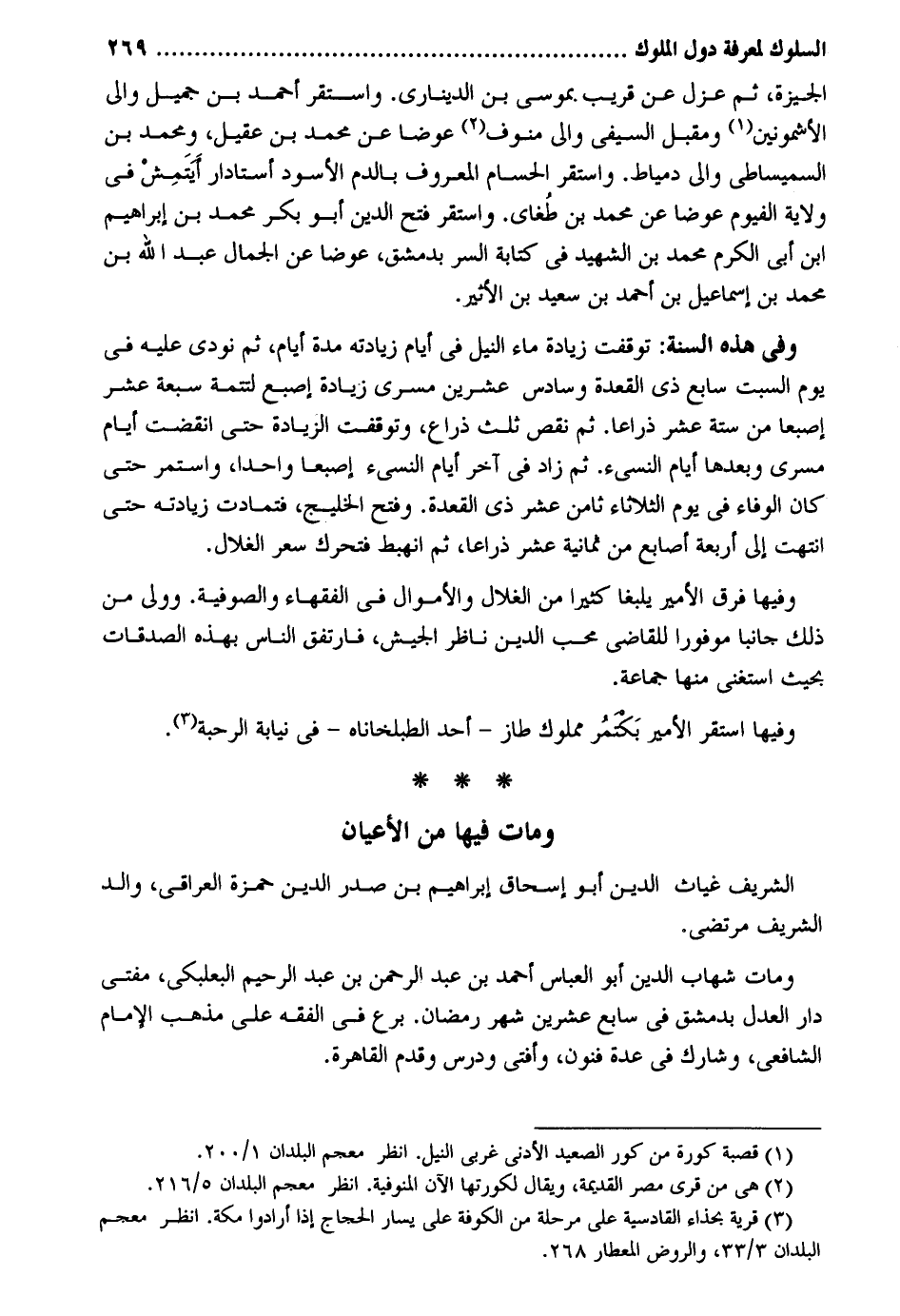 الجيزة ثمَّ عزل عَن قريب بمُوسَى بن الديناري. وَاسْتقر أَحْمد بن جميل وَالِي الأشمونين ومقبل السيفي وَالِي منوف عوضا عَن مُحَمَّد بن عقيل وَمُحَمّد بن السميساطي وَالِي دمياط. وَاسْتقر الحسام الْمَعْرُوف بِالدَّمِ الْأسود أستادار أيتمش فِي ولَايَة الفيوم عوضا عَن مُحَمَّد بن طغاى. وَاسْتقر فتح الدّين أَبُو بكر مُحَمَّد بن إِبْرَاهِيم ابْن أبي الْكَرم مُحَمَّد بن الشَّهِيد فِي كِتَابَة السِّرّ بِدِمَشْق عوضا عَن الْجمال عبد الله بن مُحَمَّد بن إِسْمَاعِيل بن أَحْمد بن سعيد بن الْأَثِير. وَفِي هده السّنة: توقفت زِيَادَة مَاء النّيل فِي أَيَّام زِيَادَته مُدَّة أَيَّام ثمَّ نُودي عَلَيْهِ فِي يَوْم السبت سَابِع ذِي الْقعدَة وسادس عشْرين مسرى زِيَادَة إِصْبَع لتتمة سَبْعَة عشر إصبعاً من سِتَّة عشر ذِرَاعا. ثمَّ نقص ثلث ذِرَاع وتوقفت الزِّيَادَة حَتَّى انْقَضتْ أَيَّام مسرى وَبعدهَا أَيَّام النسىء. ثمَّ زَاد فِي آخر أَيَّام النسىء إصبعاً وَاحِدًا وَاسْتمرّ حَتَّى كَانَ الْوَفَاء فِي يَوْم الثُّلَاثَاء ثامن عشر ذِي الْقعدَة. وَفتح الخليج فتمادت زِيَادَته حَتَّى انْتَهَت إِلَى أَرْبَعَة أَصَابِع من ثَمَانِيَة عشر ذِرَاعا ثمَّ انهبط فَتحَرك سعر الغلال. وفيهَا فرق الْأَمِير يلبغا كثيرا من الغلال وَالْأَمْوَال فِي الْفُقَهَاء والصوفية. وَولى من ذَلِك جانباً موفوراً للْقَاضِي محب الدّين نَاظر الْجَيْش فارتفق النَّاس بِهَذِهِ الصَّدقَات بِحَيْثُ اسْتغنى مِنْهَا جمَاعَة. وفيهَا اسْتَقر الْأَمِير بَكتمُر مَمْلُوك طاز - أحد الطبلخاناه - فِي نِيَابَة الرحبة. وَمَات فِيهَا من الْأَعْيَان الشريف غياث الدّين أَبُو إِسْحَاق إِبْرَاهِيم بن صدر الدّين حَمْزَة الْعِرَاقِيّ وَالِد الشريف مرتضى وَمَات شهَاب الدّين أَبُو الْعَبَّاس أَحْمد بن عبد الرَّحْمَن بن عبد الرَّحِيم البعلبكي مفتي دَار الْعدْل بِدِمَشْق فِي سَابِع عشْرين شهر رَمَضَان. برع فِي الْفِقْه على مَذْهَب الإِمَام الشَّافِعِي وشارك فِي عدَّة فنون وَأفْتى ودرس وَقدم الْقَاهِرَة.
