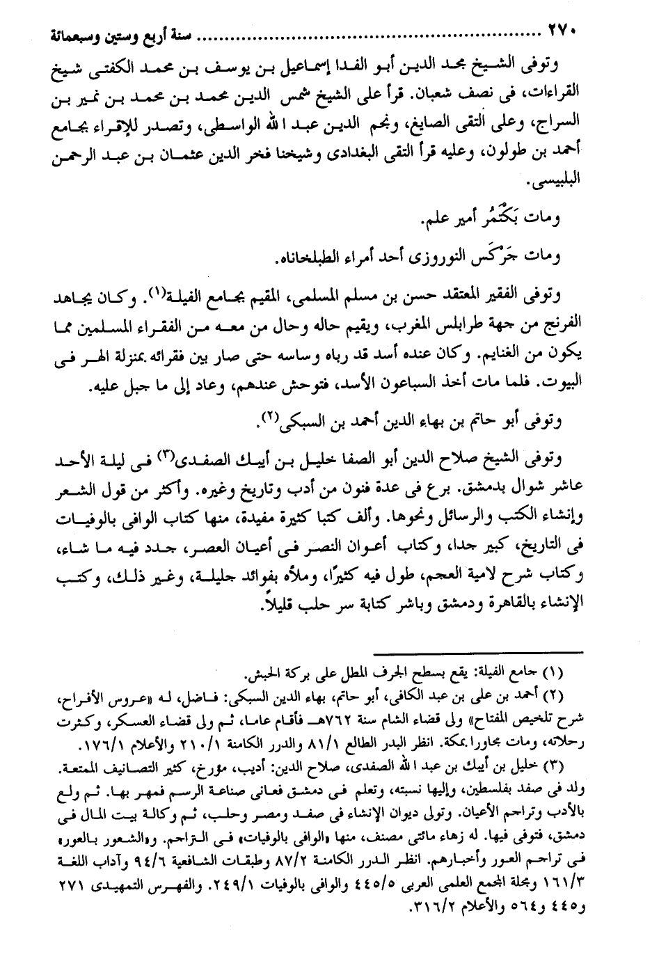 وَتُوفِّي الشَّيْخ مجد الدّين أَبُو الفدا إِسْمَاعِيل بن يُوسُف بن مُحَمَّد الكفتي شيخ الْقرَاءَات فِي نصف شعْبَان. قَرَأَ على الشَّيْخ شمس الدّين مُحَمَّد بن مُحَمَّد بن نمير بن السراج وَعلي التقي الصايغ وَنجم الدّين عبد الله الوَاسِطِيّ وتصدر للإقراء بِجَامِع أَحْمد بن طولون وَعَلِيهِ قَرَأَ التقي وَمَات بَكتمر أَمِير علم وَمَات جَرْكَس النوروزي أحد أُمَرَاء الطبلخاناه. وَتُوفِّي الْفَقِير المعتقد حسن بن مُسلم المسلمي الْمُقِيم بِجَامِع الفيلة وَكَانَ يُجَاهد الفرنج من جِهَة طرابلس الْمغرب وَيُقِيم حَاله وَحَال من مَعَه من الْفُقَرَاء الْمُسلمين مِمَّا يكون من الغنايم. وَكَانَ عِنْده أَسد قد رباه وساسه حَتَّى صَار بَين فقرائه بِمَنْزِلَة الهر فِي الْبيُوت. فَلَمَّا مَاتَ أَخذ السباعون الْأسد فتوحش عِنْدهم وَعَاد إِلَى مَا جبل عَلَيْهِ. وَتُوفِّي أَبُو حَاتِم بن بهاء الدّين أَحْمد بن السُّبْكِيّ وَتُوفِّي الشَّيْخ صَلَاح الدّين أَبُو الصَّفَا خَلِيل بن أيبك الصَّفَدِي فِي لَيْلَة الْأَحَد عَاشر شَوَّال بِدِمَشْق. برع فِي عدَّة فنون من أدب وتاريخ وَغَيره وَأكْثر من قَول الشّعْر وإنشاء الْكتب والرسائل وَنَحْوهَا. وَألف كتبا كَثِيرَة مفيدة مِنْهَا كتاب الوافي بالوفيات فِي التَّارِيخ كَبِير جدا وَكتاب أعوان النَّصْر فِي أَعْيَان الْعَصْر جدد فِيهِ مَا شَاءَ وَكتاب شرح لامية الْعَجم طول فِيهِ كثيرا وملأه بفوائد جليلة وَغير ذَلِك وَكتب الْإِنْشَاء بِالْقَاهِرَةِ ودمشق وباشر كِتَابَة سر حلب قَلِيلا.