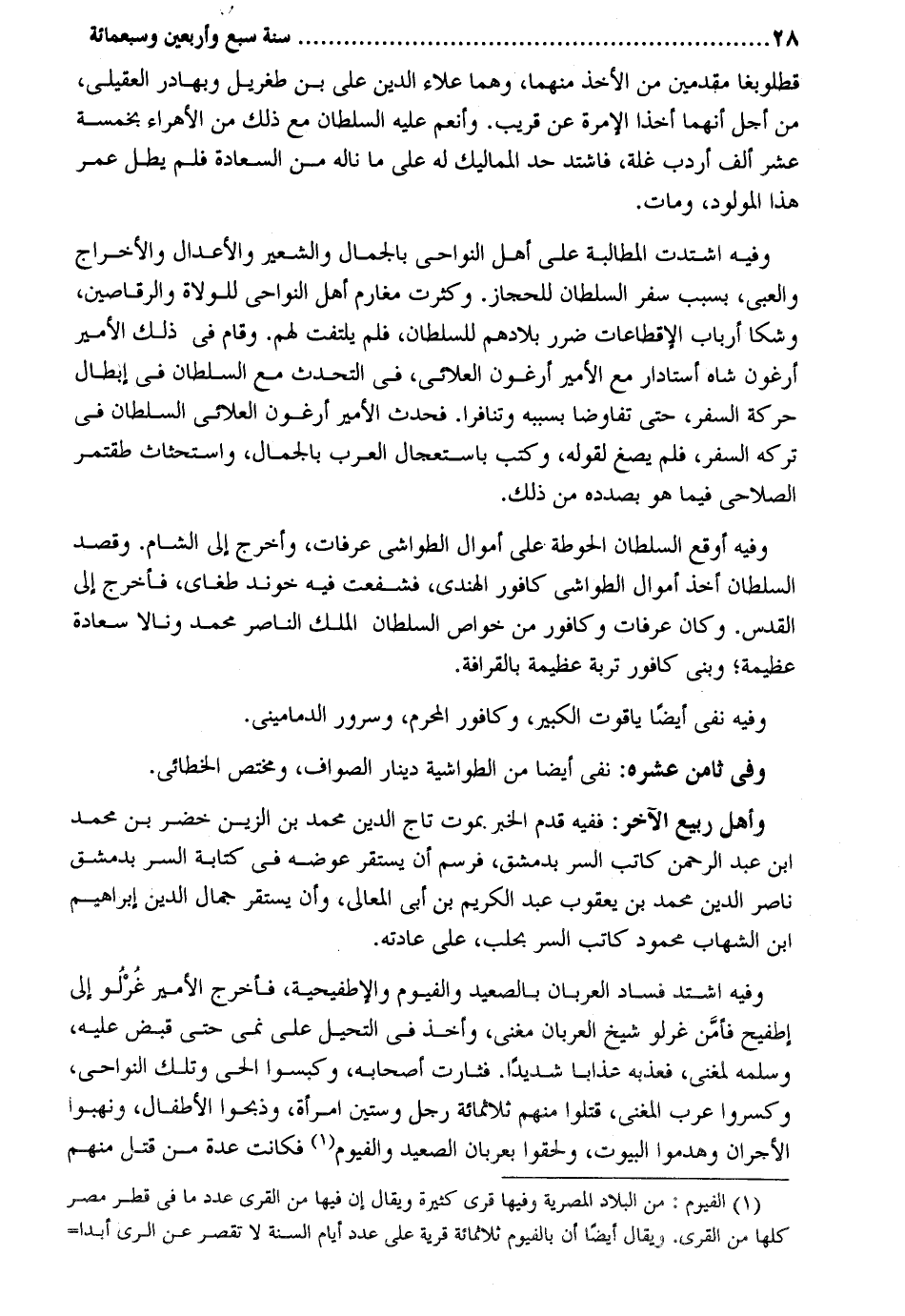 قطلوبغا مقدمين من الْأَخْذ مِنْهُمَا وهما عَلَاء الدّين عَليّ بن طغريل وبهادر الْعقيلِيّ من أجل أَنَّهُمَا أخذا الإمرة عَن قريب. وأنعم عَلَيْهِ السُّلْطَان مَعَ ذَلِك من الأهراء بِخَمْسَة عشر ألف أردب غلَّة فَاشْتَدَّ حد المماليك لَهُ على مَا ناله من السَّعَادَة فَلم يطلّ عمر هَذَا الْمَوْلُود وَمَات. وَفِيه اشتدت الْمُطَالبَة على أهل النواحي بالجمال وَالشعِير والأعدال والأخراج والعبي بِسَبَب سفر السُّلْطَان للحجاز. وَكَثُرت مغارم أهل النواحي للولاة والرقاصين وشكا أَرْبَاب الإقطاعات ضَرَر بِلَادهمْ للسُّلْطَان فَلم يلْتَفت لَهُم. وَقَامَ فِي ذَلِك الْأَمِير أرغون شاه أستادار مَعَ الْأَمِير أرغون العلائي فِي التحدث مَعَ السُّلْطَان فِي إبِْطَال حَرَكَة السّفر حَتَّى تفاوضا بِسَبَبِهِ وتنافرا. فَحدث الْأَمِير أرغون العلائي السُّلْطَان فِي تَركه السّفر فَلم يصغ لقَوْله وَكتب باستعجال الْعَرَب بالجمال واستحثاث طقتمر الصلاحي فِيمَا هُوَ بصدده من ذَلِك. وَفِيه أوقع السُّلْطَان الحوطة. على أَمْوَال الطواشي عَرَفَات وَأخرج إِلَى الشَّام. وَقصد السُّلْطَان أَخذ أَمْوَال الطواشي كافور الْهِنْدِيّ فشفعت فِيهِ خوند طغاى فَأخْرج إِلَى الْقُدس. وَكَانَ عَرَفَات وكافور من خَواص السُّلْطَان الْملك النَّاصِر مُحَمَّد ونالا سَعَادَة عَظِيمَة وَبنى كافور تربة عَظِيمَة بالقرافة. وَفِيه نفي أَيْضا ياقوت الْكَبِير وكافور الْمحرم وسرور الدمامينى. وَفِي ثامن عشره: نفي أَيْضا من الطواشية دِينَار الصَّواف ومختص الخطائي. وَأهل ربيع الآخر: فَفِيهِ قدم الْخَبَر. بِمَوْت تَاج الدّين مُحَمَّد بن الزين خضر بن مُحَمَّد ابْن عبد الرَّحْمَن كَاتب السِّرّ بِدِمَشْق فرسم أَن يسْتَقرّ عوضه فِي كِتَابَة السِّرّ بِدِمَشْق نَاصِر الدّين مُحَمَّد بن يَعْقُوب عبد الْكَرِيم بن أبي الْمَعَالِي وَأَن يسْتَقرّ جمال الدّين إِبْرَاهِيم ابْن الشهَاب مَحْمُود كَاتب السِّرّ وَفِيه اشْتَدَّ فَسَاد العربان بالصعيد والفيوم والإطفيحية فَأخْرج الْأَمِير غرلو إِلَى إطفيح فأمن غرلو شيخ العربان مغنى وَأخذ فِي التحيل على نمي حَتَّى قبض عَلَيْهِ وَسلمهُ لمغنى فَعَذَّبَهُ عذَابا شَدِيدا. فثارت أَصْحَابه وكبسوا الْحَيّ وَتلك النواحي وكسروا عرب المغنى قتلوا مِنْهُم ثَلَاثمِائَة رجل وَسِتِّينَ امْرَأَة وذبحوا الْأَطْفَال ونهبوا الأجران وهدموا الْبيُوت وَلَحِقُوا بعربان الصَّعِيد والفيوم فَكَانَت عدَّة من قتل مِنْهُم
