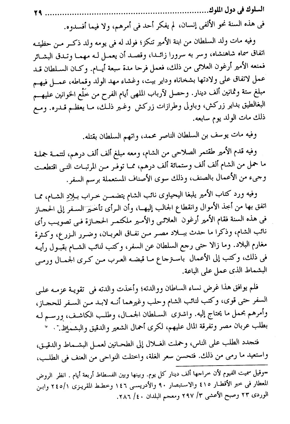 فِي هَذِه السّنة نَحْو الألفي انسان لم يفكر أحد فِي أَمرهم وَلَا فِيمَا أفسدوه. وَفِيه مَاتَ ولد السُّلْطَان من ابْنة الْأَمِير تنكز فولد لَهُ فِي يَوْمه ولد ذكر من حظيته اتِّفَاق سَمَّاهُ شاهنشاه وسر بِهِ سُرُورًا زَائِدا وَقصد أَن يعْمل لَهُ مهما وتدق البشائر فَمَنعه الْأَمِير أرغون العلائي من ذَلِك فَعمل فَرحا مُدَّة سَبْعَة أَيَّام. وَكَانَ السُّلْطَان قد عمل لِاتِّفَاق على وِلَادَتهَا بشخاناه وداير بَيت وغشاء مهد الْوَلَد وقماطه عمل فيهم مبلغ سِتَّة وَثَمَانِينَ ألف دِينَار. وَحصل لآرباب الملهى أَيَّام ألفرح من خلع الخوانين عَلَيْهِم البغالطيق بداير زركش وباولى وطرازات زركش وَغير ذَلِك مَا يعظم قدره. وَمَعَ ذَلِك مَاتَ الْوَلَد يَوْم سابعه. وَفِيه مَاتَ يُوسُف بن السُّلْطَان النَّاصِر مُحَمَّد واتهم السُّلْطَان بقتْله. وَفِيه قدم الْأَمِير طقتمر الصلاحي من الشَّام وَمَعَهُ مبلغ ألف ألف دِرْهَم لتتمة جملَة مَا حمل من الشَّام ألف ألف وسِتمِائَة ألف دِرْهَم مِمَّا توفر من المرتبات الَّتِي اقتطعت وَجِيء من الْأَعْمَال بالصنف وَذَلِكَ سوى الْأَصْنَاف المستعملة برسم السّفر. وَفِيه ورد كتاب الْأَمِير يلبغا اليحياوي نَائِب الشَّام يتَضَمَّن خراب بِلَاد الشَّام مِمَّا اتّفق بهَا من أَخذ الْأَمْوَال وَانْقِطَاع الجالب إِلَيْهَا وَأَن الرَّأْي تَأْخِير السّفر إِلَى الْحجاز فِي هَذِه السّنة فَقَامَ الْأَمِير أرغون العلائي والأمير ملكتمر الحجازة فِي تصويب رَأْي نَائِب الشَّام وذكرا مَا حدث بِبِلَاد مصر من نفاق العربان وضرر الزَّرْع وَكَثْرَة مغارم الْبِلَاد. وَمَا زَالا حَتَّى رَجَعَ السُّلْطَان عَن السّفر وَكتب لنائب الشَّام بِقبُول رَأْيه فِي ذَلِك وَكتب إِلَى الْأَعْمَال باسترجاع مَا قَبضه الْعَرَب من كرى الْجمال وَرمى البشماط الَّذِي عمل على الباعة. فَلم يُوَافق هَذَا غَرَض نسَاء الساطان ووالدته وَأخذت والدته فِي تَقْوِيَة عزمه على السّفر حَتَّى قوي وَكتب لنائب الشَّام وحلب وَغَيرهمَا أَنه لابد من السّفر للحجاز وَأمرهمْ بِحمْل مَا يحْتَاج إِلَيْهِ. وَاشْترى السُّلْطَان الْجمال وَطلب الكاشف ورسم لَهُ عربان مصر وتفرقة المَال عَلَيْهِم لكرى أحمال الشّعير والدقيق والبشماط. فتجدد الطّلب على النَّاس وحملت الغلال إِلَى الطحانين لعمل البشماط والدقيق واستعيد مَا رمي من دلك. فتحسن سعر الْغلَّة واختلت النواحي من العنف فِي الطّلب